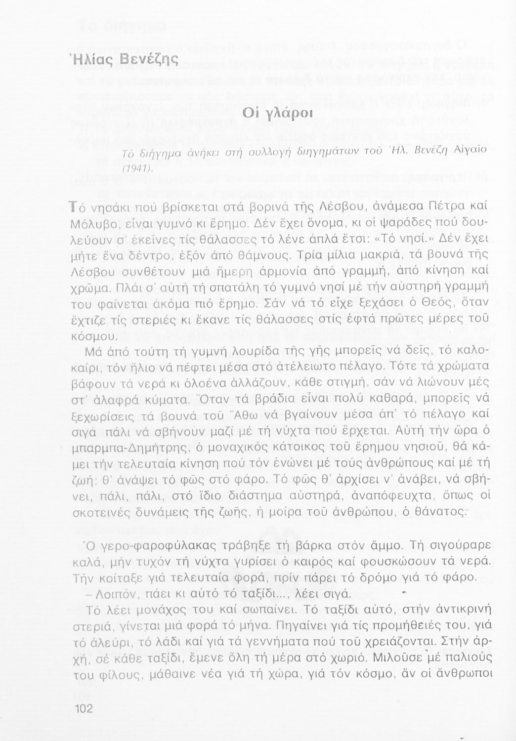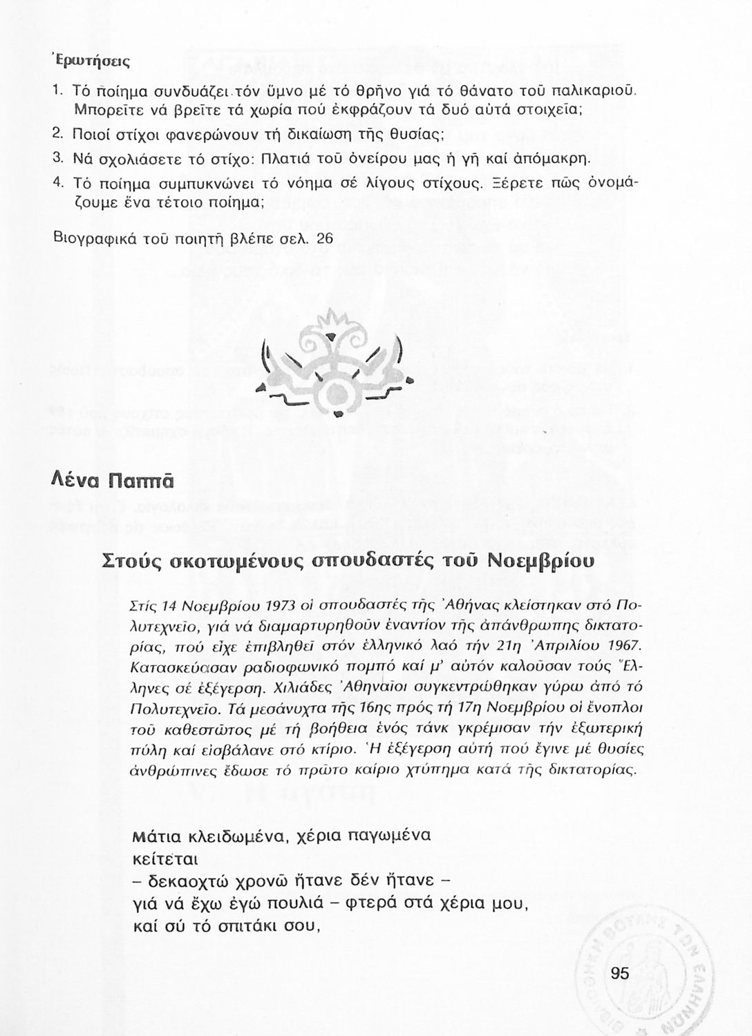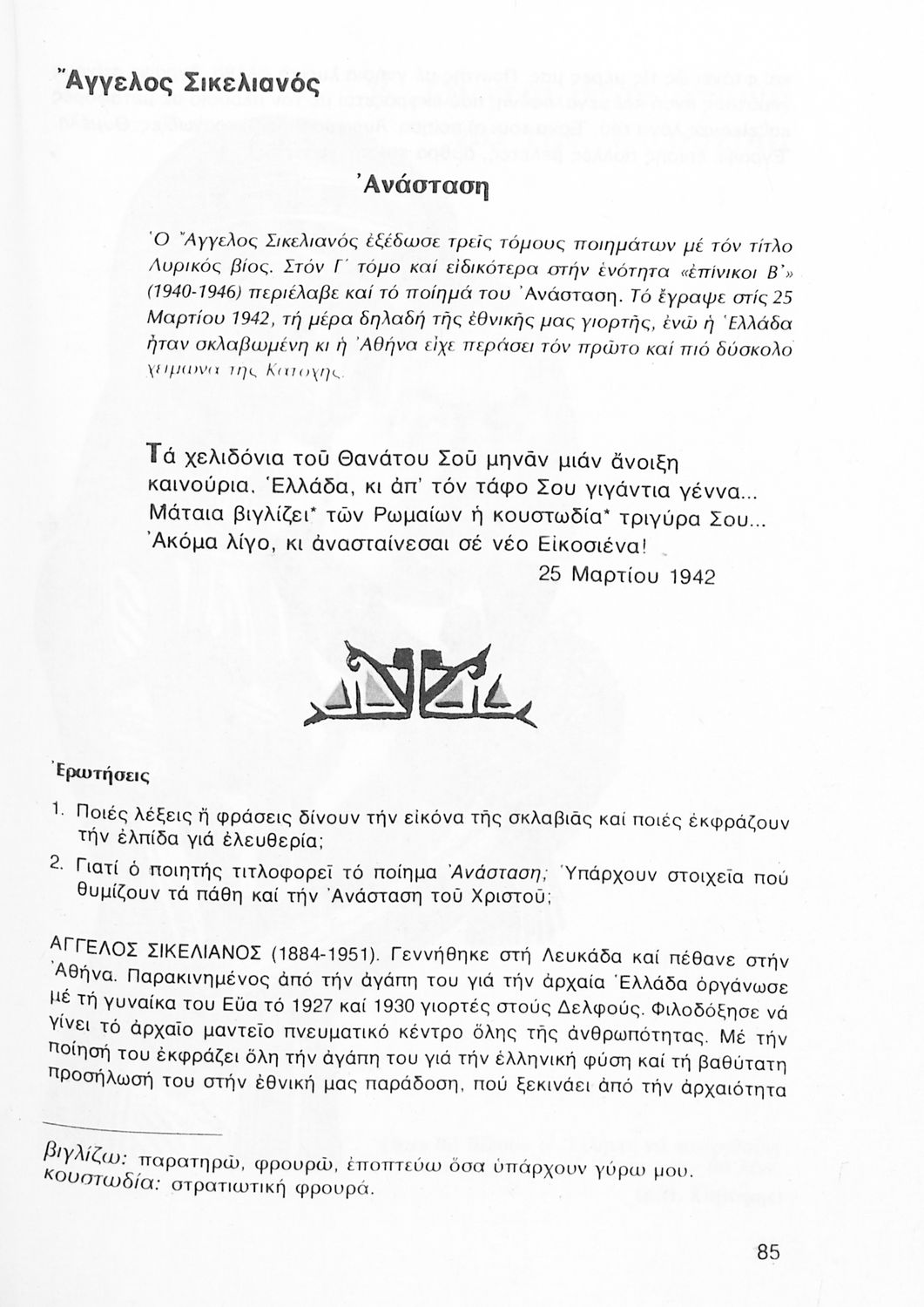 Σχολικό εγχειρίδιο Νέων Ελληνικών Β' Γυμνασίου που περιέχει δημοτικά τραγούδια, πεζά, δοκίμια και ποιήματα σύγχρονων Ελλήνων συγγραφέων και είναι χωρισμένο σε θεματικές ενότητες όπως η πόλη και η ύπαιθρος, η εποχή του 40' και η κατοχή, η θρησκευτική ζωή, ο καημός της ξενιτιάς, ο ελληνισμός έξω από τα σύνορα, οι αγώνες Ακριτών-Κλεφτών κ.α. Περιλαμβάνει και έργα ευρωπαίων λογοτεχνών.