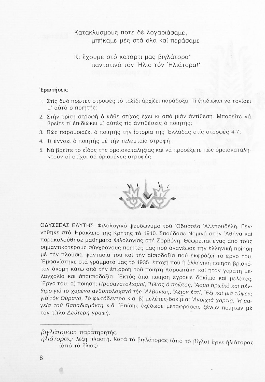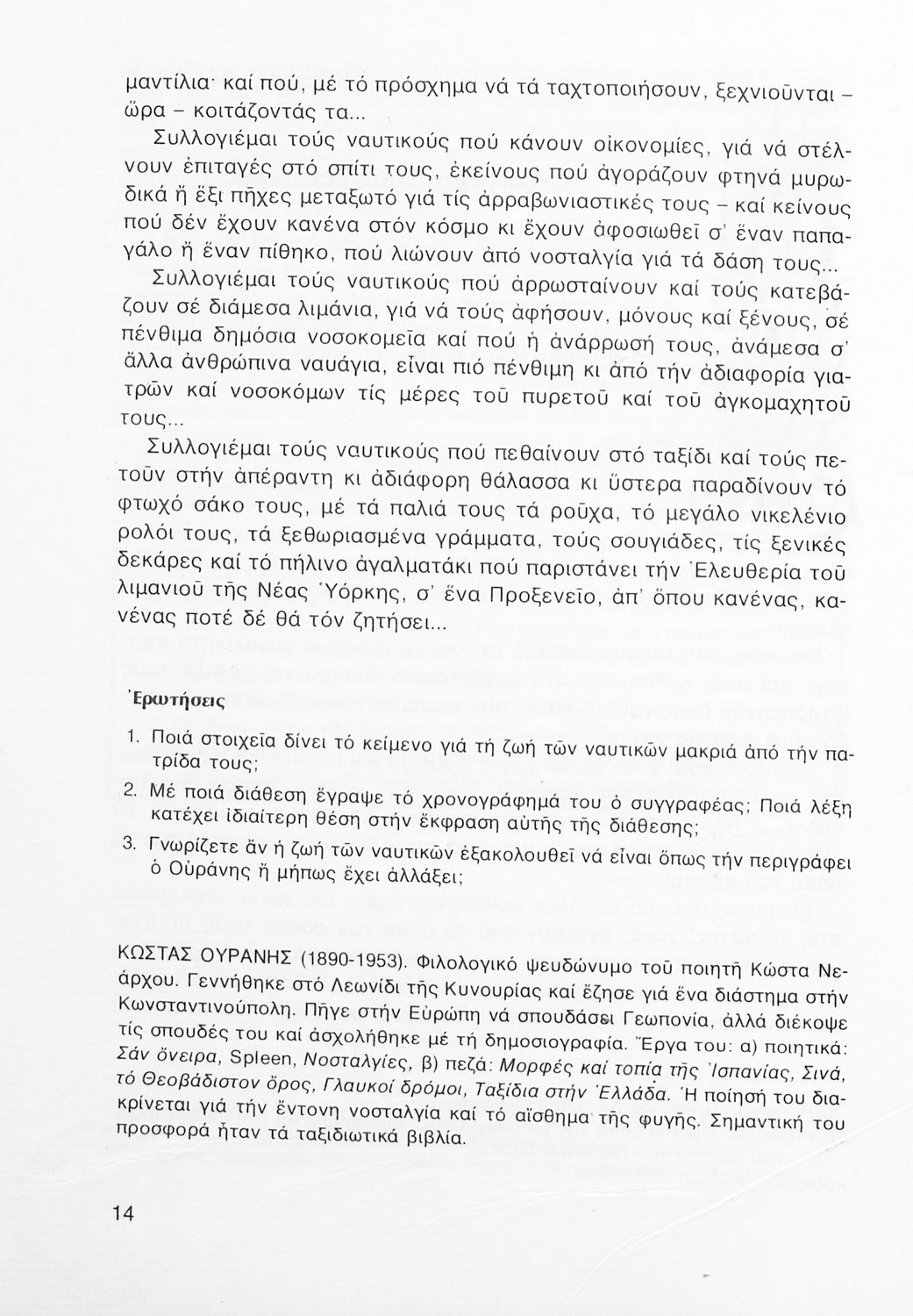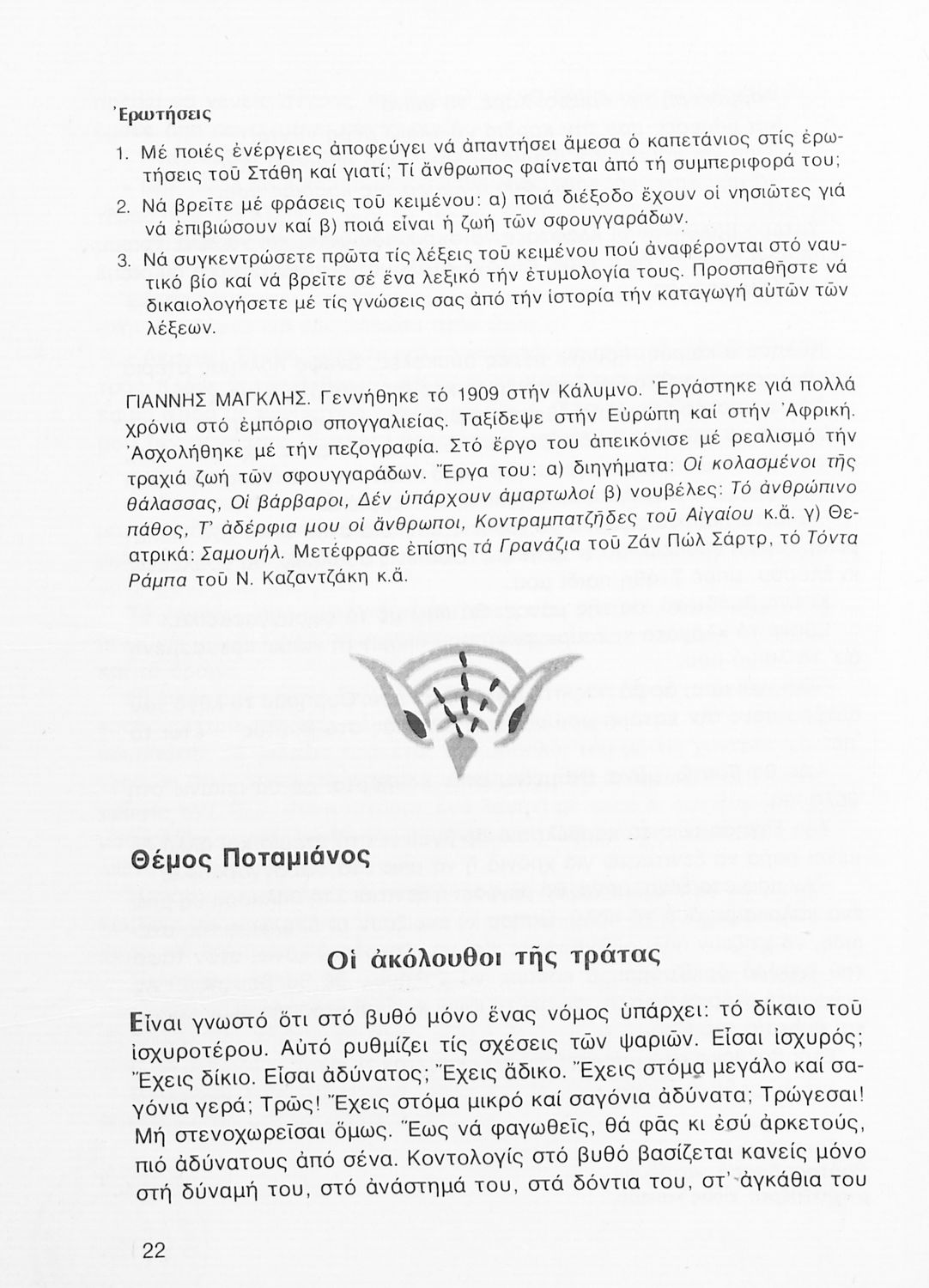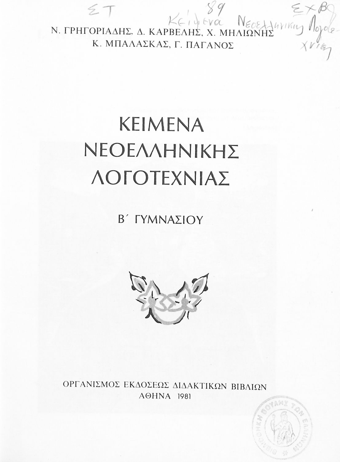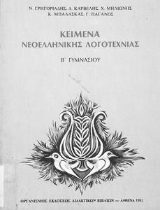 Σχολικό εγχειρίδιο Νέων Ελληνικών Β' Γυμνασίου που περιέχει δημοτικά τραγούδια, πεζά, δοκίμια και ποιήματα σύγχρονων Ελλήνων συγγραφέων και είναι χωρισμένο σε θεματικές ενότητες όπως η πόλη και η ύπαιθρος, η εποχή του 40' και η κατοχή, η θρησκευτική ζωή, ο καημός της ξενιτιάς, ο ελληνισμός έξω από τα σύνορα, οι αγώνες Ακριτών-Κλεφτών κ.α. Περιλαμβάνει και έργα ευρωπαίων λογοτεχνών.