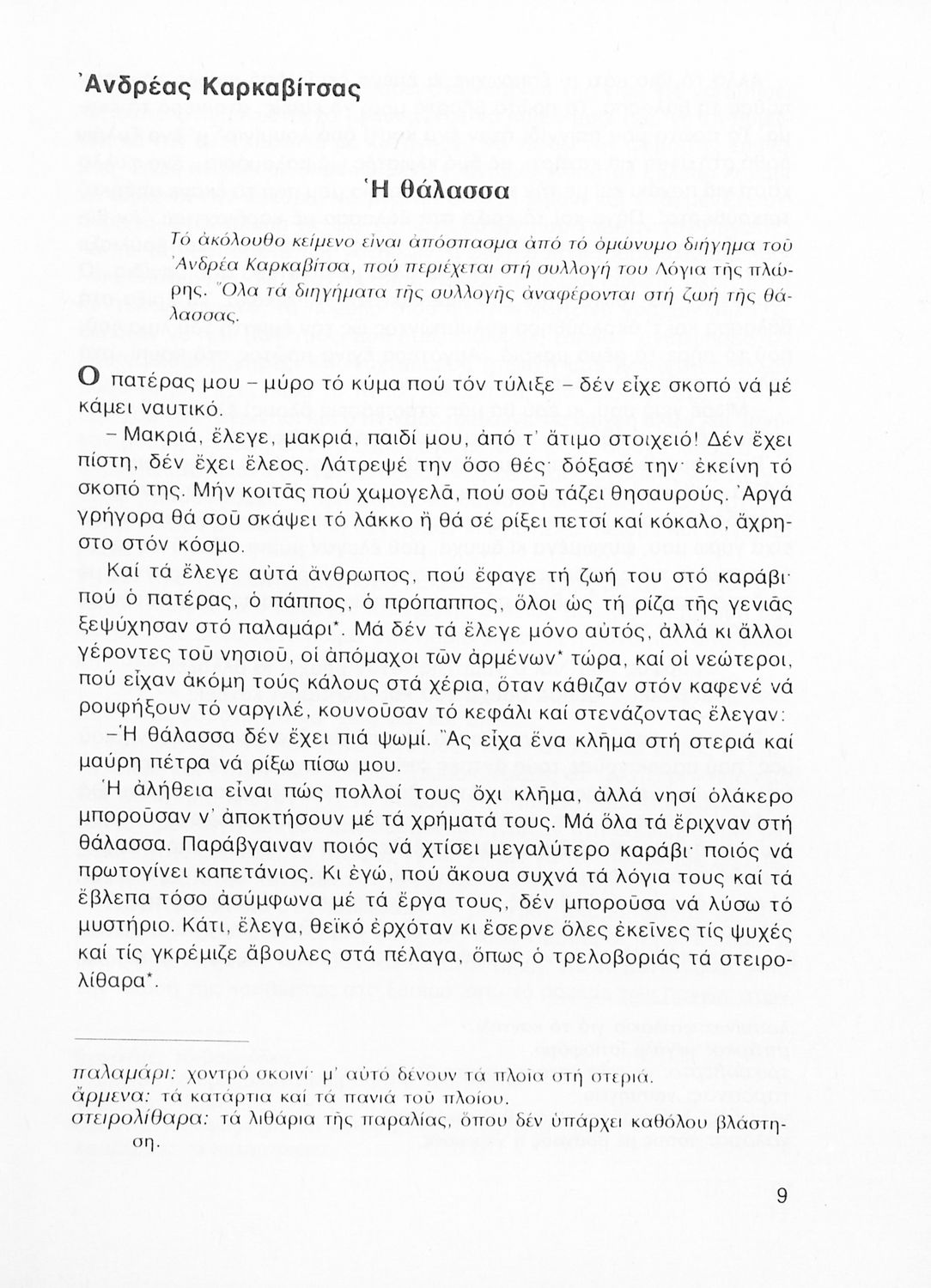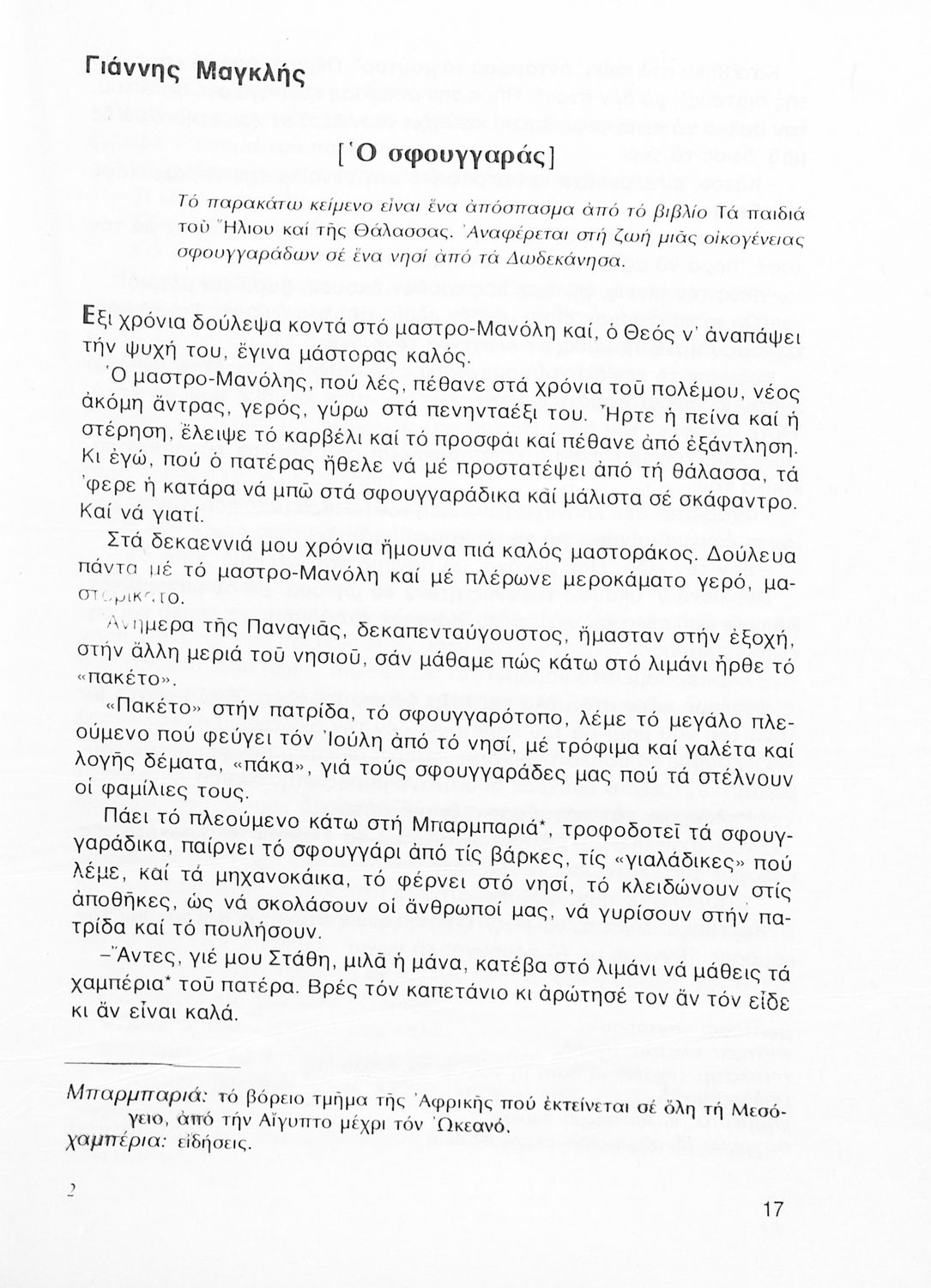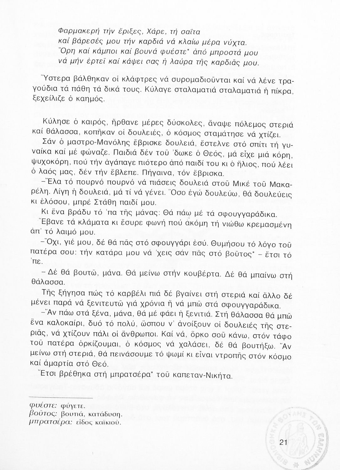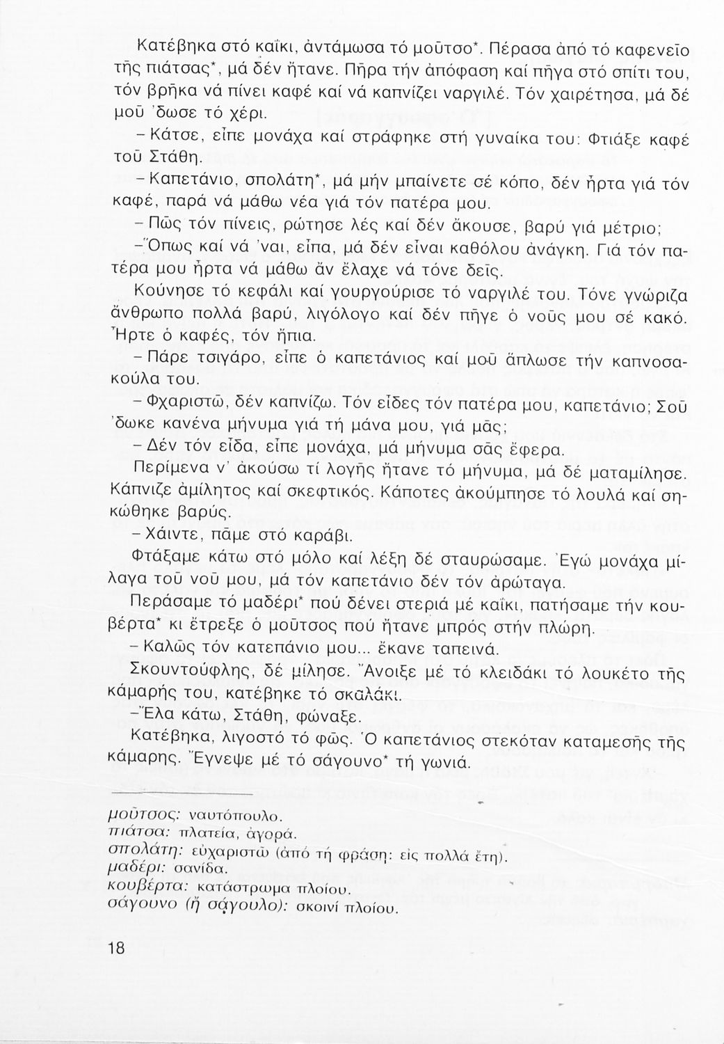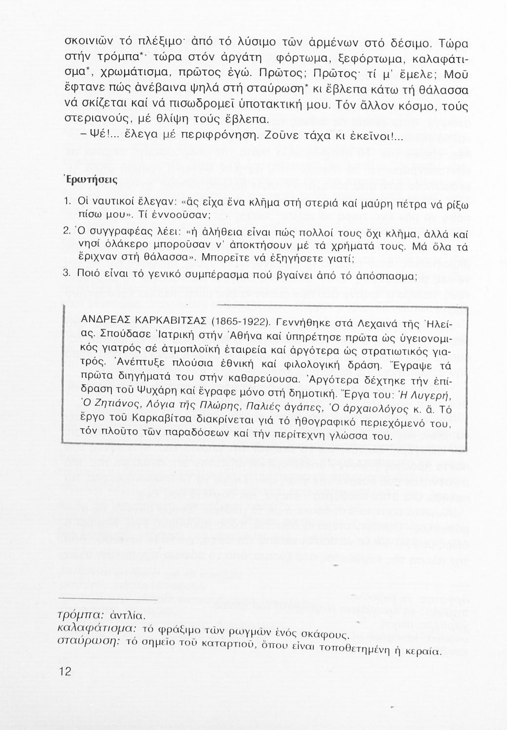 Σχολικό εγχειρίδιο Νέων Ελληνικών Β' Γυμνασίου που περιέχει δημοτικά τραγούδια, πεζά, δοκίμια και ποιήματα σύγχρονων Ελλήνων συγγραφέων και είναι χωρισμένο σε θεματικές ενότητες όπως η πόλη και η ύπαιθρος, η εποχή του 40' και η κατοχή, η θρησκευτική ζωή, ο καημός της ξενιτιάς, ο ελληνισμός έξω από τα σύνορα, οι αγώνες Ακριτών-Κλεφτών κ.α. Περιλαμβάνει και έργα ευρωπαίων λογοτεχνών.