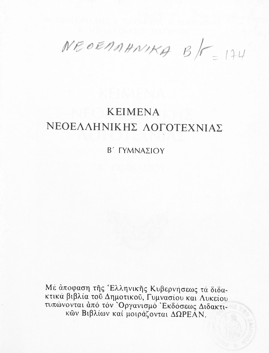 Βαθμίδα εκπαίδευσης: Δευτεροβάθμια Τάξη: Β' Γυμνασίου Μάθημα: Νέα Ελληνικά Γλώσσα: Δημοτική Παρουσίαση περιεχομένου: Σχολικό εγχειρίδιο Νέων Ελληνικών Β' Γυμνασίου που περιέχει δημοτικά τραγούδια, πεζά, δοκίμια και ποιήματα σύγχρονων Ελλήνων συγγραφέων και είναι χωρισμένο σε θεματικές ενότητες όπως η πόλη και η ύπαιθρος, η εποχή του 40' και η κατοχή, η θρησκευτική ζωή, ο καημός της ξενιτιάς, ο ελληνισμός έξω από τα σύνορα, οι αγώνες Ακριτών-Κλεφτών κ.α. Περιλαμβάνει και έργα ευρωπαίων λογοτεχνών. |