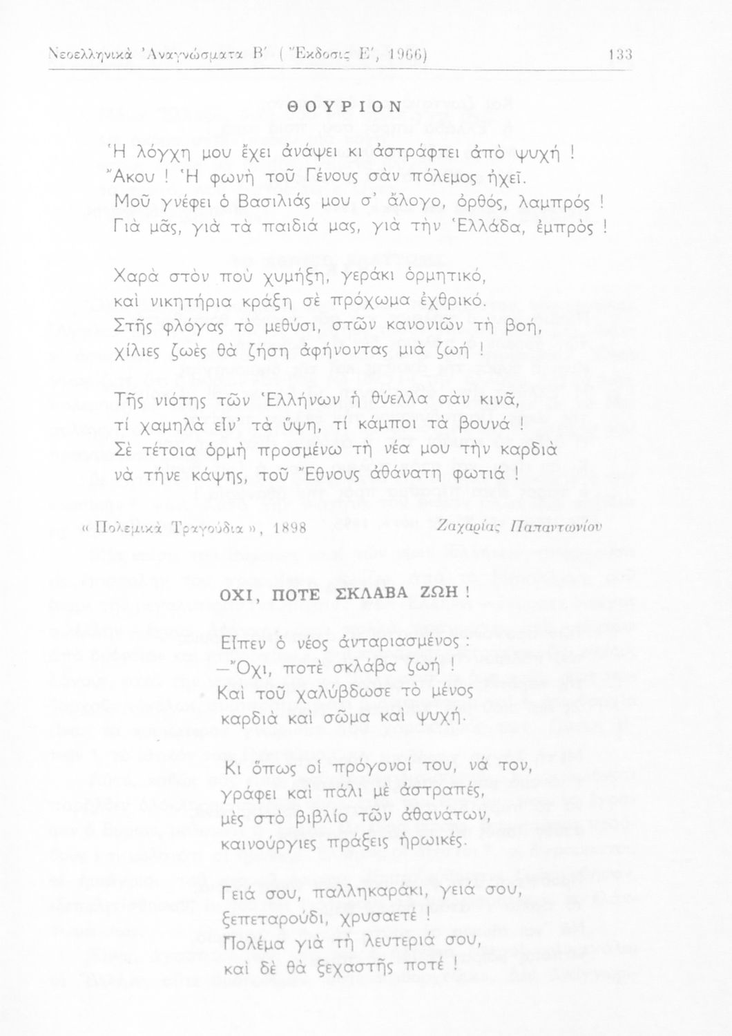 Σχολικό εγχειρίδιο Νέων Ελληνικών Β΄ Εξατάξιου Γυμνασίου που περιλαμβάνει ποιήματα και πεζά Ελλήνων συγγραφέων και δημοτικά τραγούδια εμπνευσμένα από την σύγχρονη ελληνική ιστορία, τη βυζαντινή ιστορία, την ...