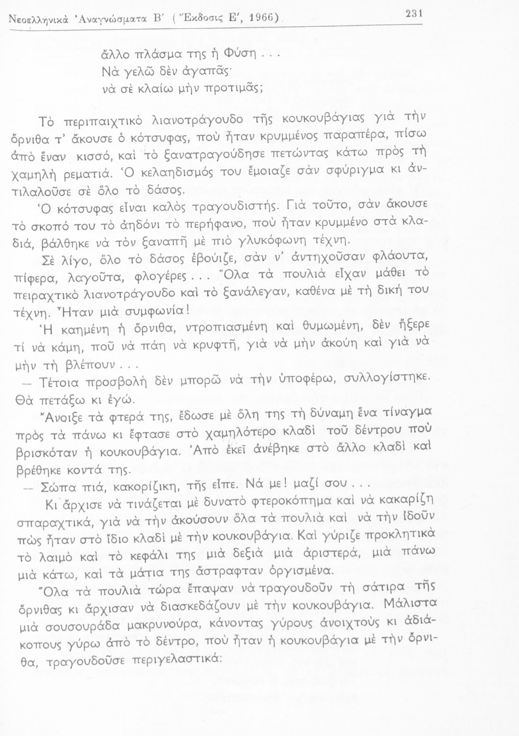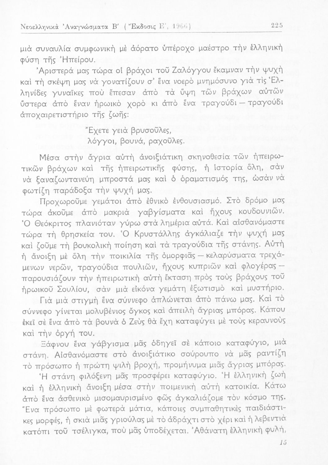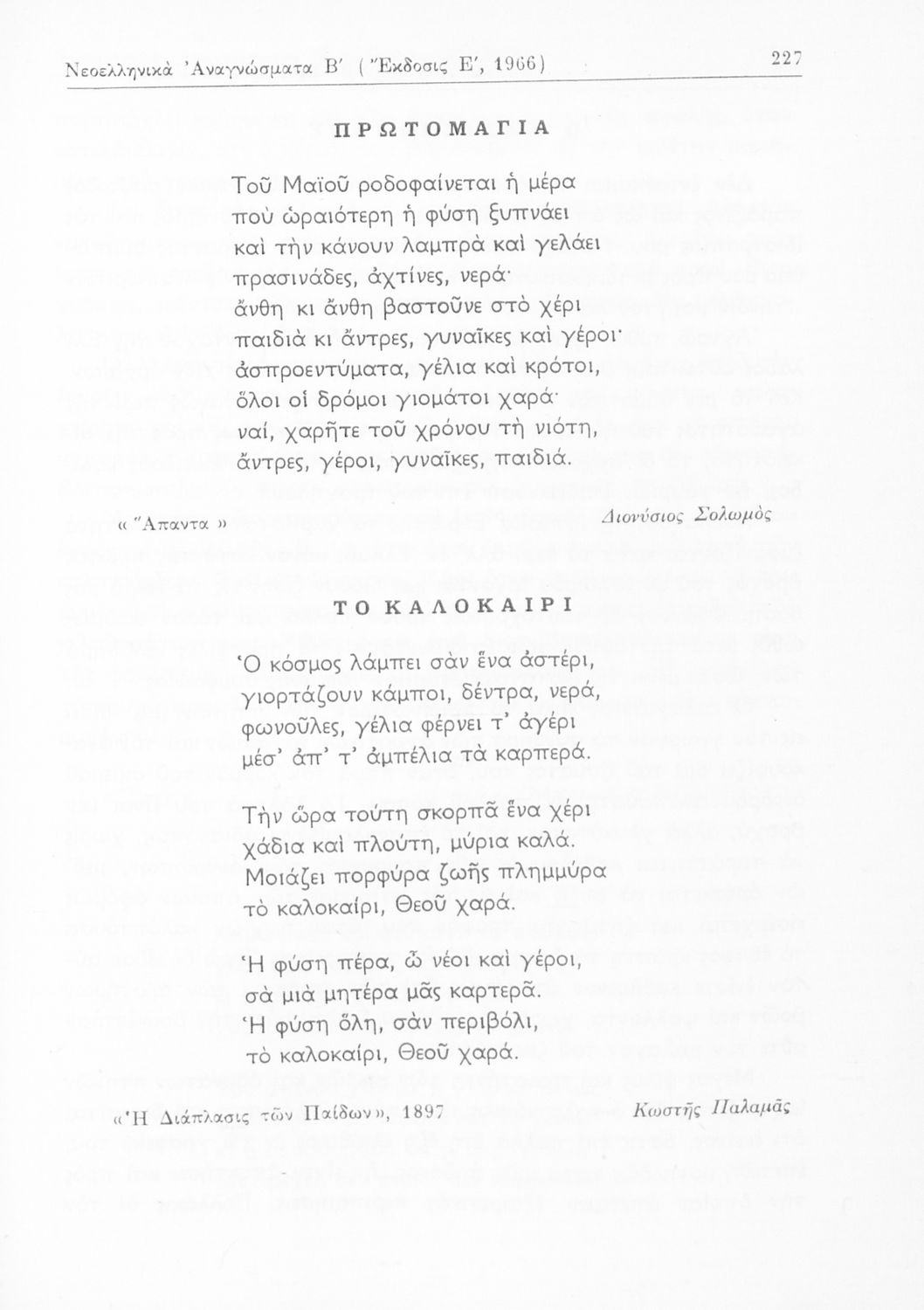 Σχολικό εγχειρίδιο Νέων Ελληνικών Β' Γυμνασίου που περιέχει ποιήματα και πεζά Ελλήνων συγγραφέων εμπνευσμένα από τη θρησκευτική, εθνική, οικογενειακή και κοινωνική ζωή και την ελληνική φύση. Περιέχει παράρτημα
