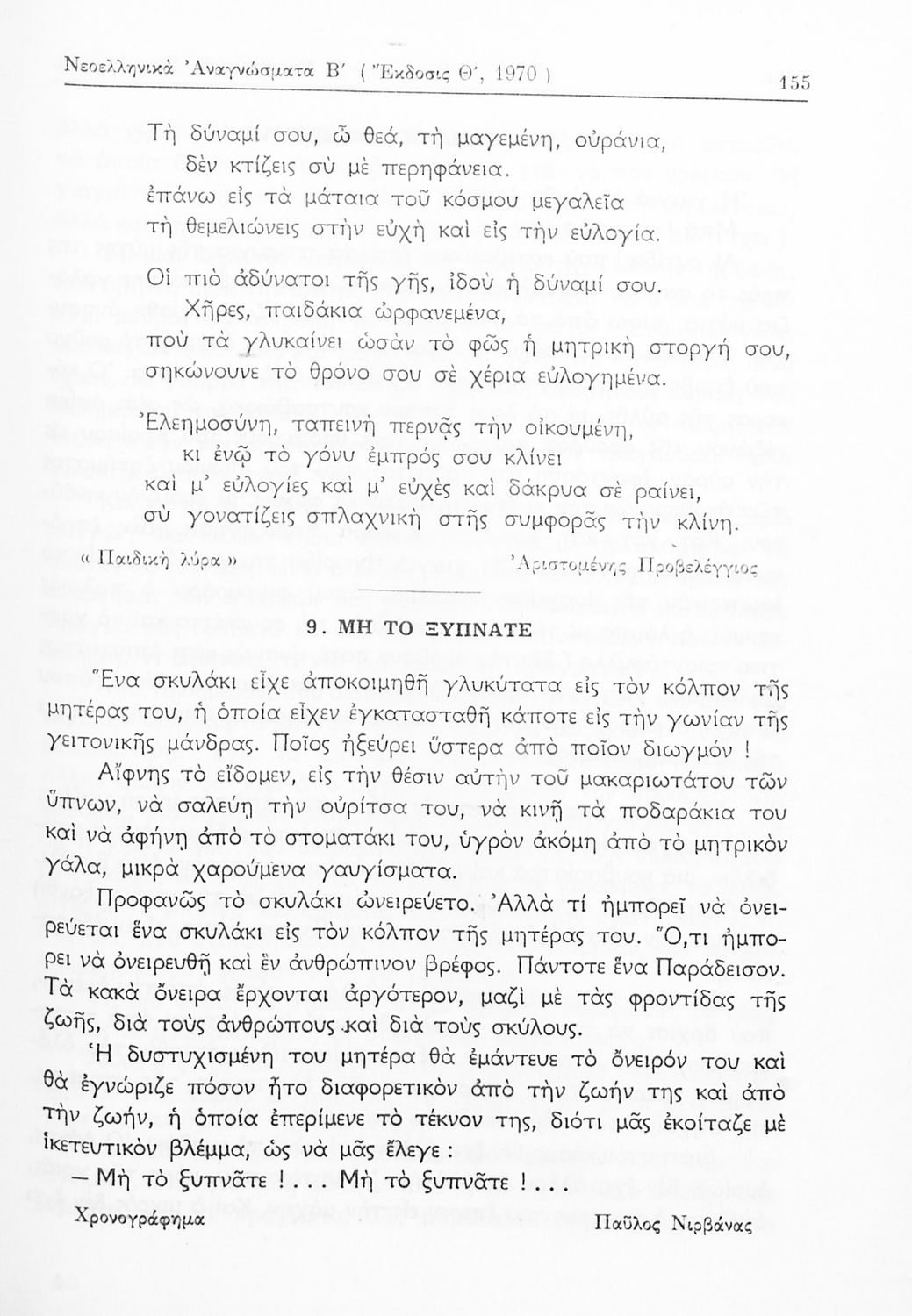 Σχολικό εγχειρίδιο Νέων Ελληνικών Β' Γυμνασίου που περιέχει ποιήματα και πεζά Ελλήνων συγγραφέων εμπνευσμένα από τη θρησκευτική, εθνική, οικογενειακή και κοινωνική ζωή και την ελληνική φύση. Περιέχει παράρτημα με βιογραφίες των συγγραφέων και λεξιλόγιο. Φέρει το σύμβολο της δικτατορίας.