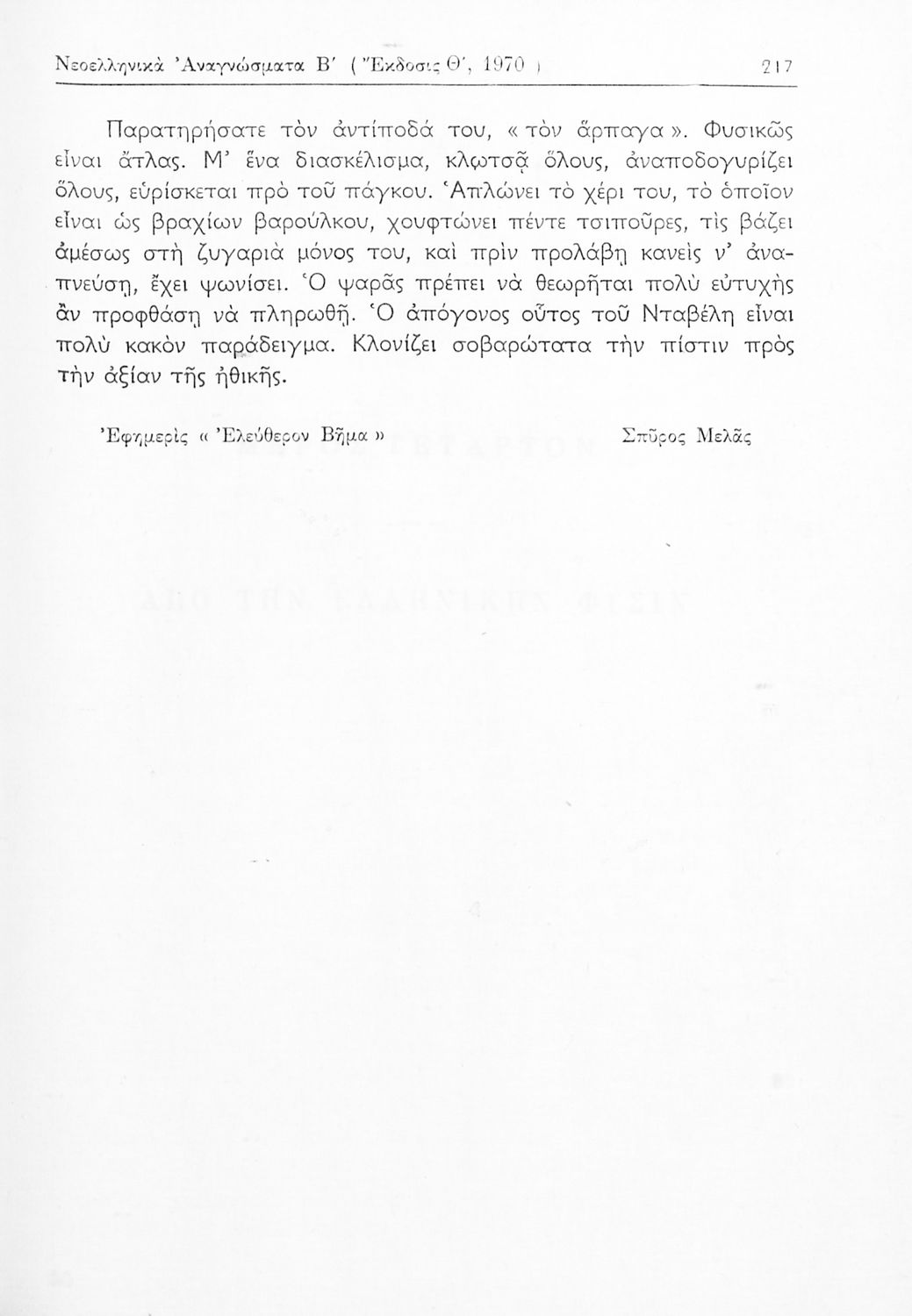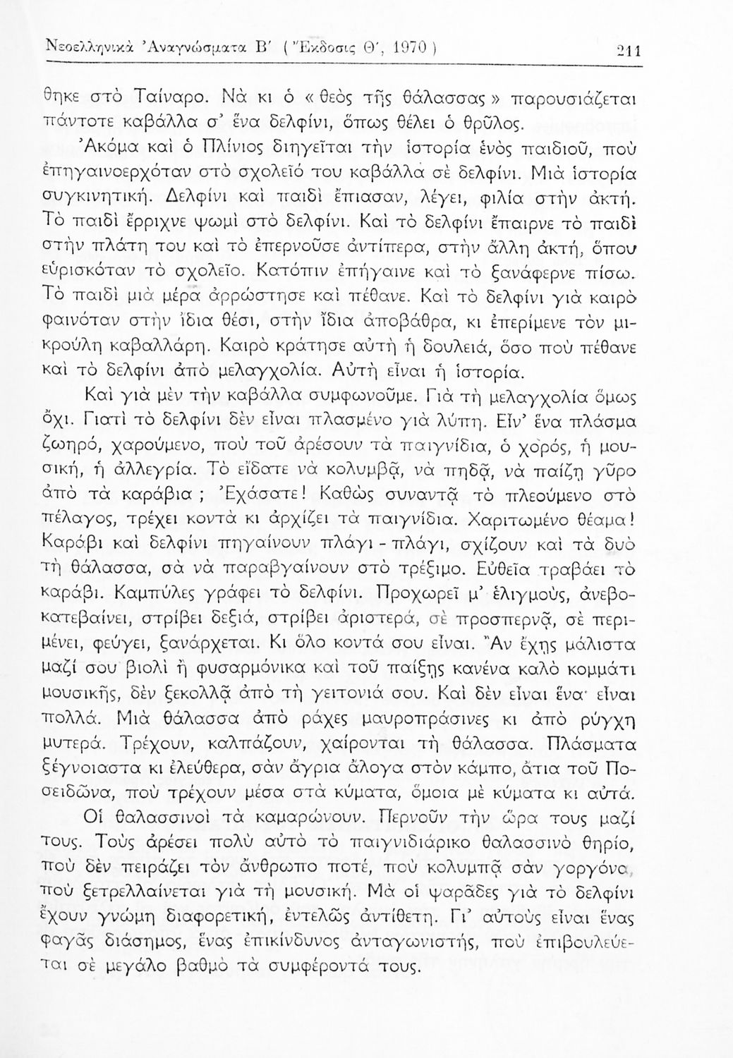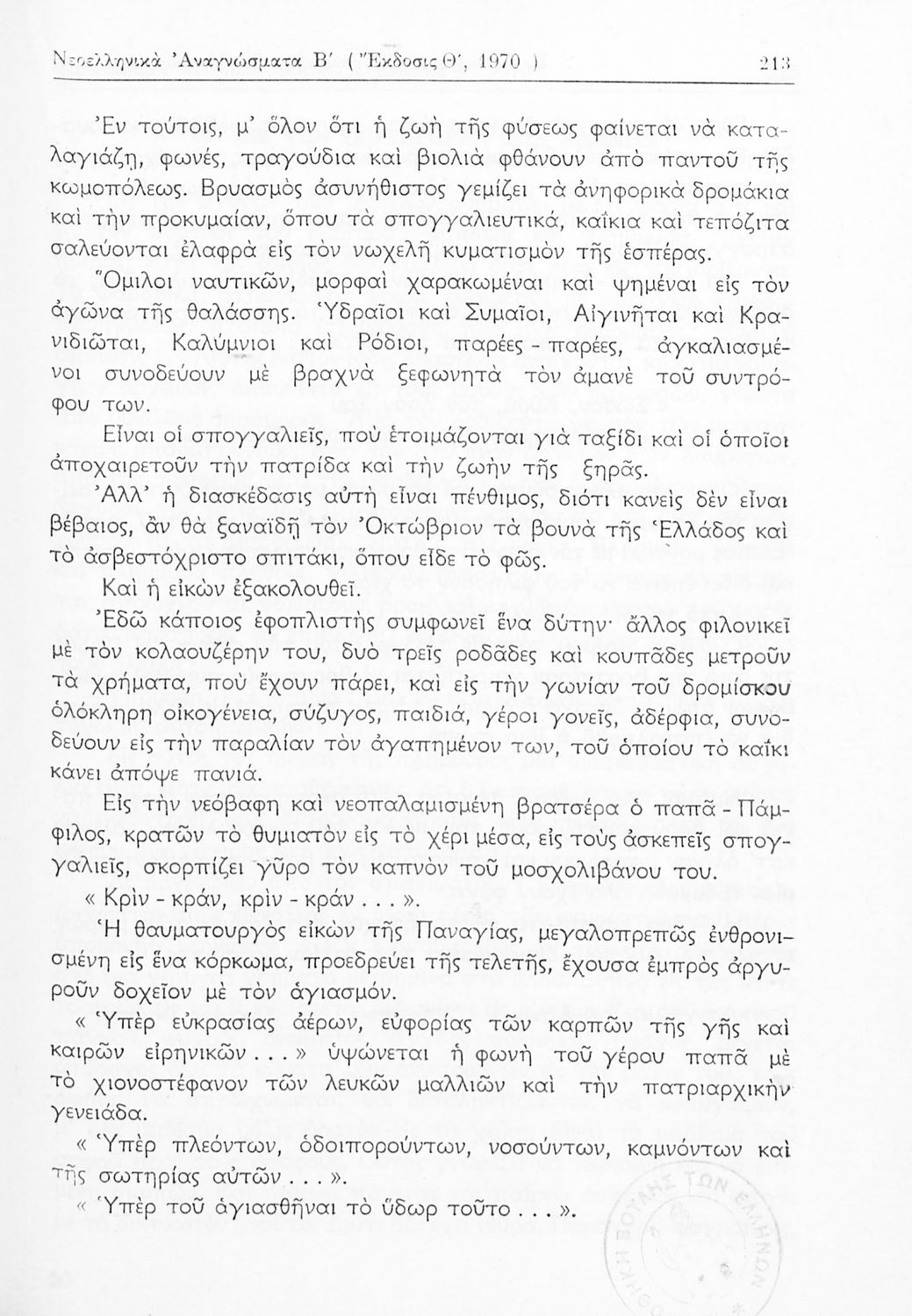 Σχολικό εγχειρίδιο Νέων Ελληνικών Β' Γυμνασίου που περιέχει ποιήματα και πεζά Ελλήνων συγγραφέων εμπνευσμένα από τη θρησκευτική, εθνική, οικογενειακή και κοινωνική ζωή και την ελληνική φύση. Περιέχει παράρτημα με βιογραφίες των συγγραφέων και λεξιλόγιο. Φέρει το σύμβολο της δικτατορίας.