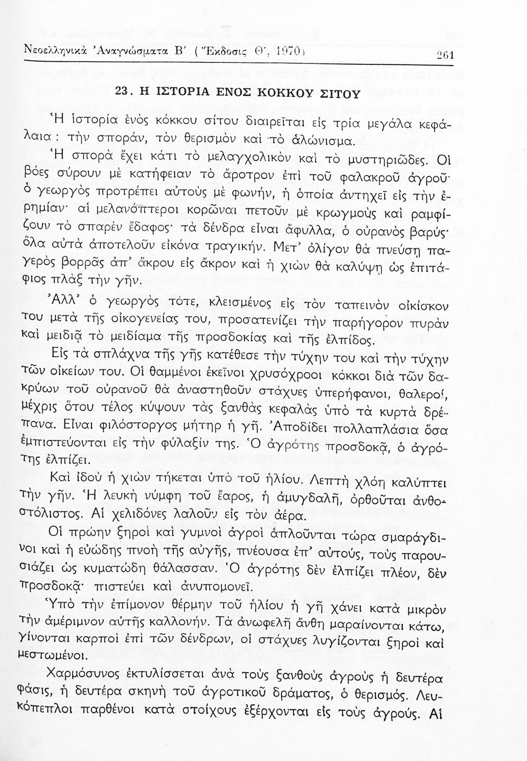 Σχολικό εγχειρίδιο Νέων Ελληνικών Δ΄ Γυμνασίου και Β΄ Αστικού Σχολείου που περιέχει πεζά και ποιήματα Ελλήνων συγγραφέων εμπνευσμένα από τη θρησκευτική και κοινωνική ζωή, την ελληνική μυθολογία, την αρχαία και