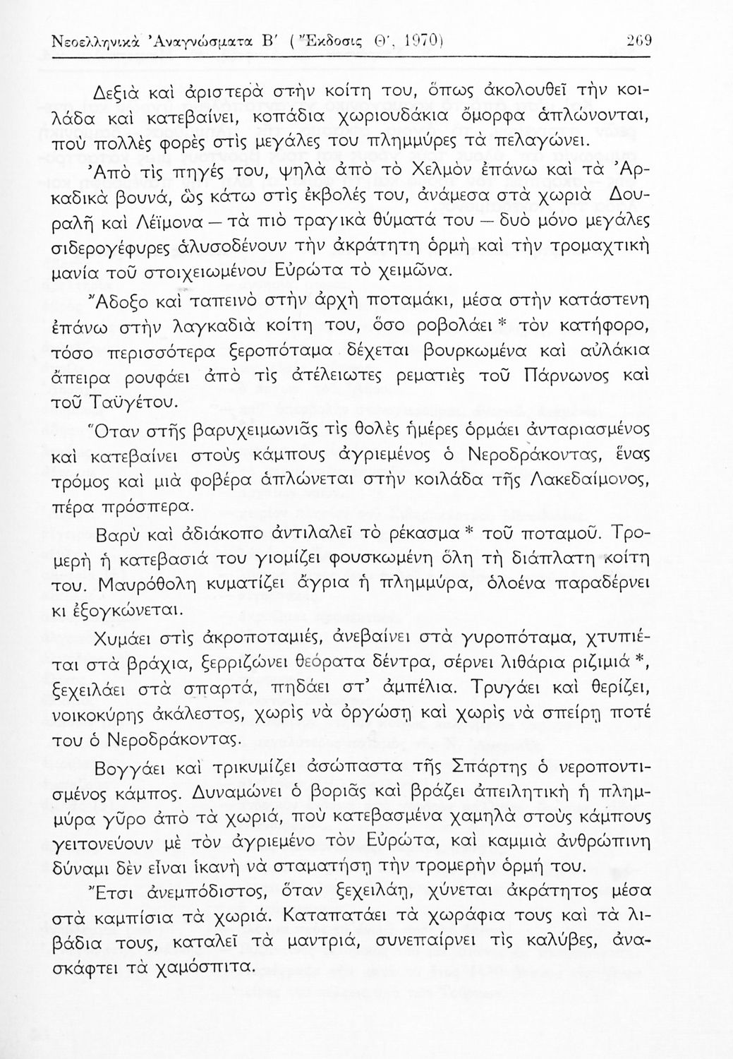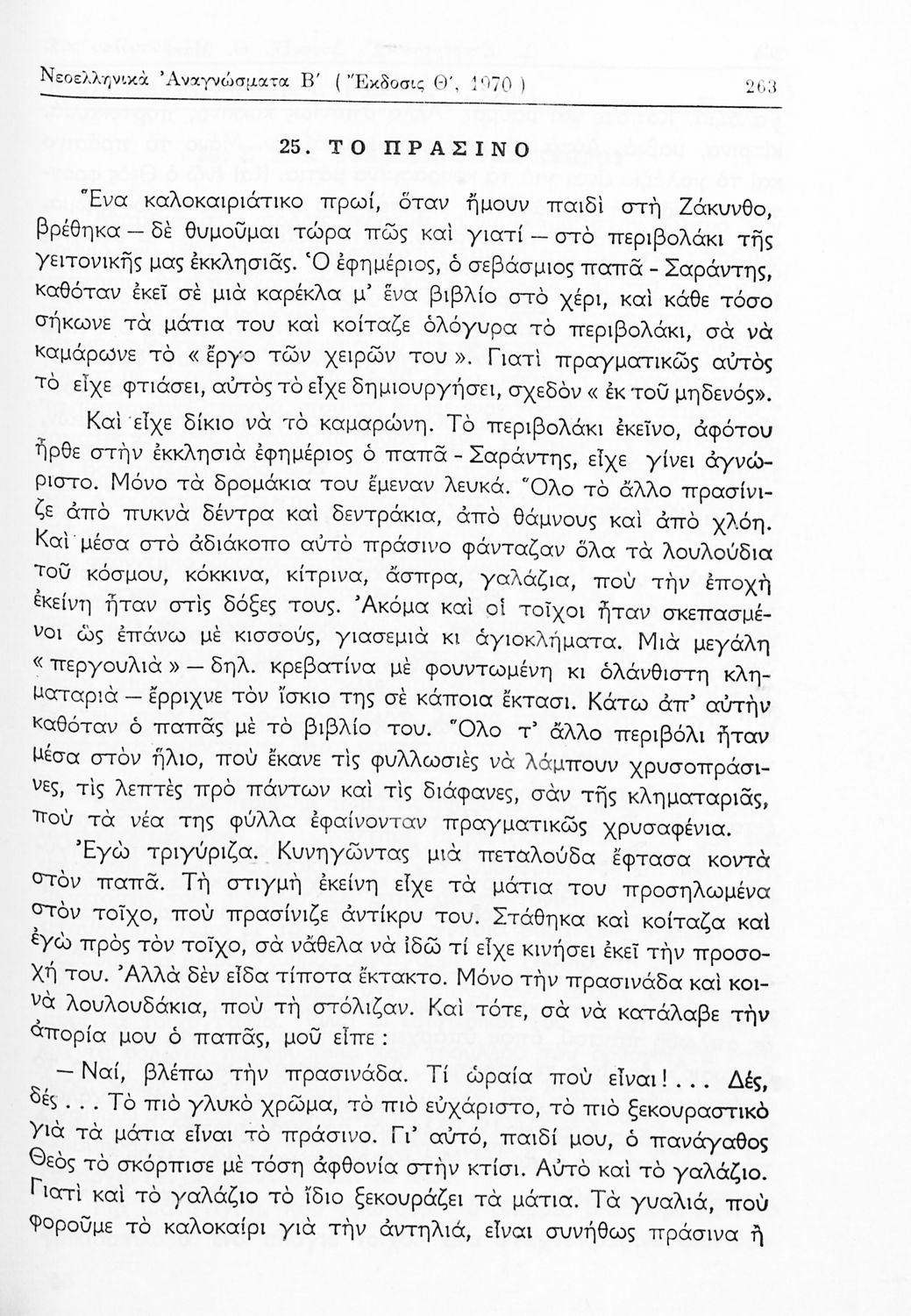 Σχολικό εγχειρίδιο Νέων Ελληνικών Β' Γυμνασίου που περιέχει ποιήματα και πεζά Ελλήνων συγγραφέων εμπνευσμένα από τη θρησκευτική, εθνική, οικογενειακή και κοινωνική ζωή και την ελληνική φύση. Περιέχει παράρτημα με βιογραφίες των συγγραφέων και λεξιλόγιο. Φέρει το σύμβολο της δικτατορίας.