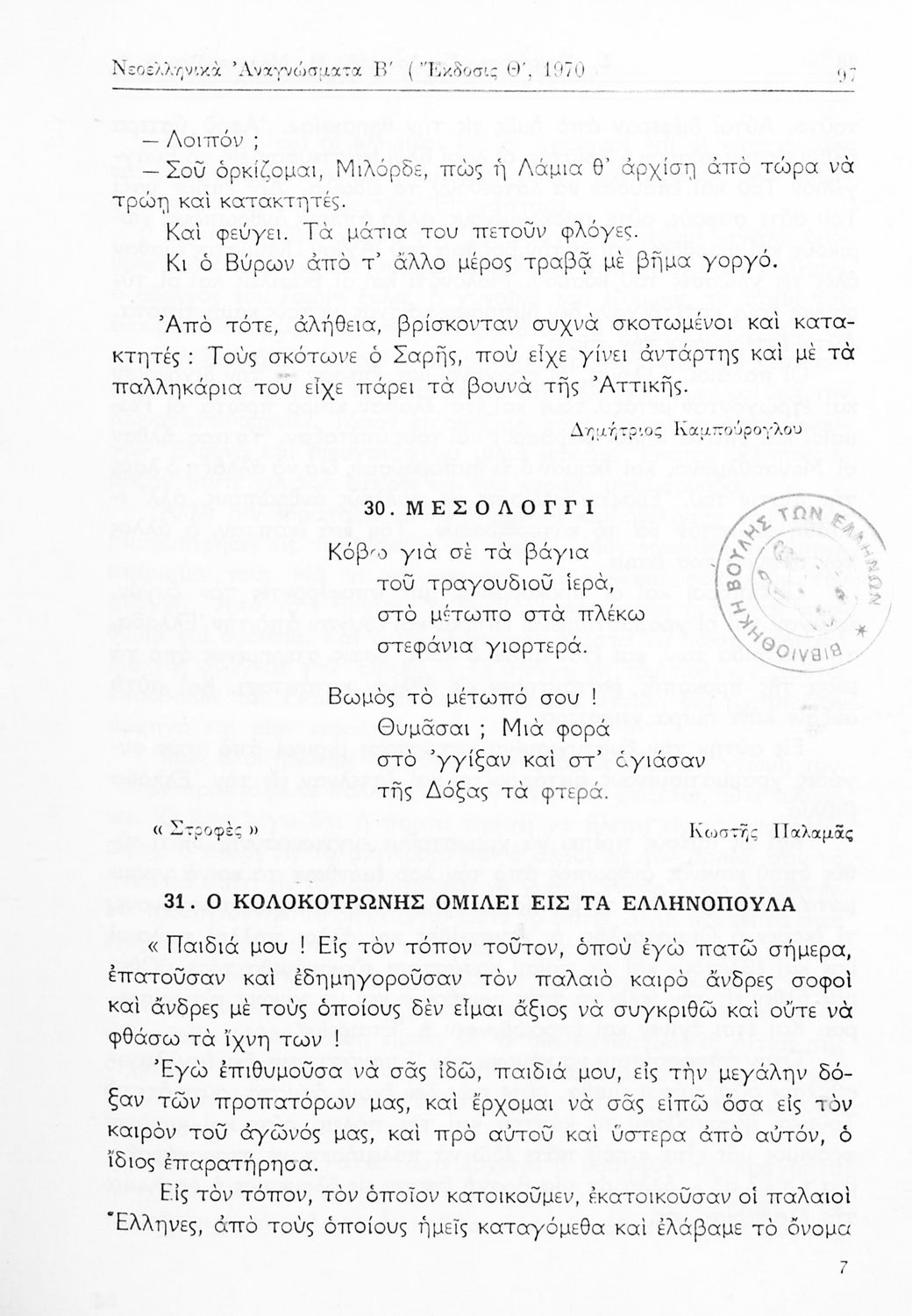 Σχολικό εγχειρίδιο Νέων Ελληνικών Β΄ Γυμνασίου που περιλαμβάνει ποιήματα και πεζά Ελλήνων συγγραφέων και δημοτικά τραγούδια εμπνευσμένα από την σύγχρονη ελληνική ιστορία, τη βυζαντινή ιστορία, την ελληνική ...