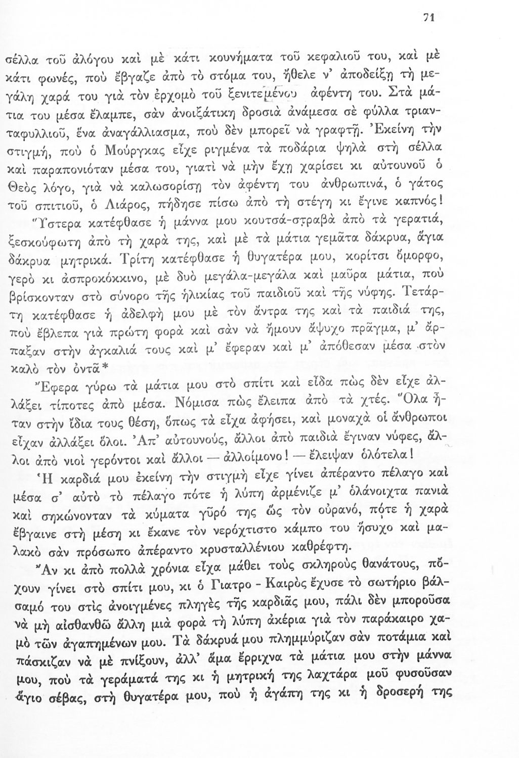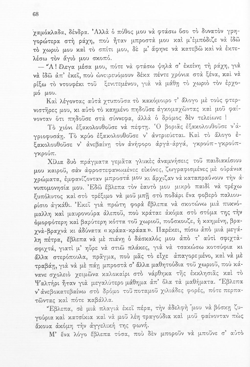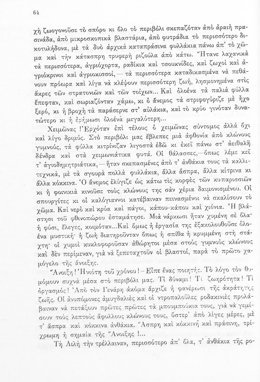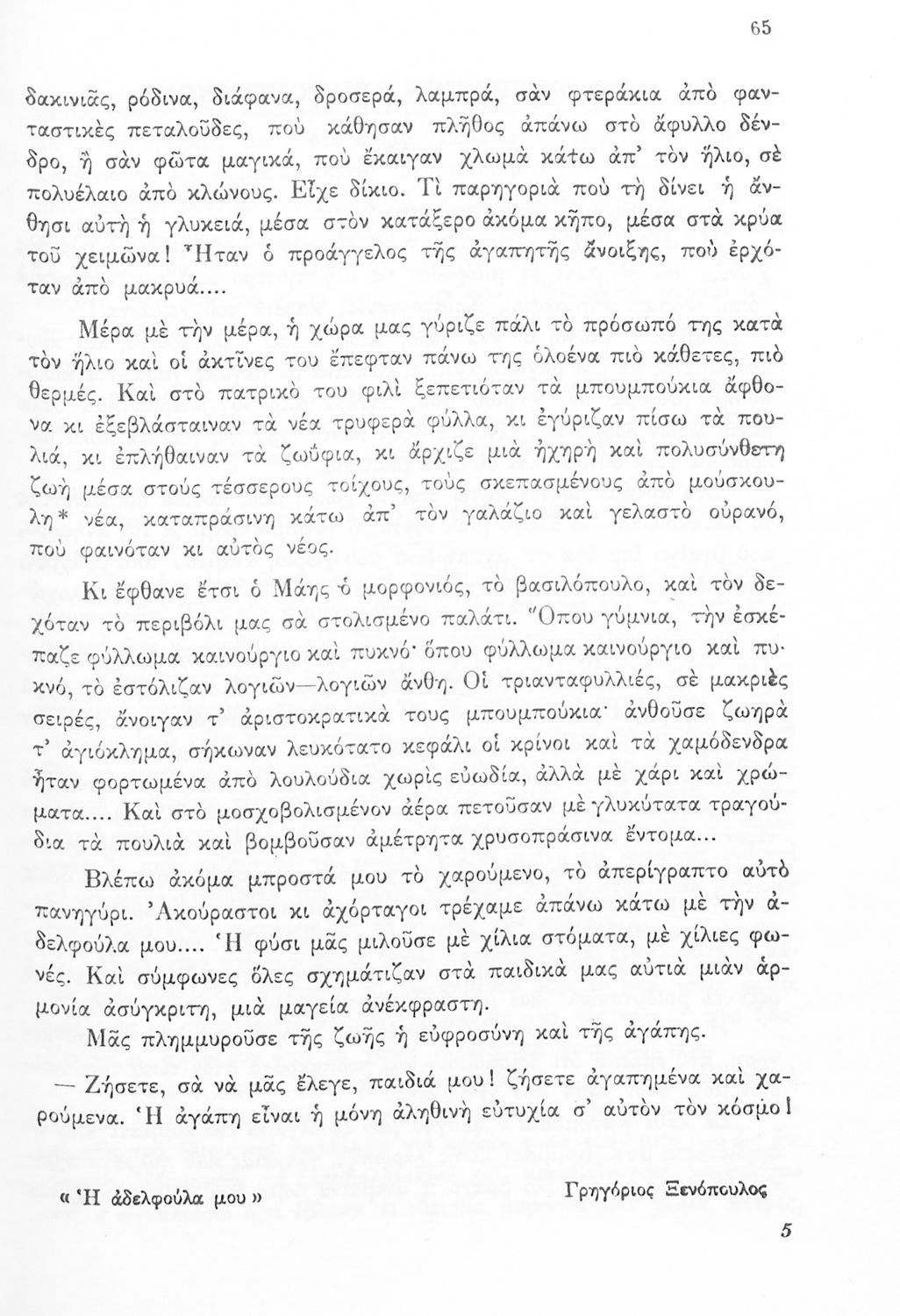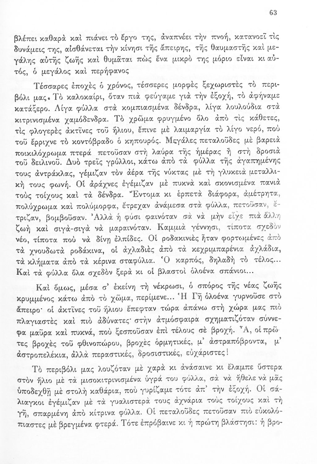 Σχολικό εγχειρίδιο Νέων Ελληνικών Γ' Γυμνασίου που περιλαμβάνει πεζά και ποιήματα Ελλήνων συγγραφέων εμπνευσμένα από την οικογενειακή και θρησκευτική ζωή, την σύγχρονη ελληνική ιστορία και τη φύση. Περιέχει παράρτημα με βιογραφίες των συγγραφέων και λεξιλόγιο. Φέρει το σύμβολο της δικτατορίας.