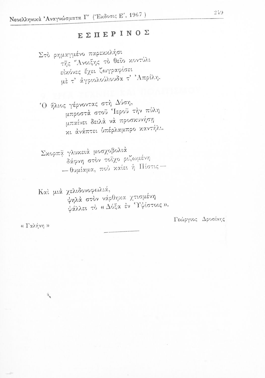 Σχολικό εγχειρίδιο Νέων Ελληνικών Γ' Γυμνασίου που περιέχει ποιήματα και πεζά Ελλήνων συγγραφέων εμπνευσμένα από τη θρησκευτική, οικογενειακή και κοινωνική ζωή, την σύγχρονή ελληνική ιστορία και την ελληνική φύση. Περιέχει παράρτημα με βιογραφίες των συγγραφέων και λεξιλόγιο.