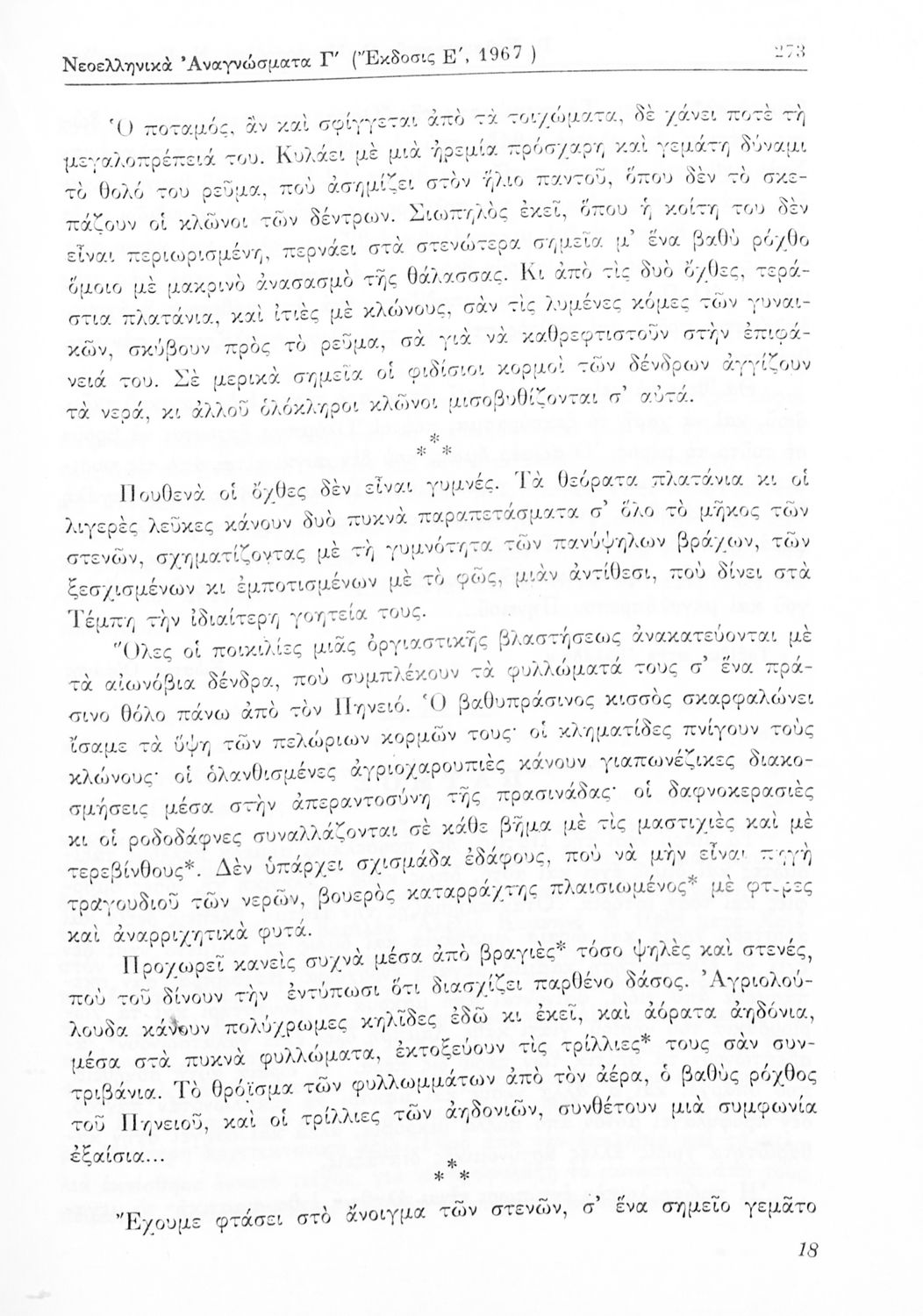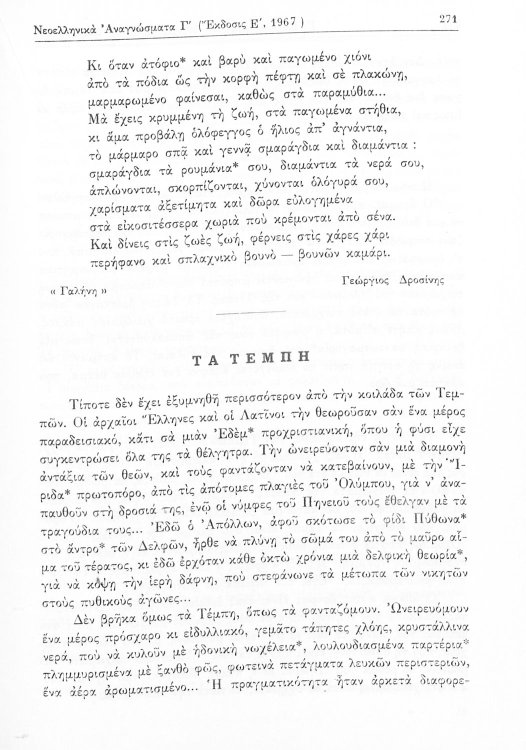 Σχολικό εγχειρίδιο Νέων Ελληνικών Γ' Γυμνασίου που περιέχει ποιήματα και πεζά Ελλήνων συγγραφέων εμπνευσμένα από τη θρησκευτική, οικογενειακή και κοινωνική ζωή, την σύγχρονή ελληνική ιστορία και την ελληνική φύση. Περιέχει παράρτημα με βιογραφίες των συγγραφέων και λεξιλόγιο.