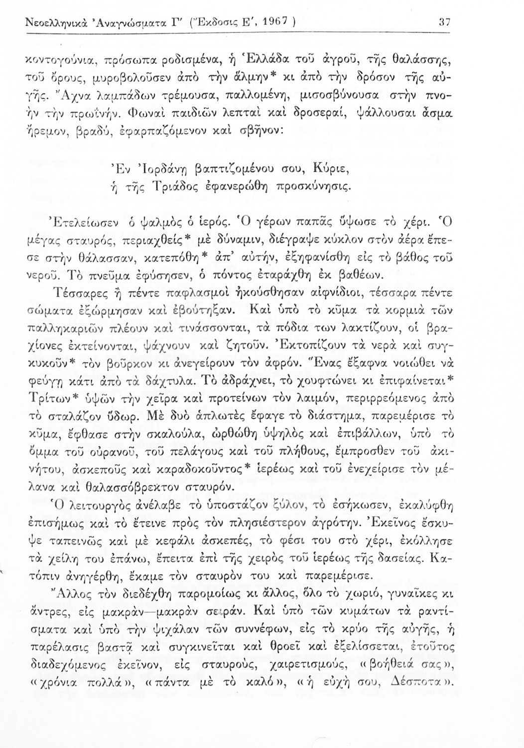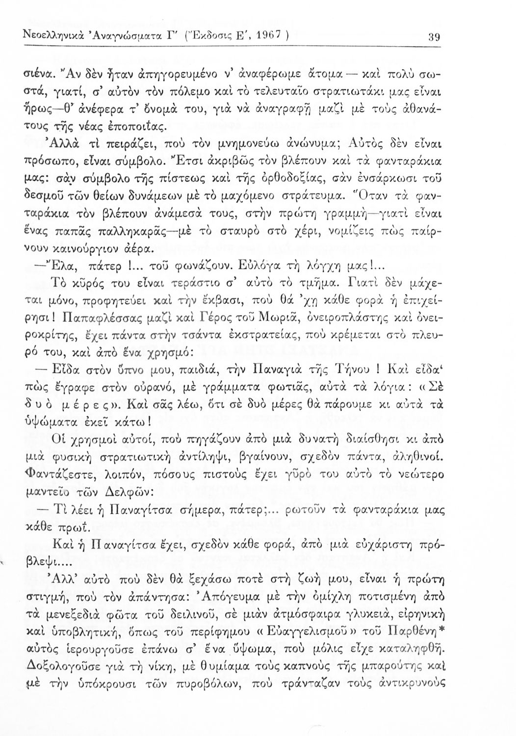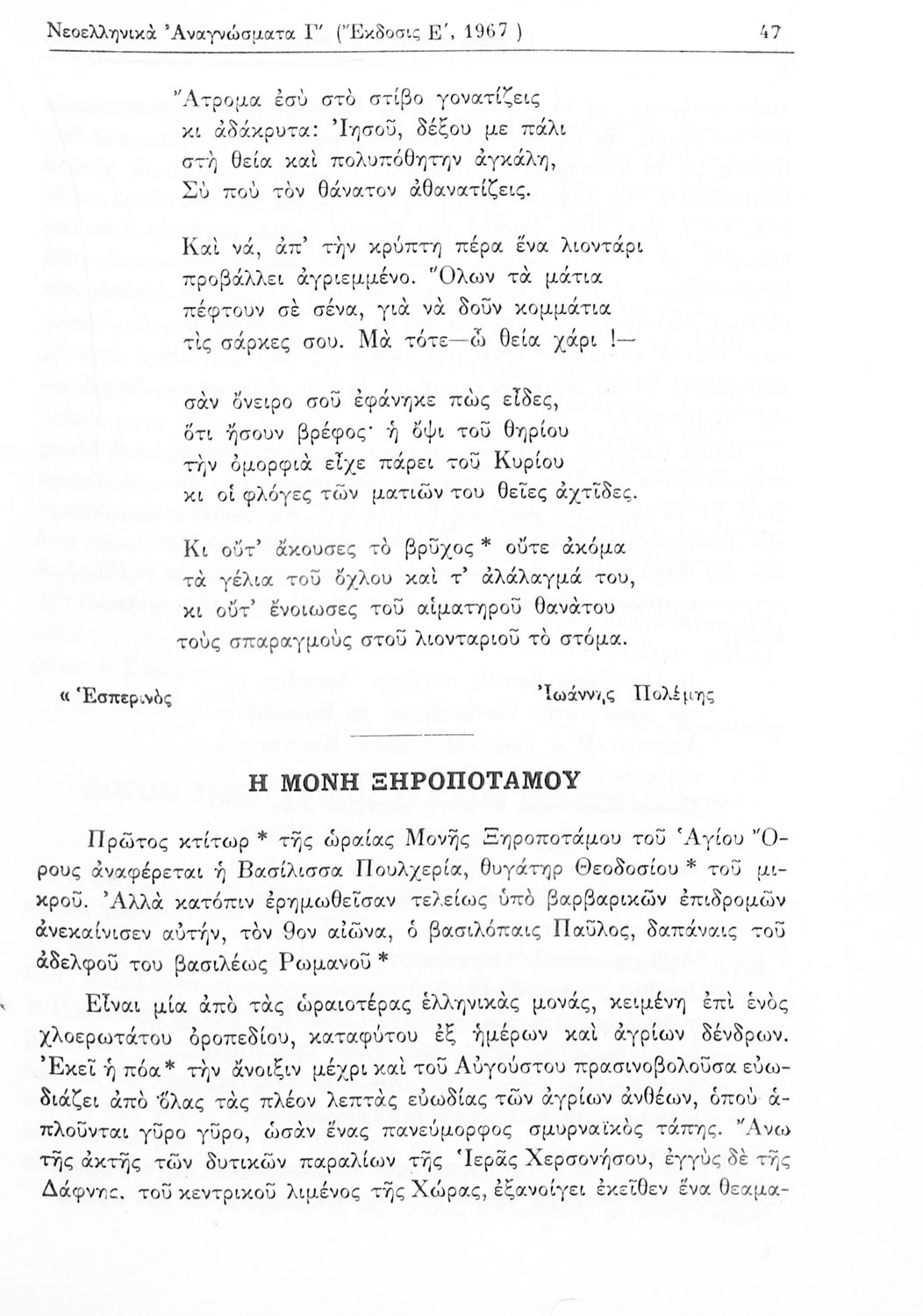 Σχολικό εγχειρίδιο Νέων Ελληνικών Γ΄ Γυμνασίου και Α' Αστικού Σχολείου που περιέχει πεζά και ποιήματα Ελλήνων συγγραφέων εμπνευσμένα από τη θρησκευτική και κοινωνική ζωή, την ελληνική μυθολογία, την αρχαία και