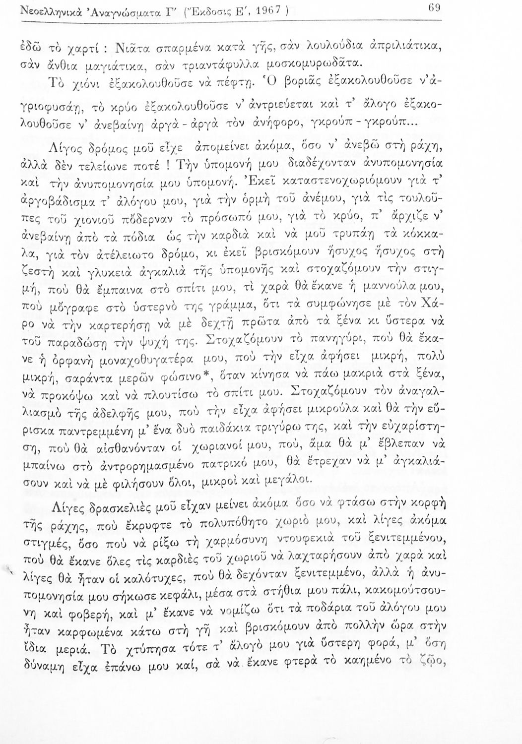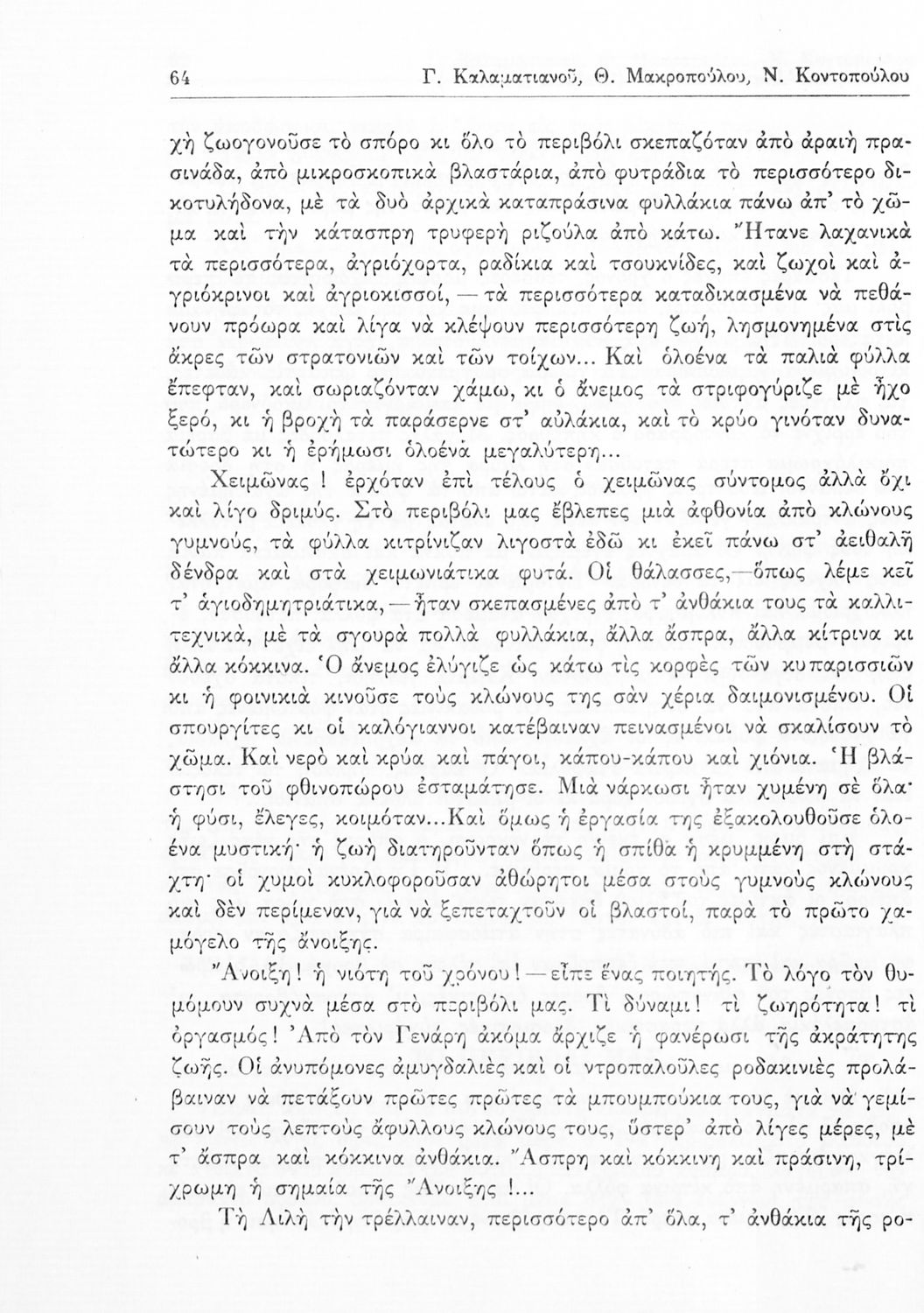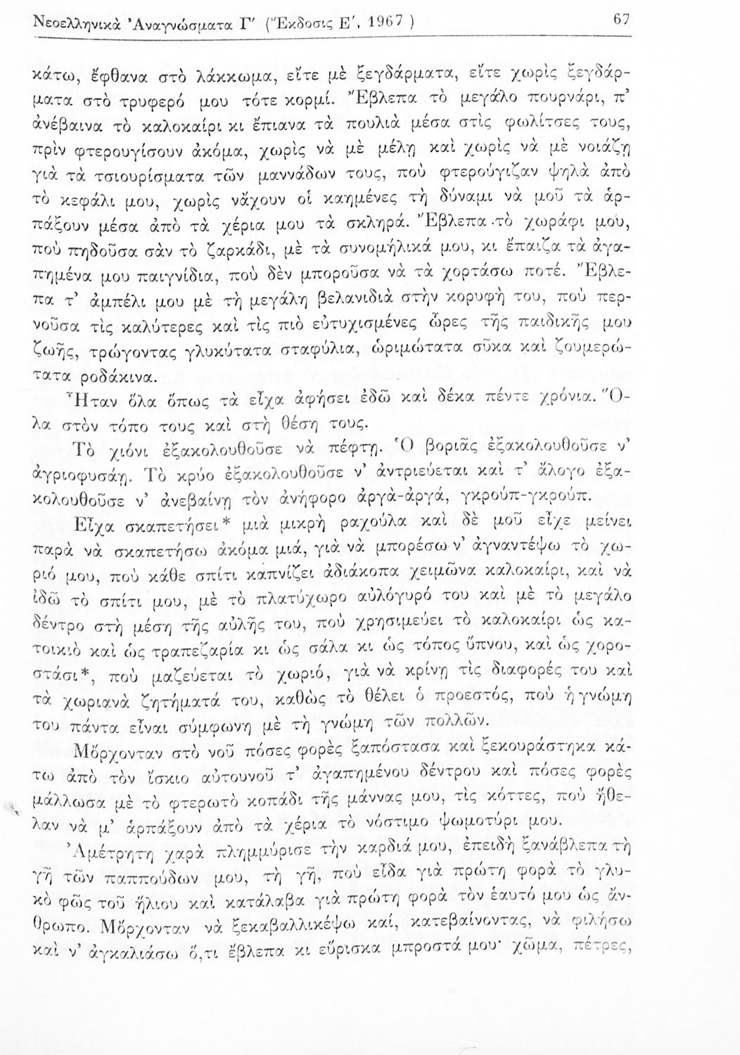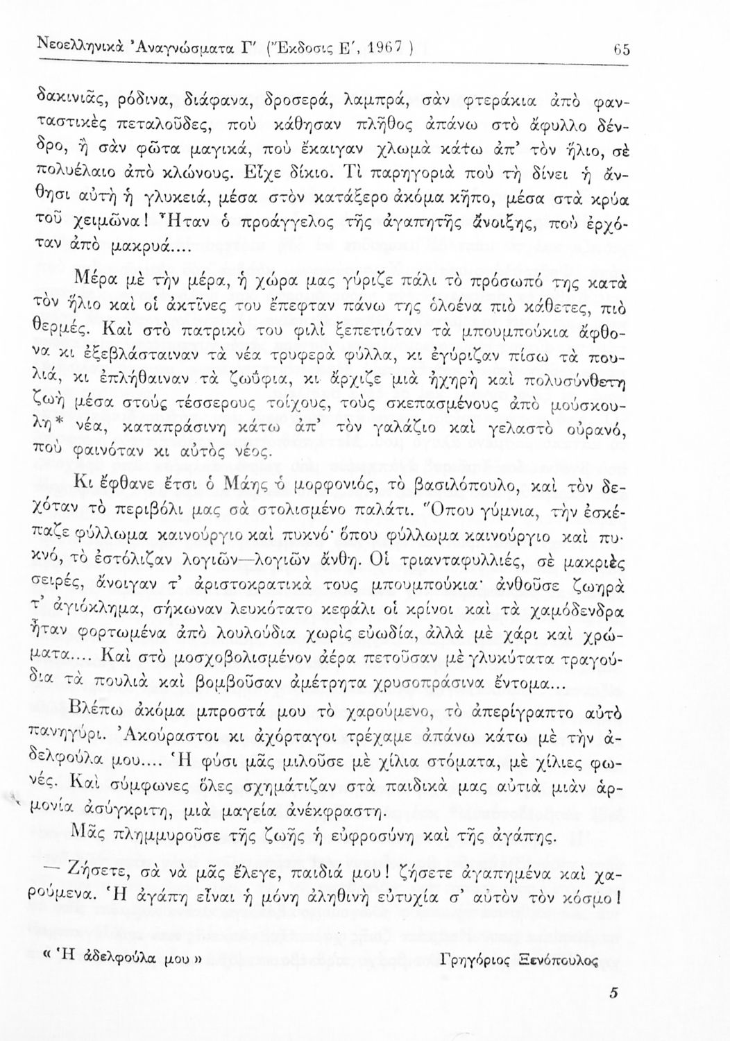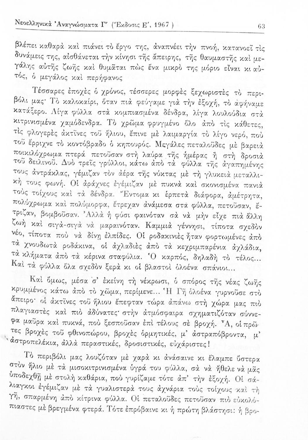 Σχολικό εγχειρίδιο Νέων Ελληνικών Γ' Γυμνασίου που περιέχει ποιήματα και πεζά Ελλήνων συγγραφέων εμπνευσμένα από τη θρησκευτική, οικογενειακή και κοινωνική ζωή, την σύγχρονή ελληνική ιστορία και την ελληνική φύση. Περιέχει παράρτημα με βιογραφίες των συγγραφέων και λεξιλόγιο.