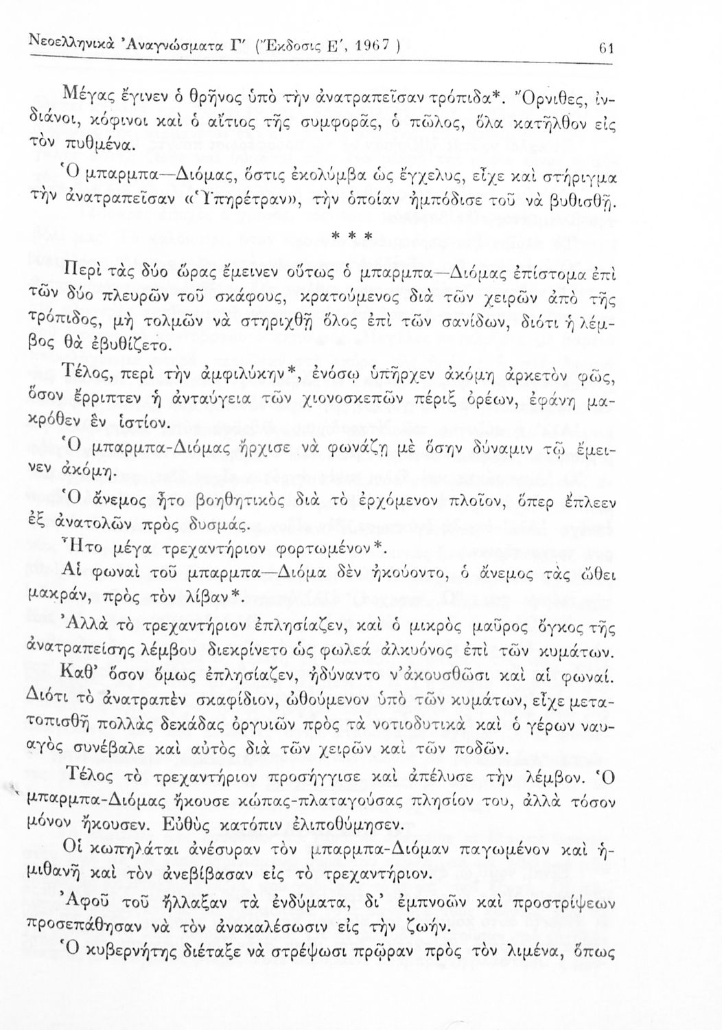 Βαθμίδα εκπαίδευσης: Δευτεροβάθμια Τάξη: Γ' Γυμνασίου Μάθημα: Νέα Ελληνικά Γλώσσα: Δημοτική με στοιχεία καθαρεύουσας Παρουσίαση περιεχομένου: Σχολικό εγχειρίδιο Νέων Ελληνικών Γ' Γυμνασίου που περιέχει ποιήματα και πεζά Ελλήνων συγγραφέων εμπνευσμένα από τη θρησκευτική, οικογενειακή και κοινωνική ζωή, την σύγχρονή ελληνική ιστορία και την ελληνική φύση. Περιέχει παράρτημα με βιογραφίες των συγγραφέων και λεξιλόγιο. |