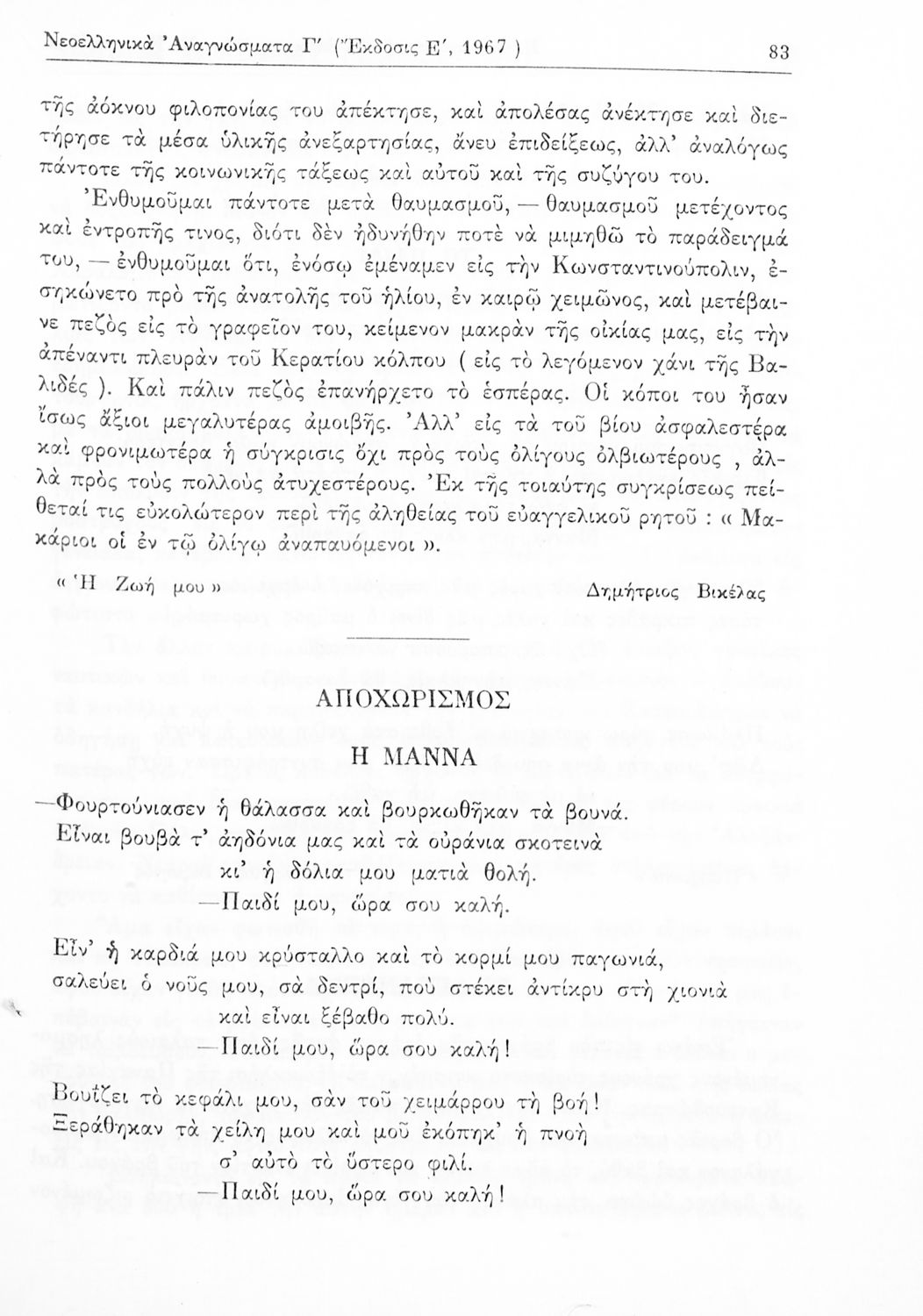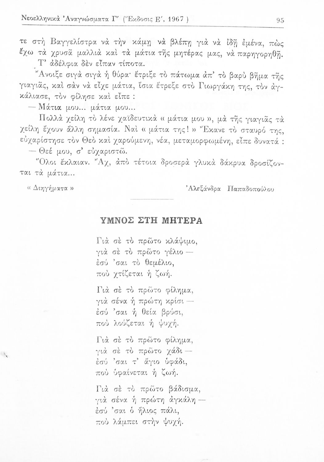 Σχολικό εγχειρίδιο Νέων Ελληνικών Γ' Γυμνασίου που περιέχει ποιήματα και πεζά Ελλήνων συγγραφέων εμπνευσμένα από τη θρησκευτική, οικογενειακή και κοινωνική ζωή, την σύγχρονή ελληνική ιστορία και την ελληνική φύση. Περιέχει παράρτημα με βιογραφίες των συγγραφέων και λεξιλόγιο.