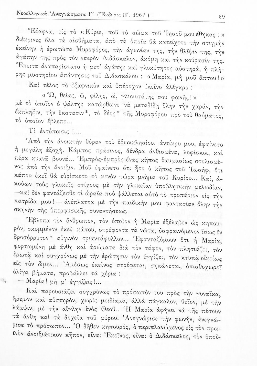 Σχολικό εγχειρίδιο Νέων Ελληνικών Γ΄ Γυμνασίου και Α' Αστικού Σχολείου που περιέχει πεζά και ποιήματα Ελλήνων συγγραφέων εμπνευσμένα από τη θρησκευτική και κοινωνική ζωή, την ελληνική μυθολογία, την αρχαία και