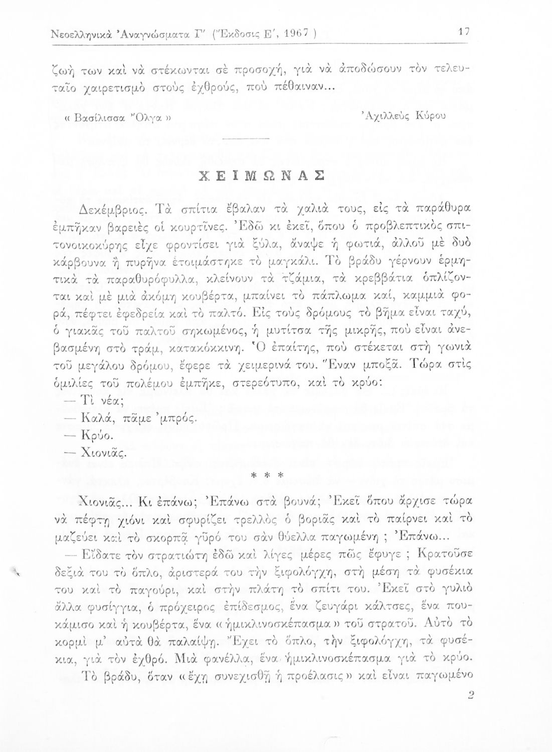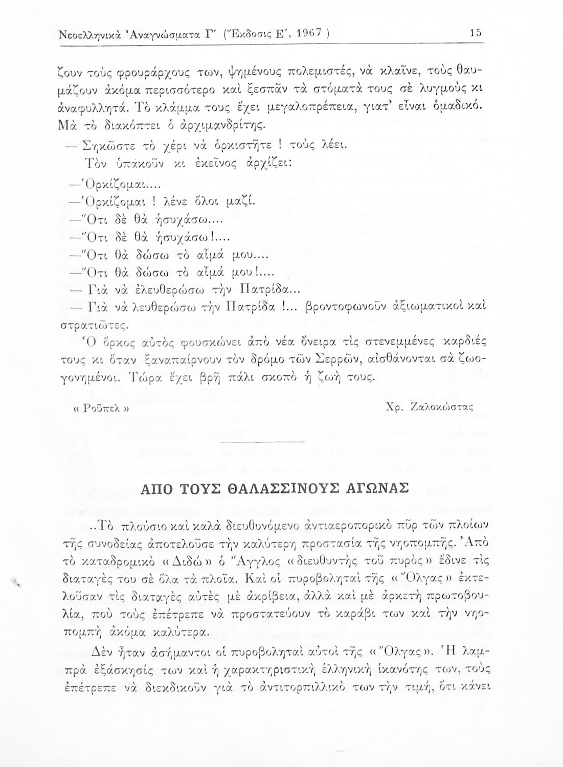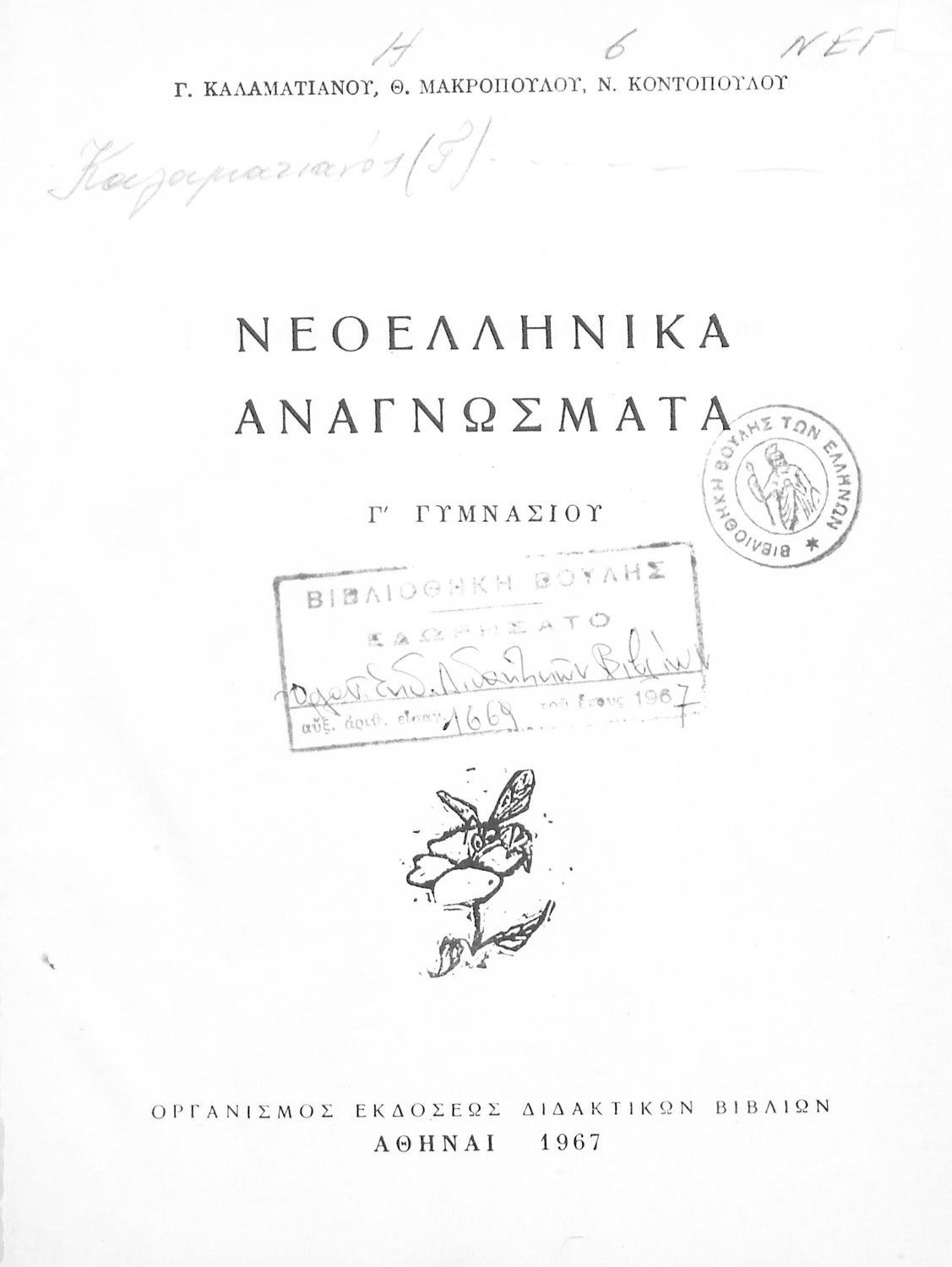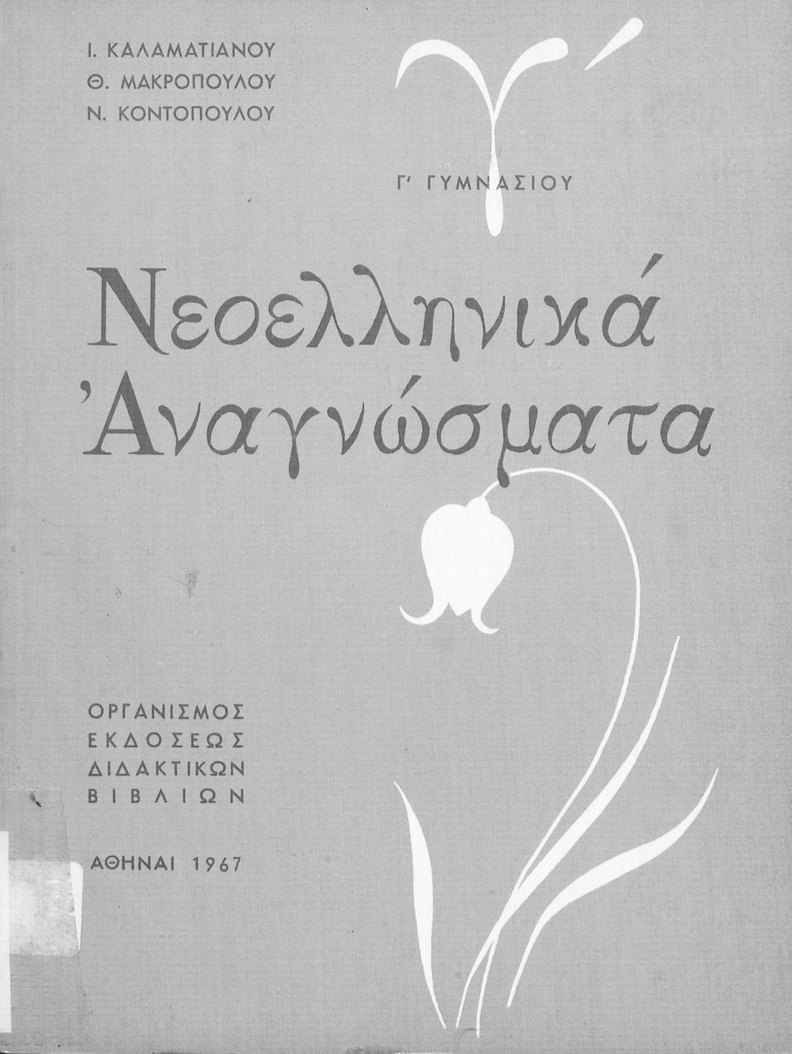 Σχολικό εγχειρίδιο Νέων Ελληνικών Γ΄ Γυμνασίου και Α' Αστικού Σχολείου που περιέχει πεζά και ποιήματα Ελλήνων συγγραφέων εμπνευσμένα από τη θρησκευτική και κοινωνική ζωή, την ελληνική μυθολογία, την αρχαία και
