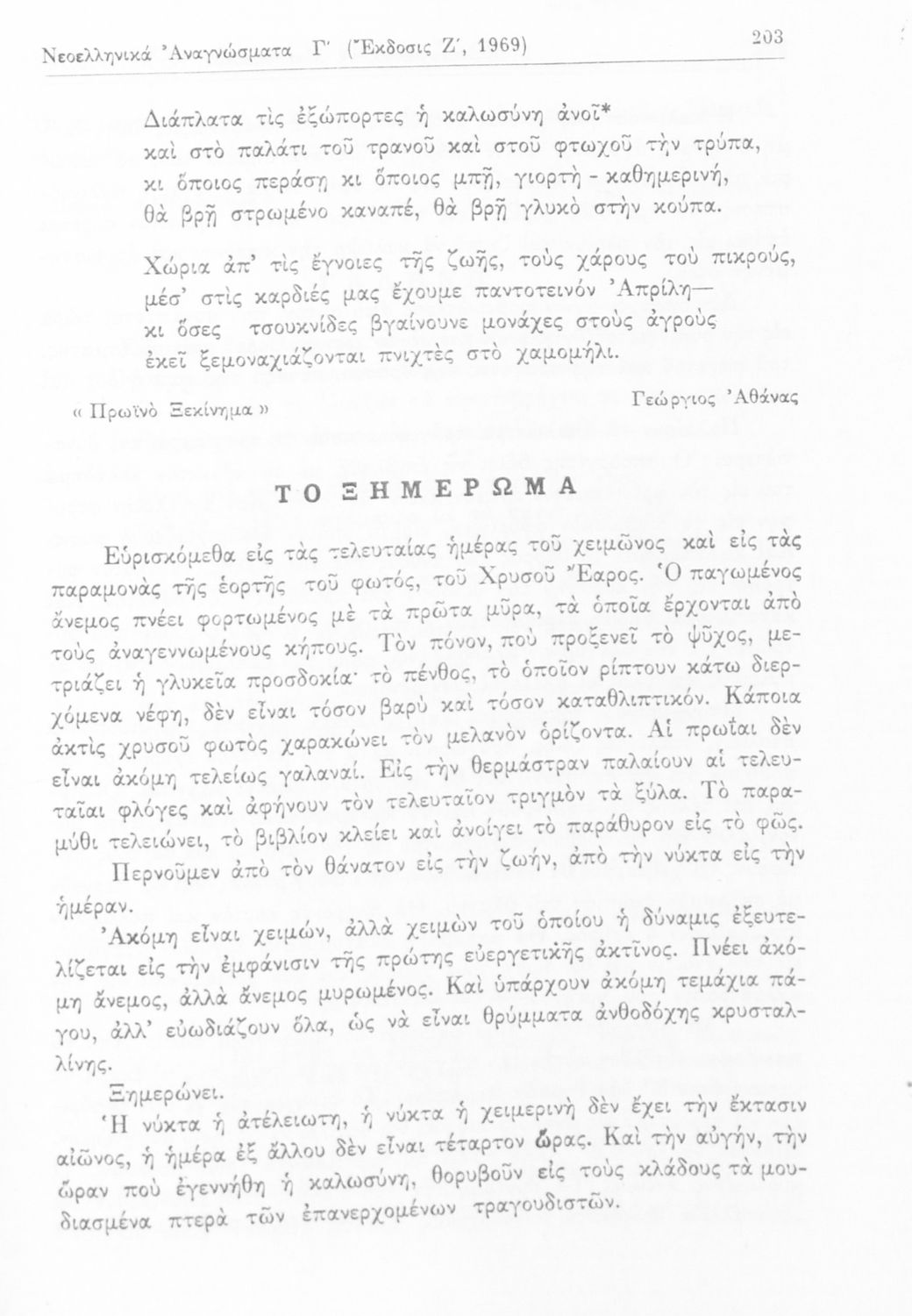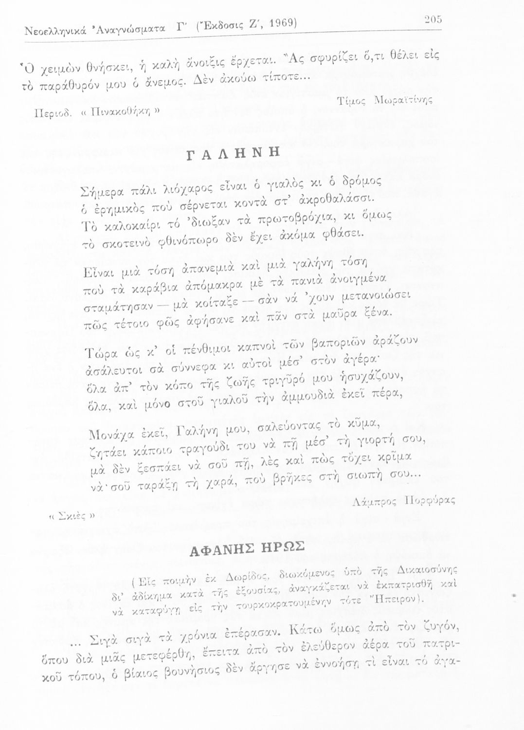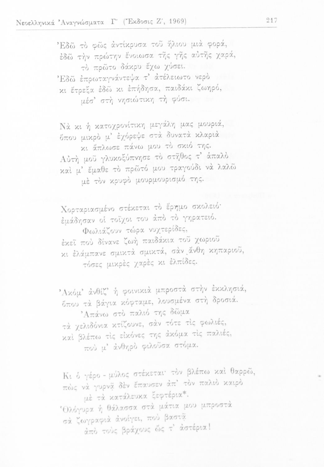 Σχολικό εγχειρίδιο Νέων Ελληνικών Γ΄ Γυμνασίου που περιέχει ποιήματα και πεζά Ελλήνων συγγραφέων εμπνευσμένα από τη θρησκευτική, οικογενειακή και κοινωνική ζωή, την σύγχρονή ελληνική ιστορία και την ελληνική φύση. Περιέχει παράρτημα με βιογραφίες των συγγραφέων και λεξιλόγιο. Φέρει το σύμβολο της δικτατορίας.