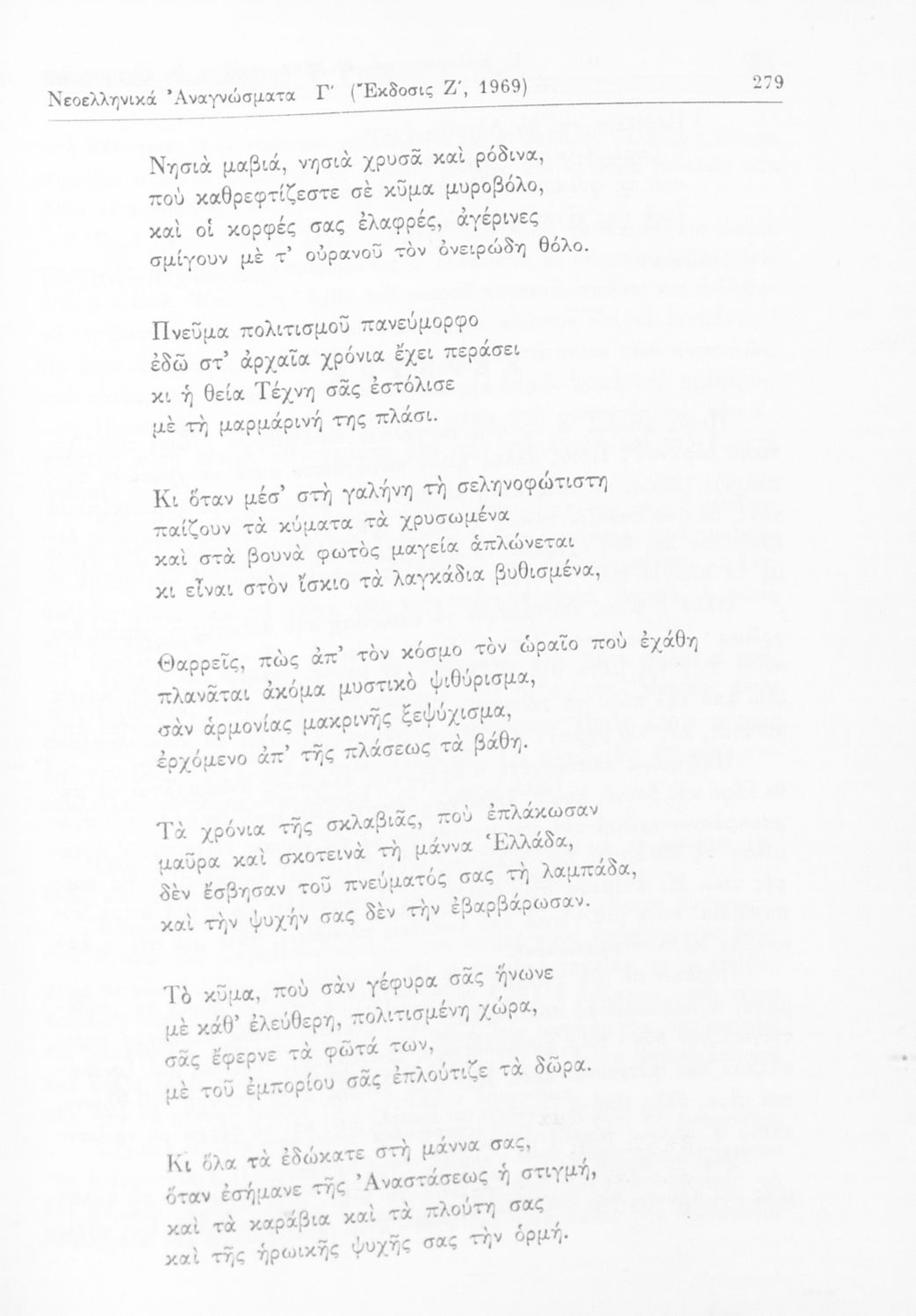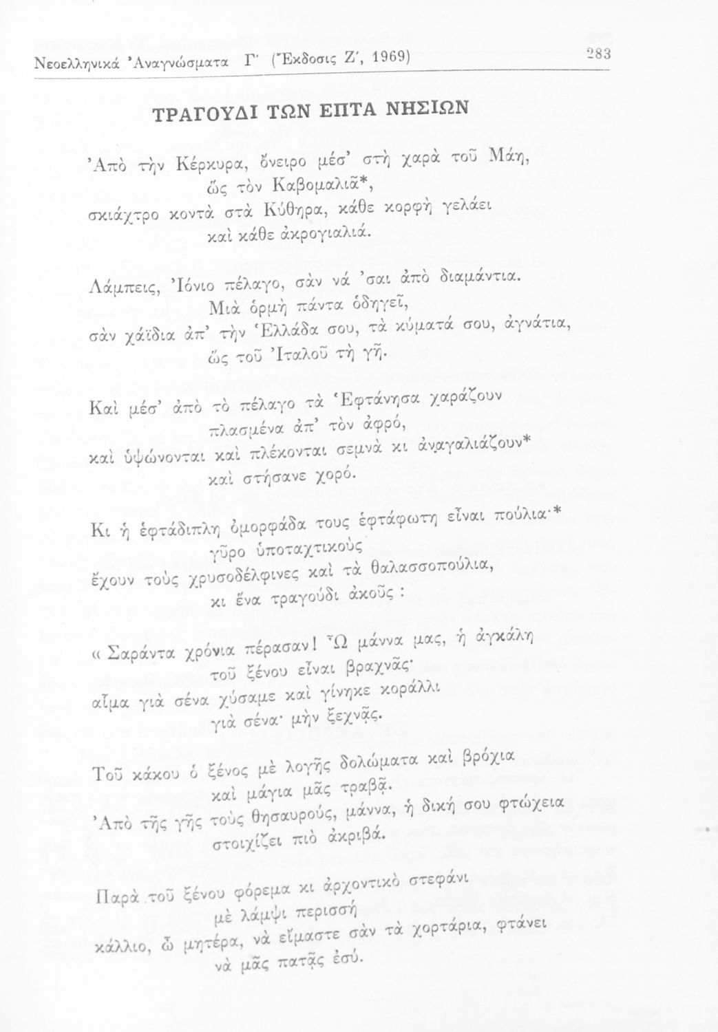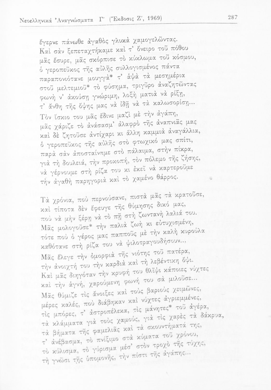 Σχολικό εγχειρίδιο Νέων Ελληνικών Γ΄ Γυμνασίου που περιέχει ποιήματα και πεζά Ελλήνων συγγραφέων εμπνευσμένα από τη θρησκευτική, οικογενειακή και κοινωνική ζωή, την σύγχρονή ελληνική ιστορία και την ελληνική φύση. Περιέχει παράρτημα με βιογραφίες των συγγραφέων και λεξιλόγιο. Φέρει το σύμβολο της δικτατορίας.