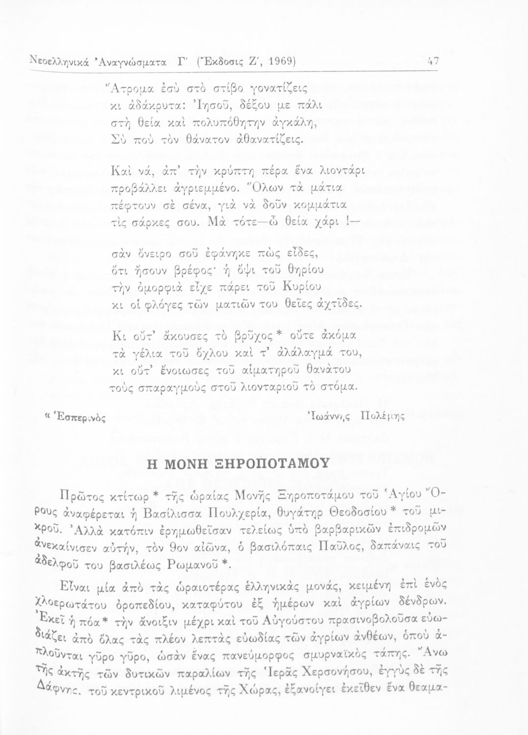 Σχολικό εγχειρίδιο Νέων Ελληνικών Γ΄ Γυμνασίου που περιέχει ποιήματα και πεζά Ελλήνων συγγραφέων εμπνευσμένα από τη θρησκευτική, οικογενειακή και κοινωνική ζωή, την σύγχρονή ελληνική ιστορία και την ελληνική φύση. Περιέχει παράρτημα με βιογραφίες των συγγραφέων και λεξιλόγιο. Φέρει το σύμβολο της δικτατορίας.