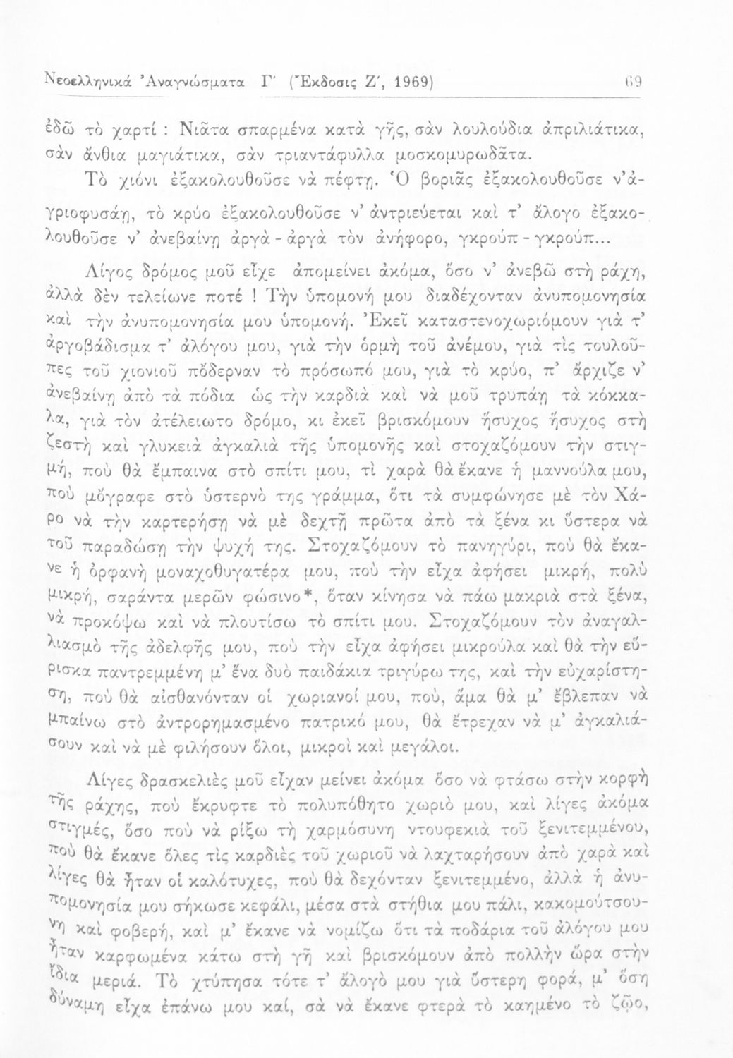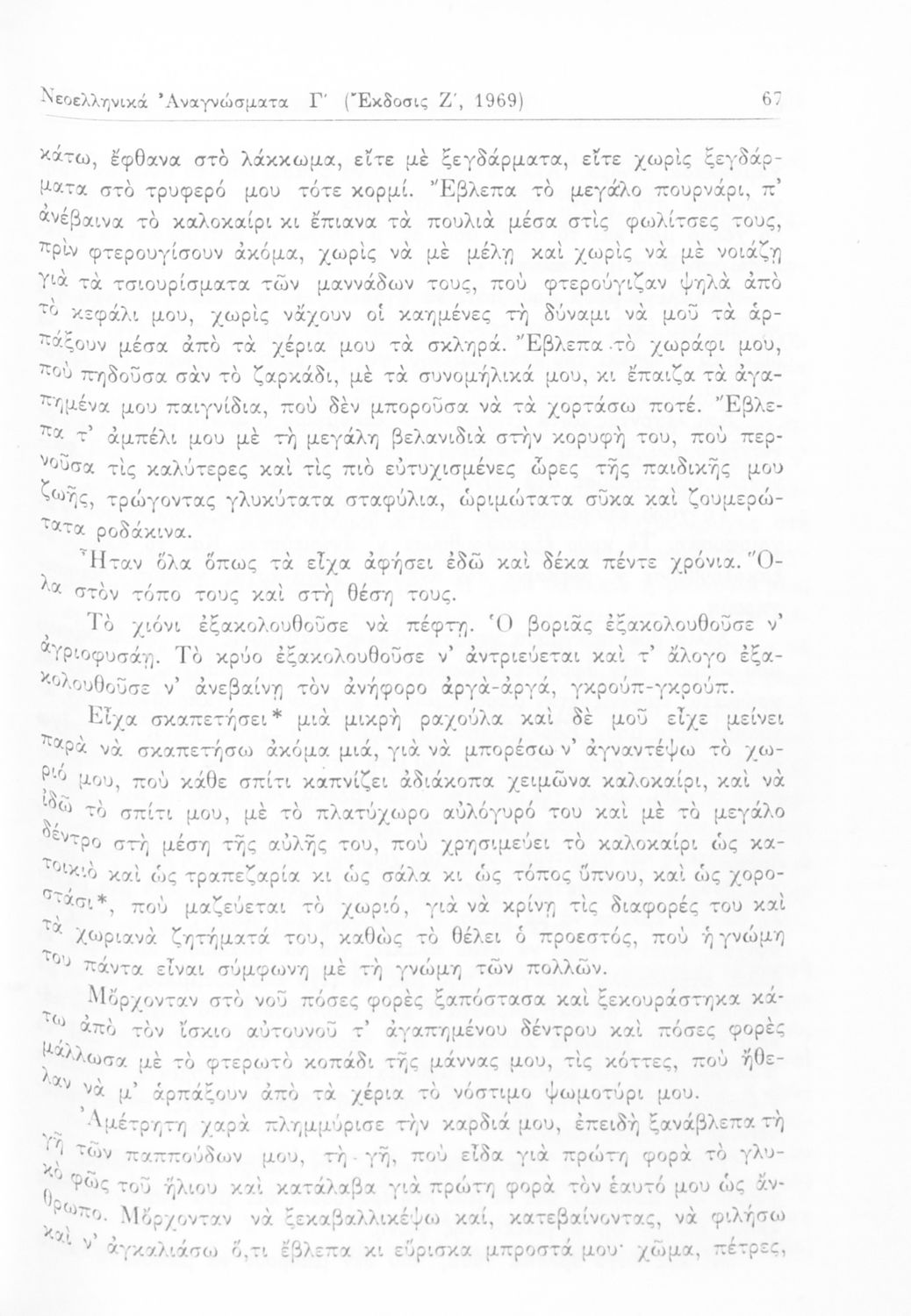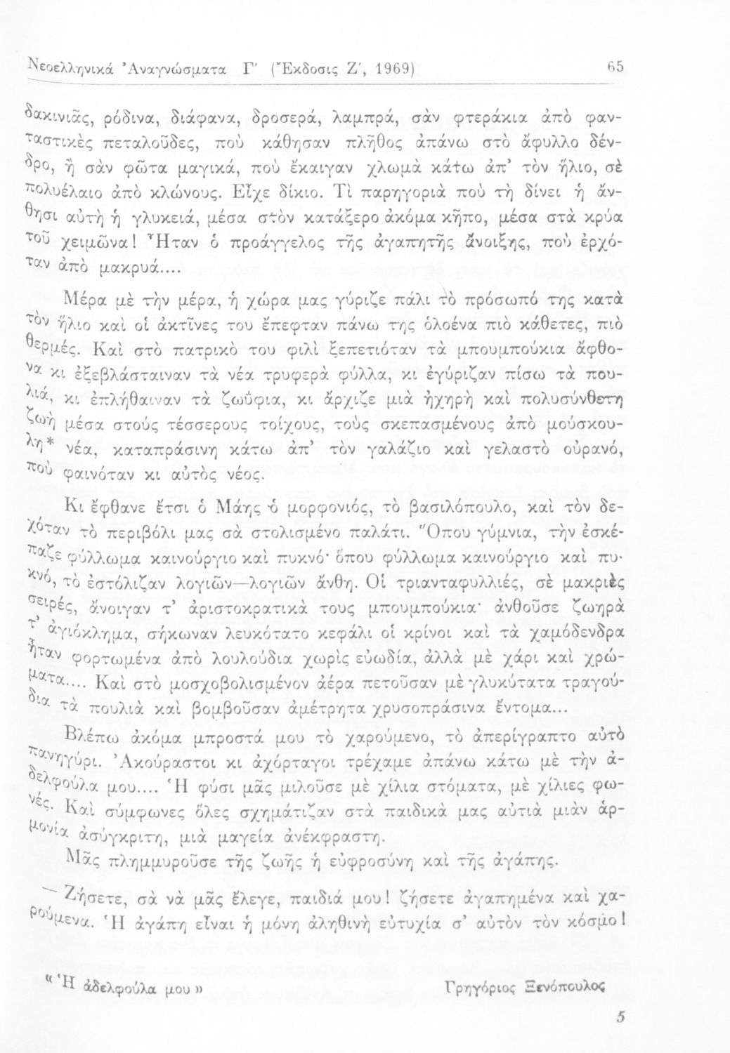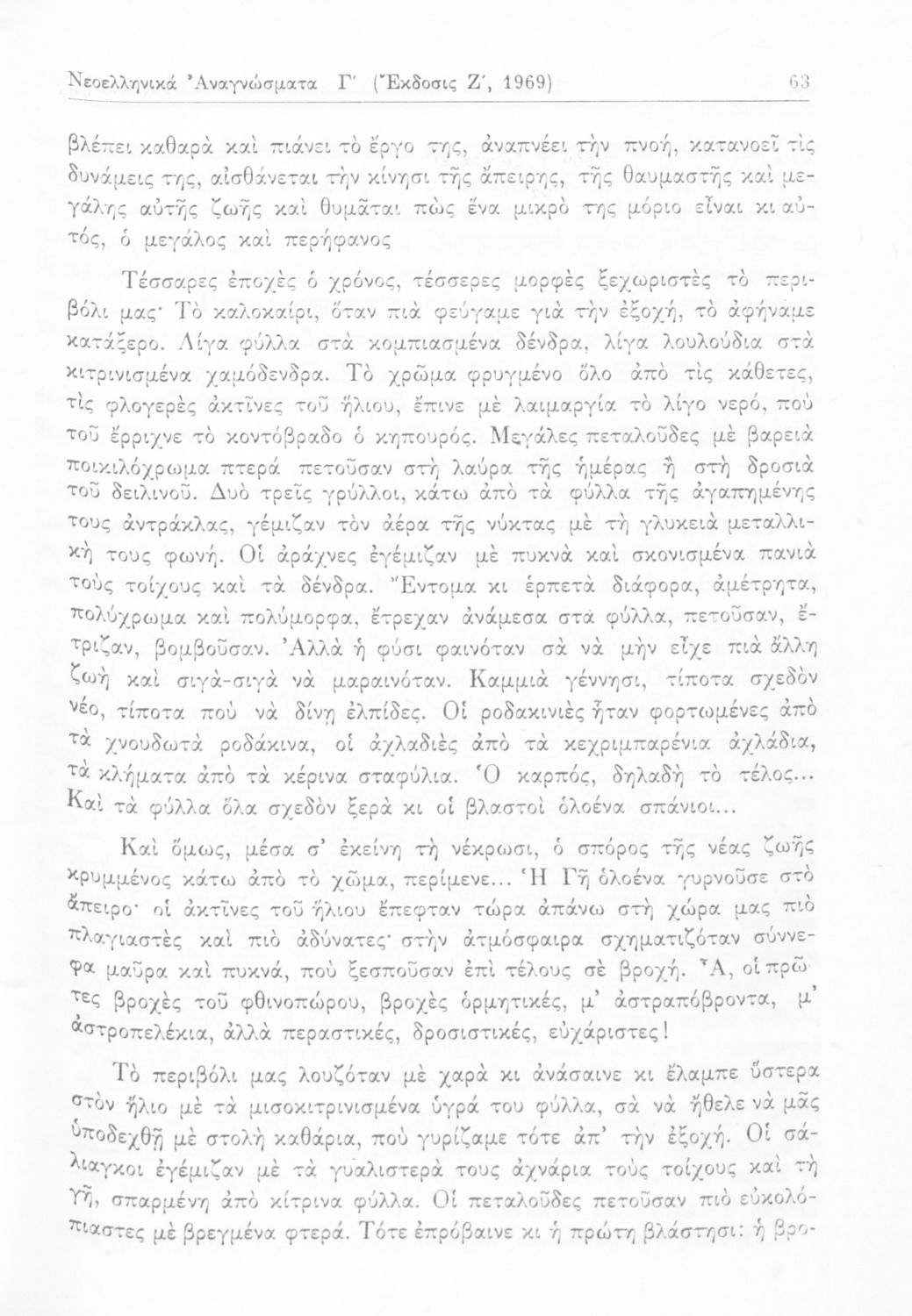 Σχολικό εγχειρίδιο Νέων Ελληνικών Γ΄ Γυμνασίου που περιέχει ποιήματα και πεζά Ελλήνων συγγραφέων εμπνευσμένα από τη θρησκευτική, οικογενειακή και κοινωνική ζωή, την σύγχρονή ελληνική ιστορία και την ελληνική φύση. Περιέχει παράρτημα με βιογραφίες των συγγραφέων και λεξιλόγιο. Φέρει το σύμβολο της δικτατορίας.