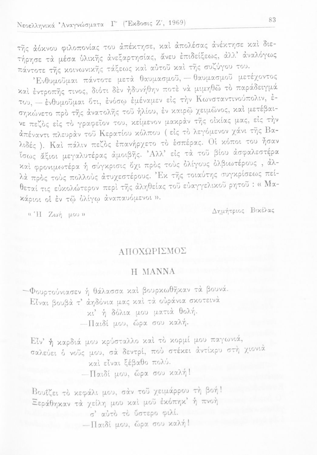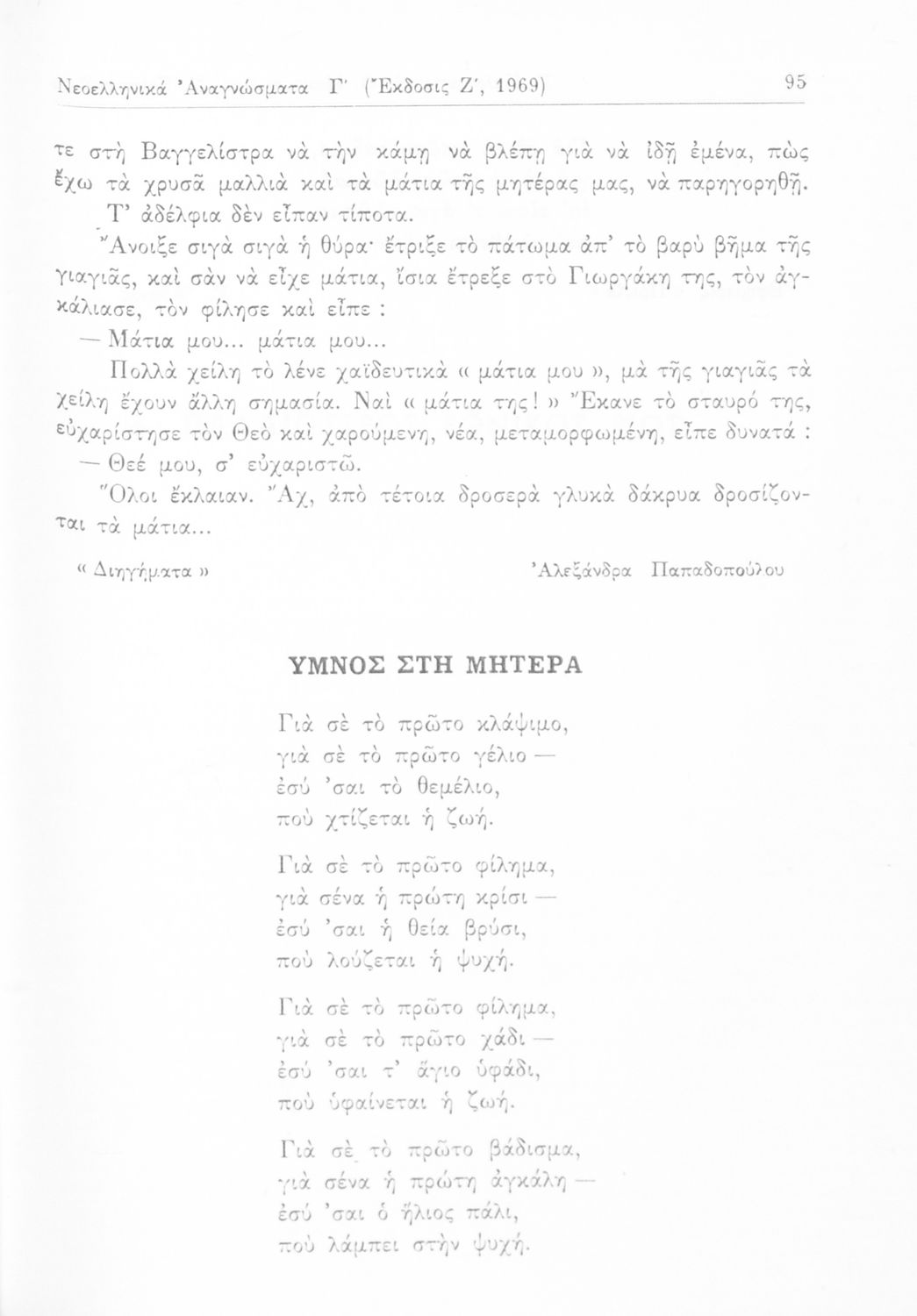 Σχολικό εγχειρίδιο Νέων Ελληνικών Γ΄ Γυμνασίου που περιέχει ποιήματα και πεζά Ελλήνων συγγραφέων εμπνευσμένα από τη θρησκευτική, οικογενειακή και κοινωνική ζωή, την σύγχρονή ελληνική ιστορία και την ελληνική φύση. Περιέχει παράρτημα με βιογραφίες των συγγραφέων και λεξιλόγιο. Φέρει το σύμβολο της δικτατορίας.