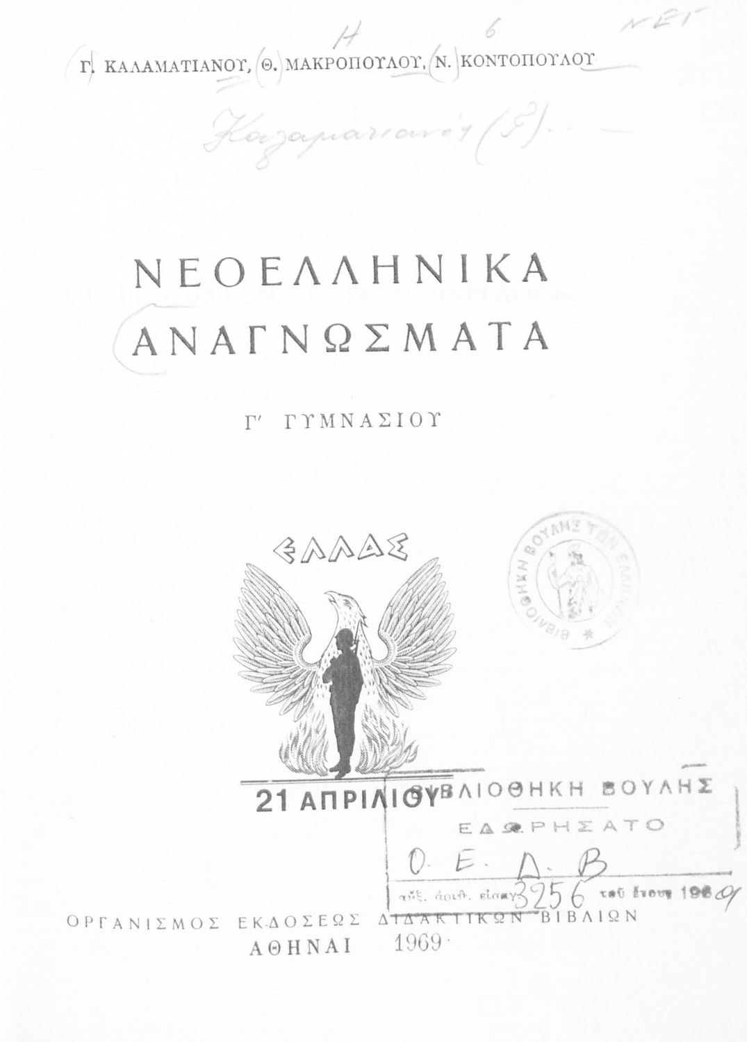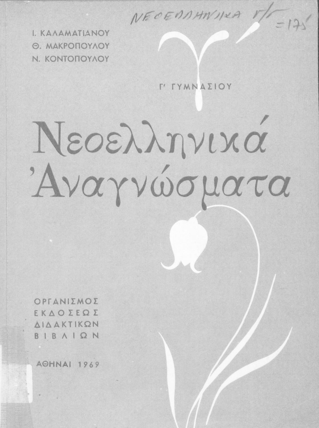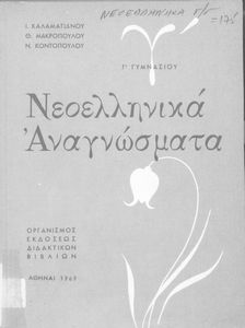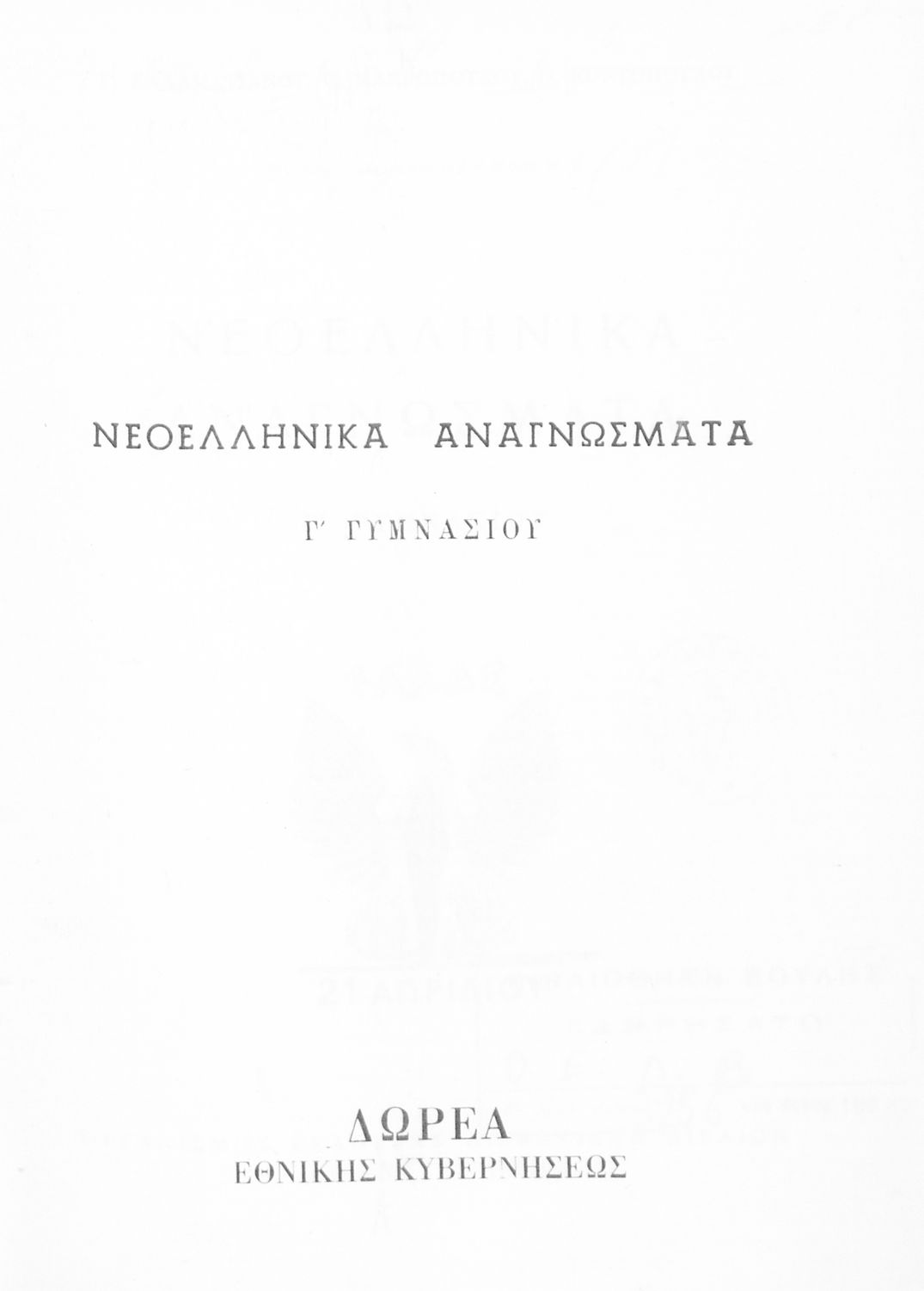 Βαθμίδα εκπαίδευσης: Δευτεροβάθμια Τάξη: Γ' Γυμνασίου Μάθημα: Νέα Ελληνικά Γλώσσα: Δημοτική, Καθαρεύουσα Παρουσίαση περιεχομένου: Σχολικό εγχειρίδιο Νέων Ελληνικών Γ΄ Γυμνασίου που περιέχει ποιήματα και πεζά Ελλήνων συγγραφέων εμπνευσμένα από τη θρησκευτική, οικογενειακή και κοινωνική ζωή, την σύγχρονή ελληνική ιστορία και την ελληνική φύση. Περιέχει παράρτημα με βιογραφίες των συγγραφέων και λεξιλόγιο. Φέρει το σύμβολο της δικτατορίας. |