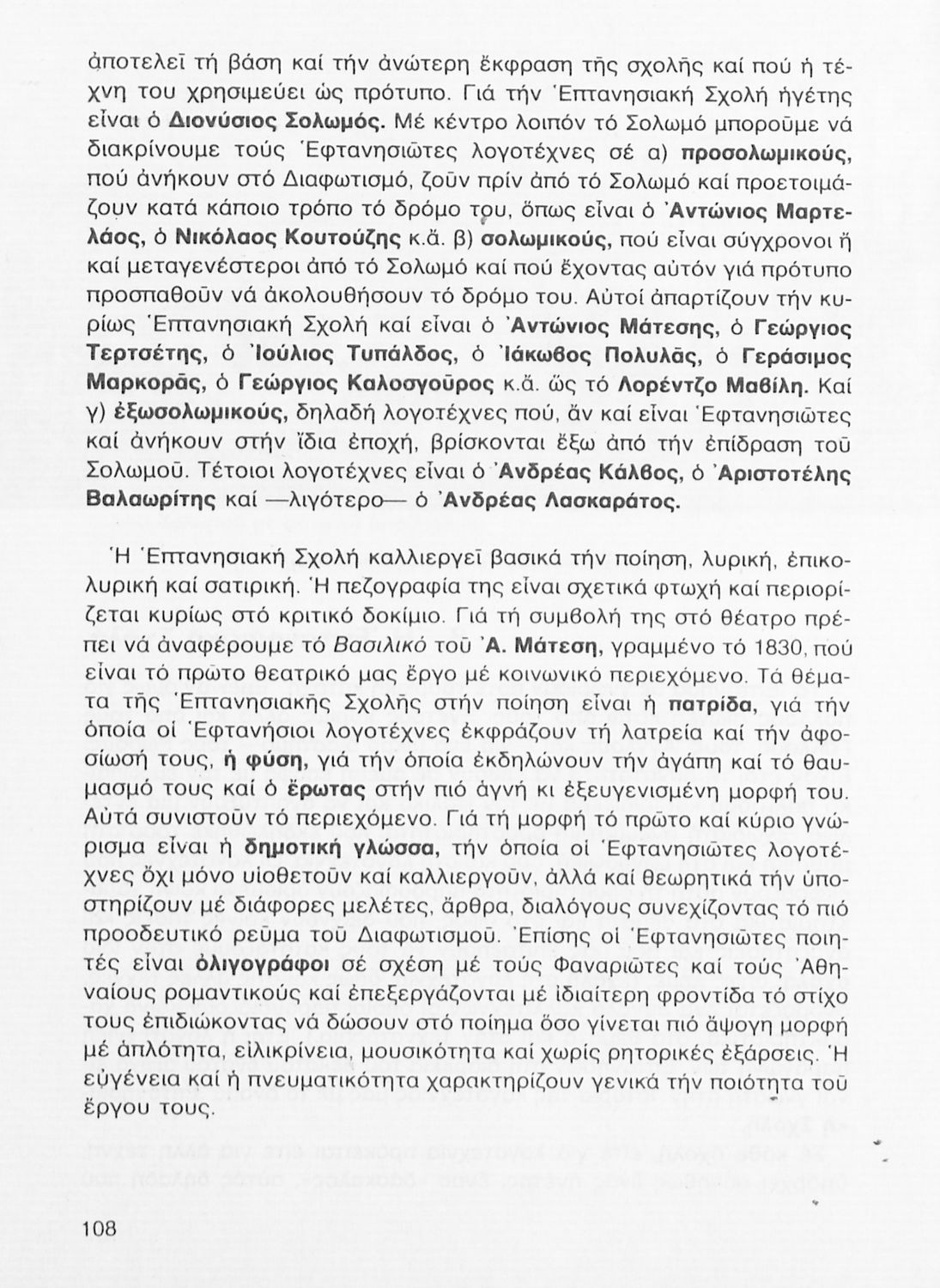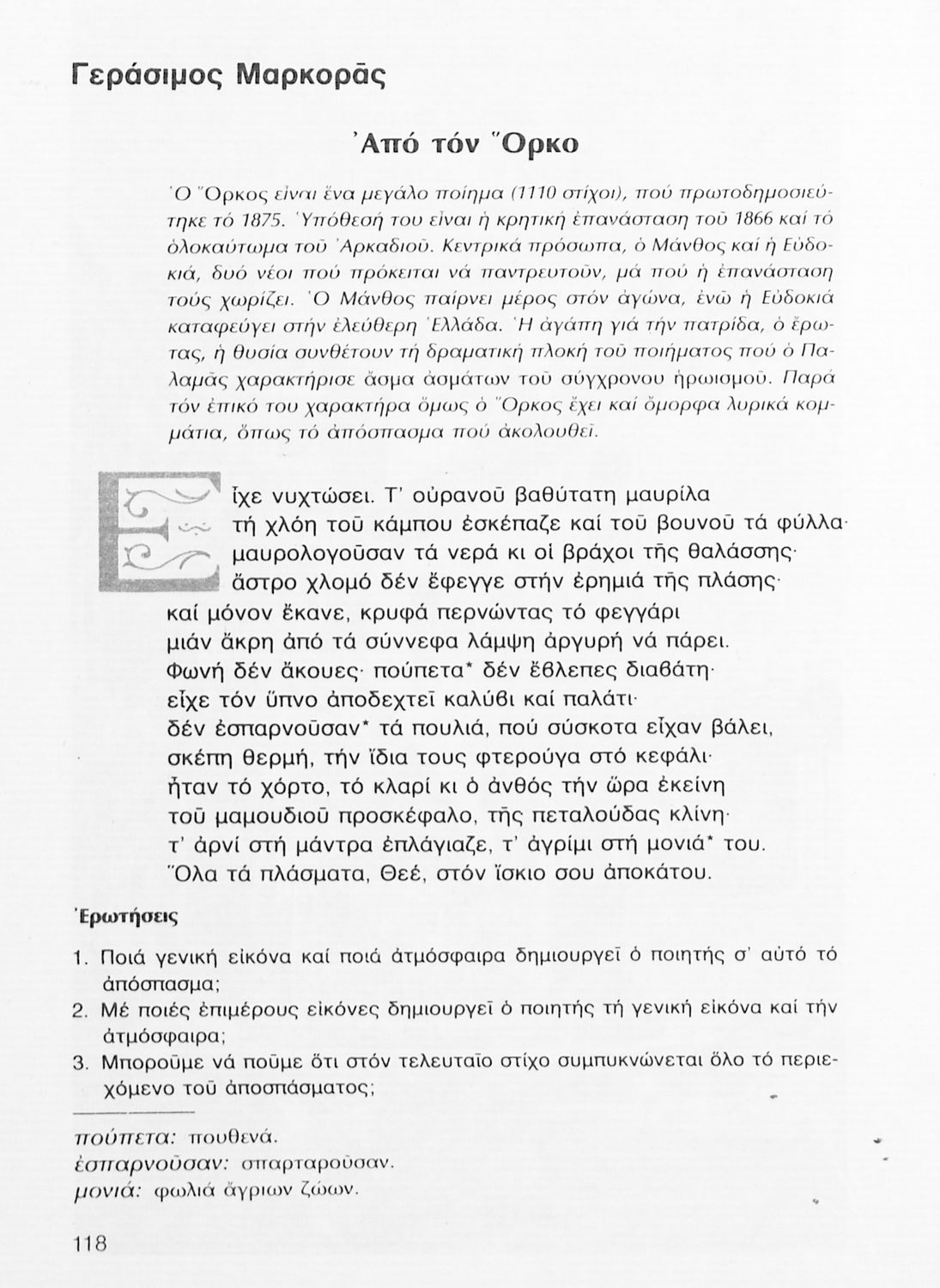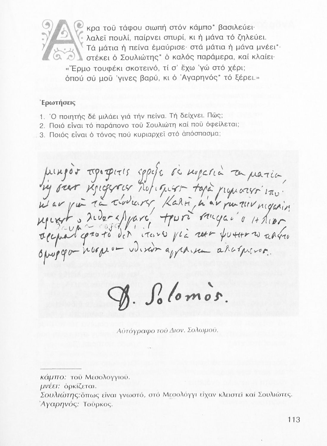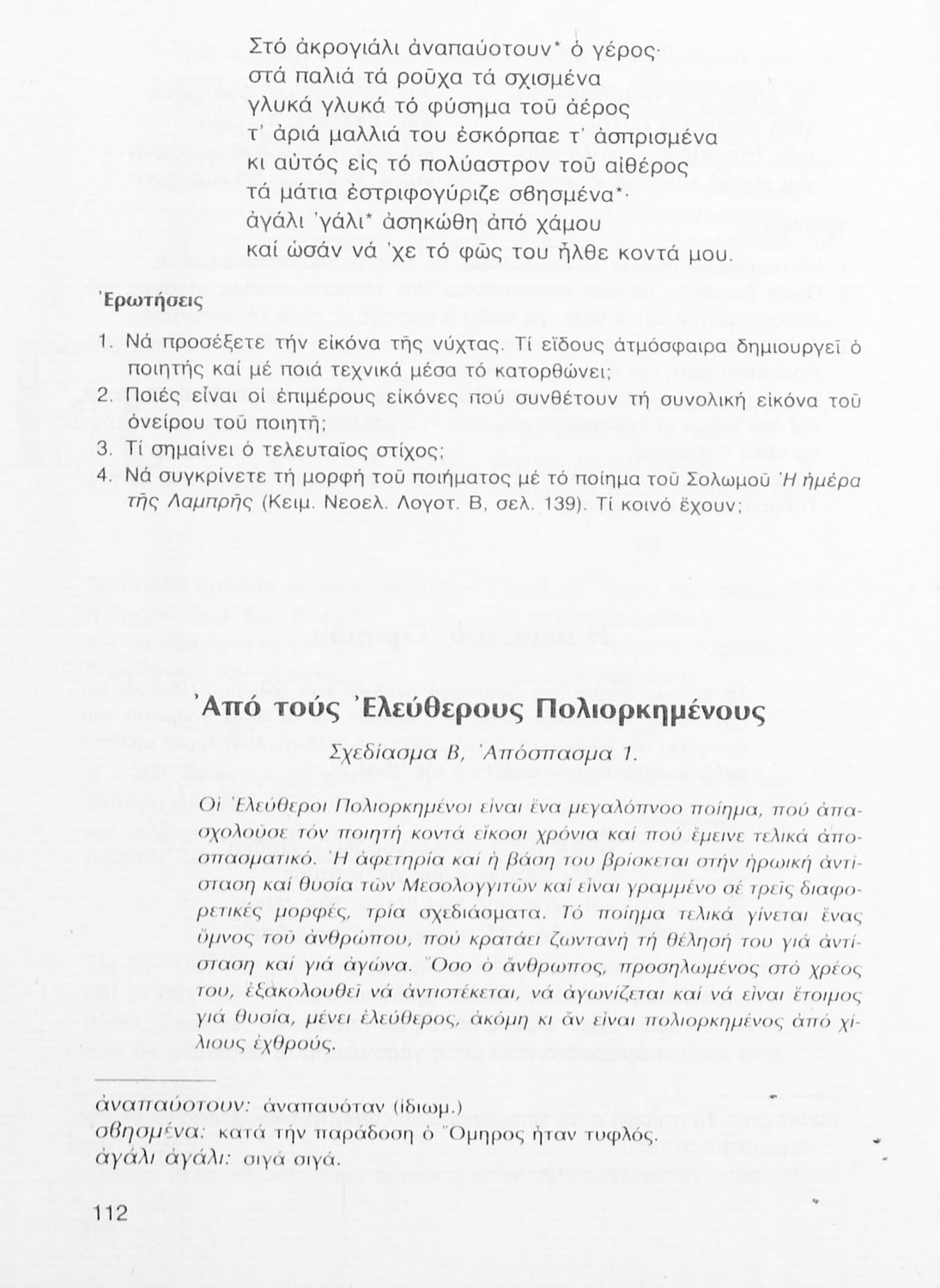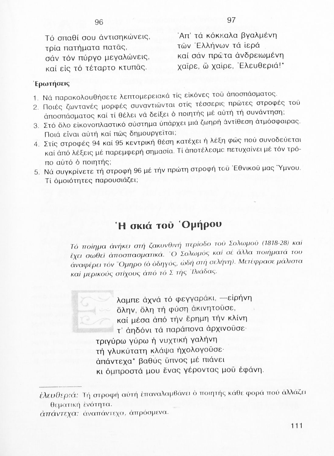 Σχολικό εγχειρίδιο Νέων Ελληνικών Γ΄ Γυμνασίου που περιλαμβάνει δημοτικά τραγούδια, και χαρακτηριστικά δείγματα της κρητικής λογοτεχνίας, της επτανησιακής και ρομαντικής σχολής, της Νέας Αθηναϊκής Σχολής και της νεότερης και μεταπολεμικής λογοτεχνίας. Περιέχει και έργα σύγχρονων ξένων συγγραφέων, βιογραφικά και εισαγωγικά σημειώματα.