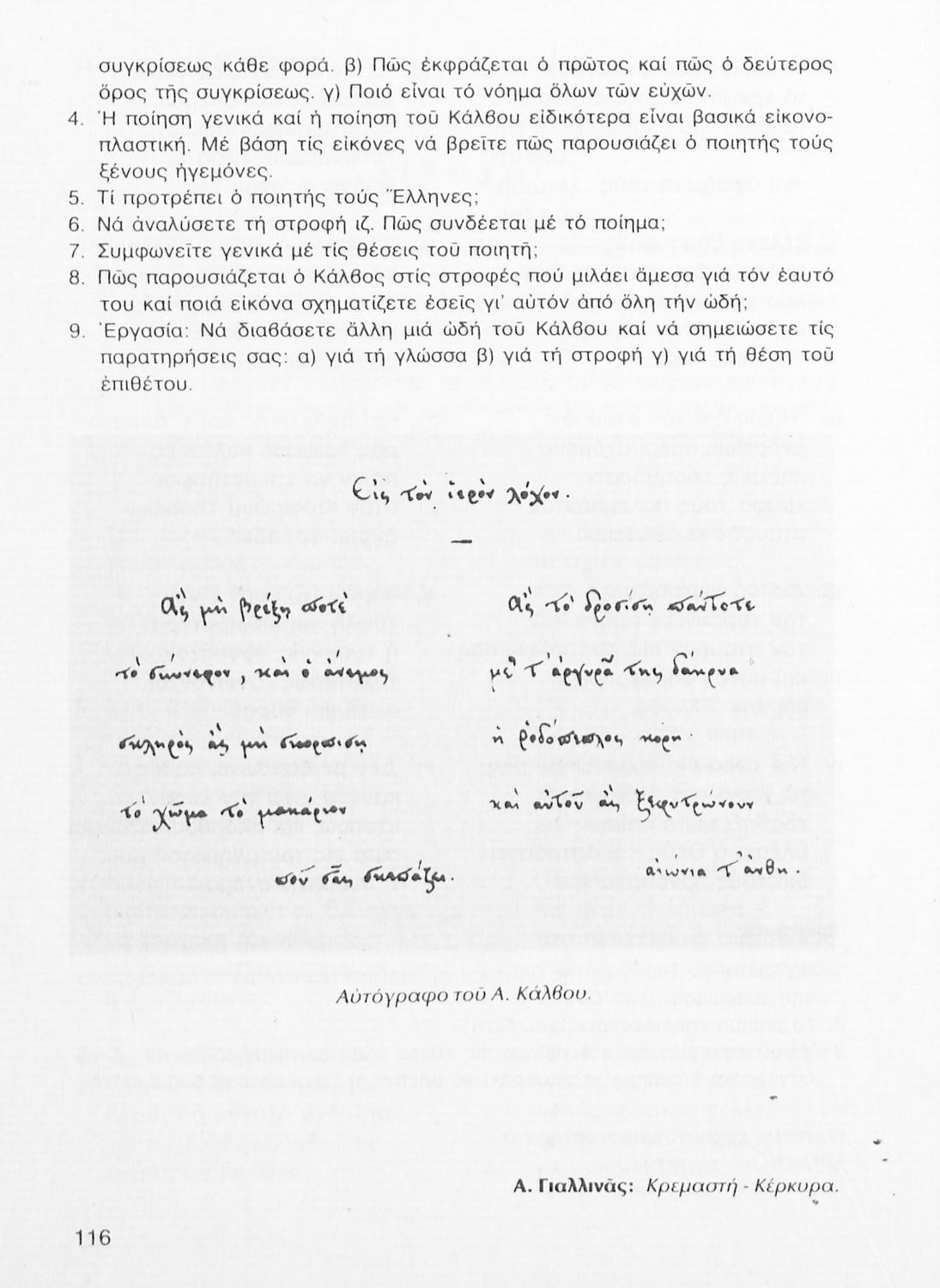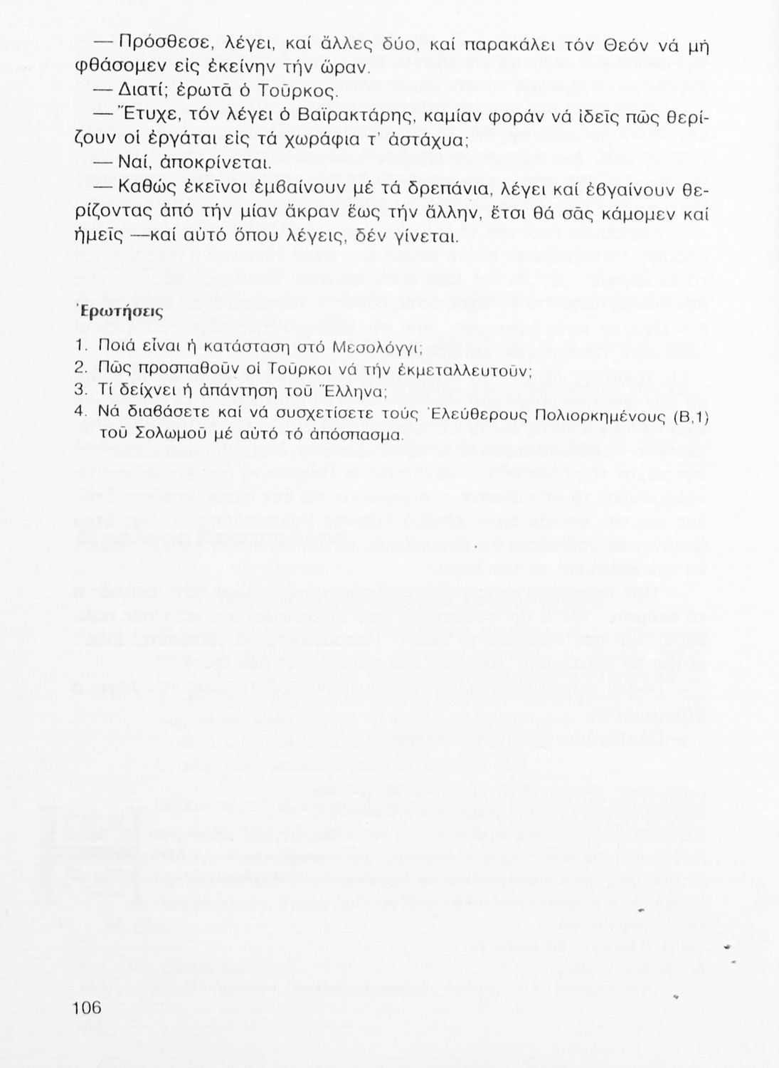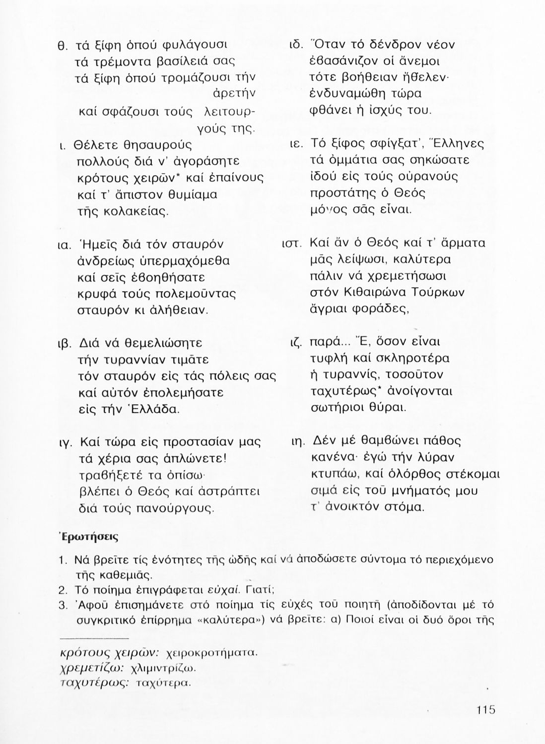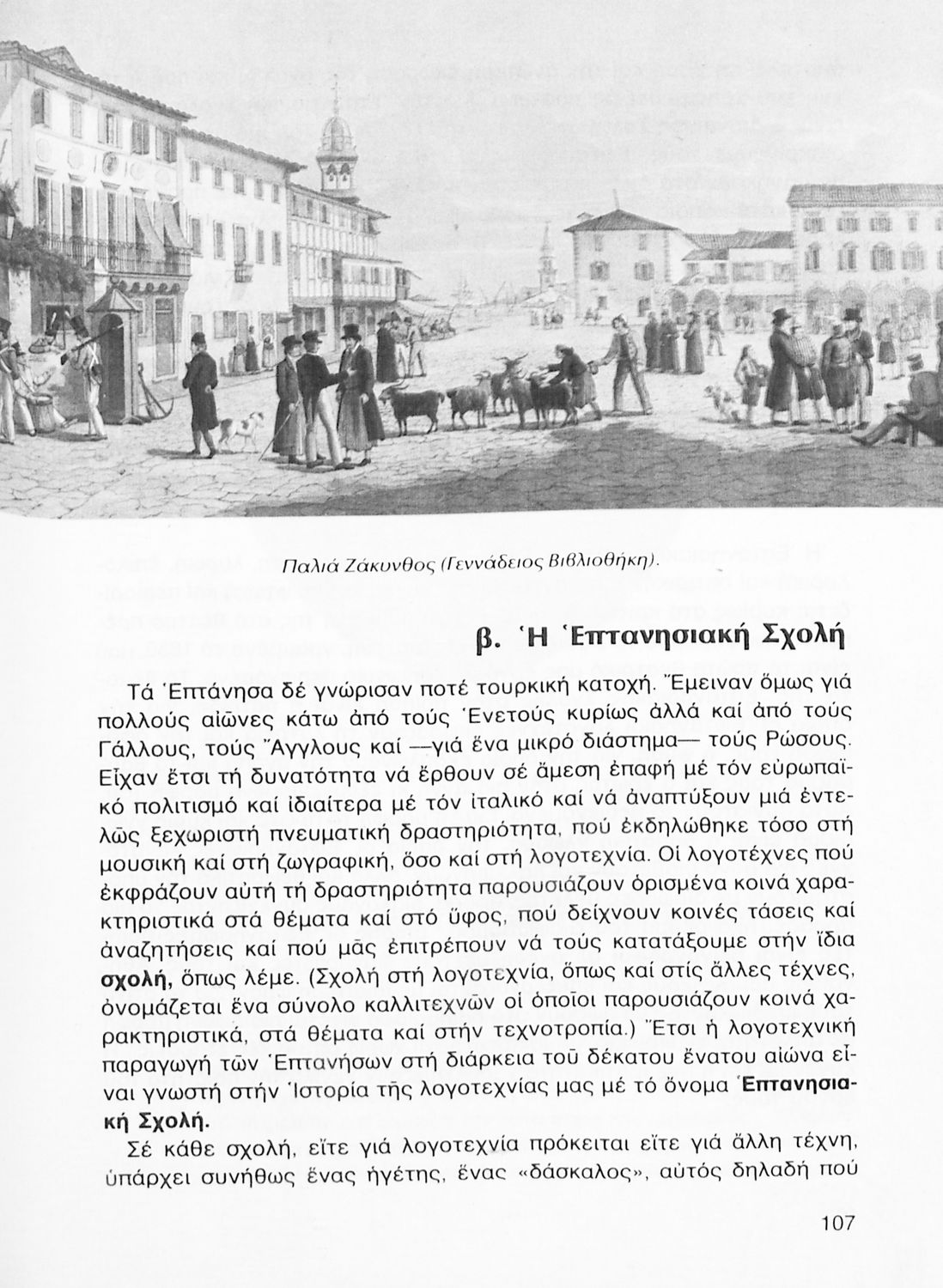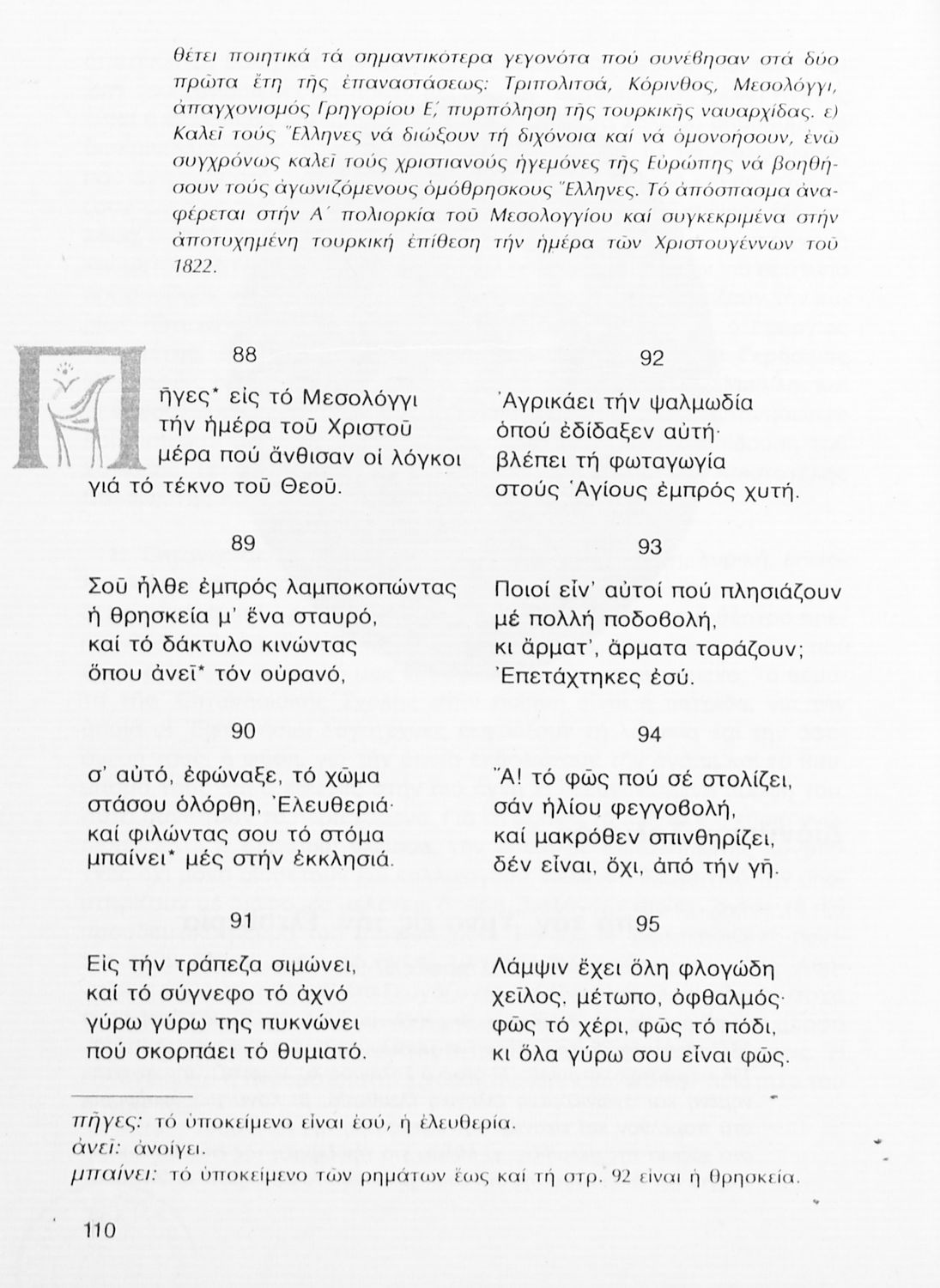 Σχολικό εγχειρίδιο Νέων Ελληνικών Γ΄ Γυμνασίου που περιλαμβάνει δημοτικά τραγούδια, και χαρακτηριστικά δείγματα της κρητικής λογοτεχνίας, της επτανησιακής και ρομαντικής σχολής, της Νέας Αθηναϊκής Σχολής και της νεότερης και μεταπολεμικής λογοτεχνίας. Περιέχει και έργα σύγχρονων ξένων συγγραφέων, βιογραφικά και εισαγωγικά σημειώματα.
