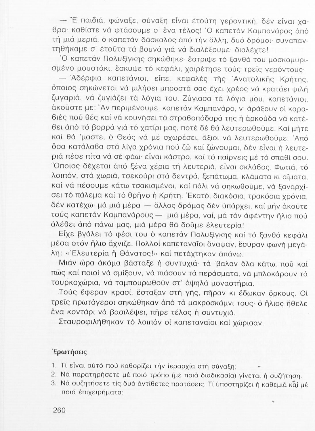Σχολικό εγχειρίδιο Νέων Ελληνικών Α΄ Γυμνασίου που περιλαμβάνει δοκίμια, πεζά και ποιήματα Ελλήνων συγγραφέων και δημοτικά τραγούδια εμπνευσμένα από τη θρησκευτική, εθνική και κοινωνική ζωή, τη "δοκιμασία της ...