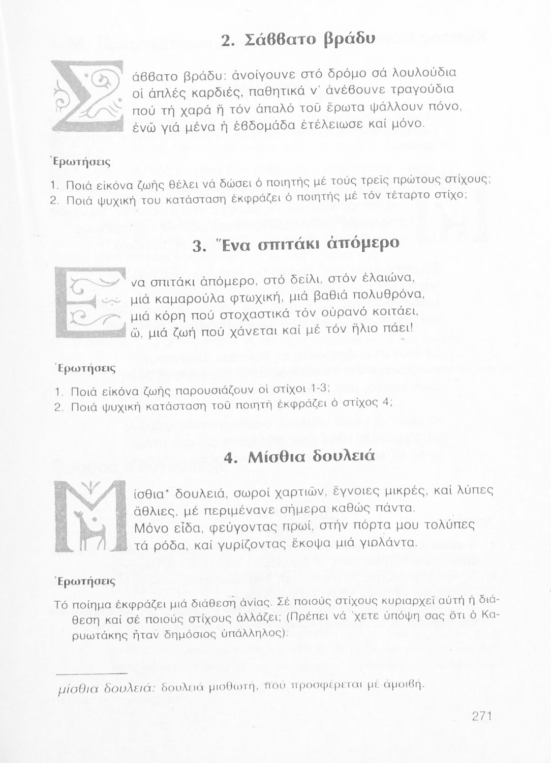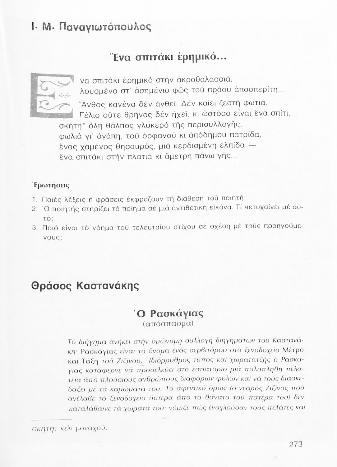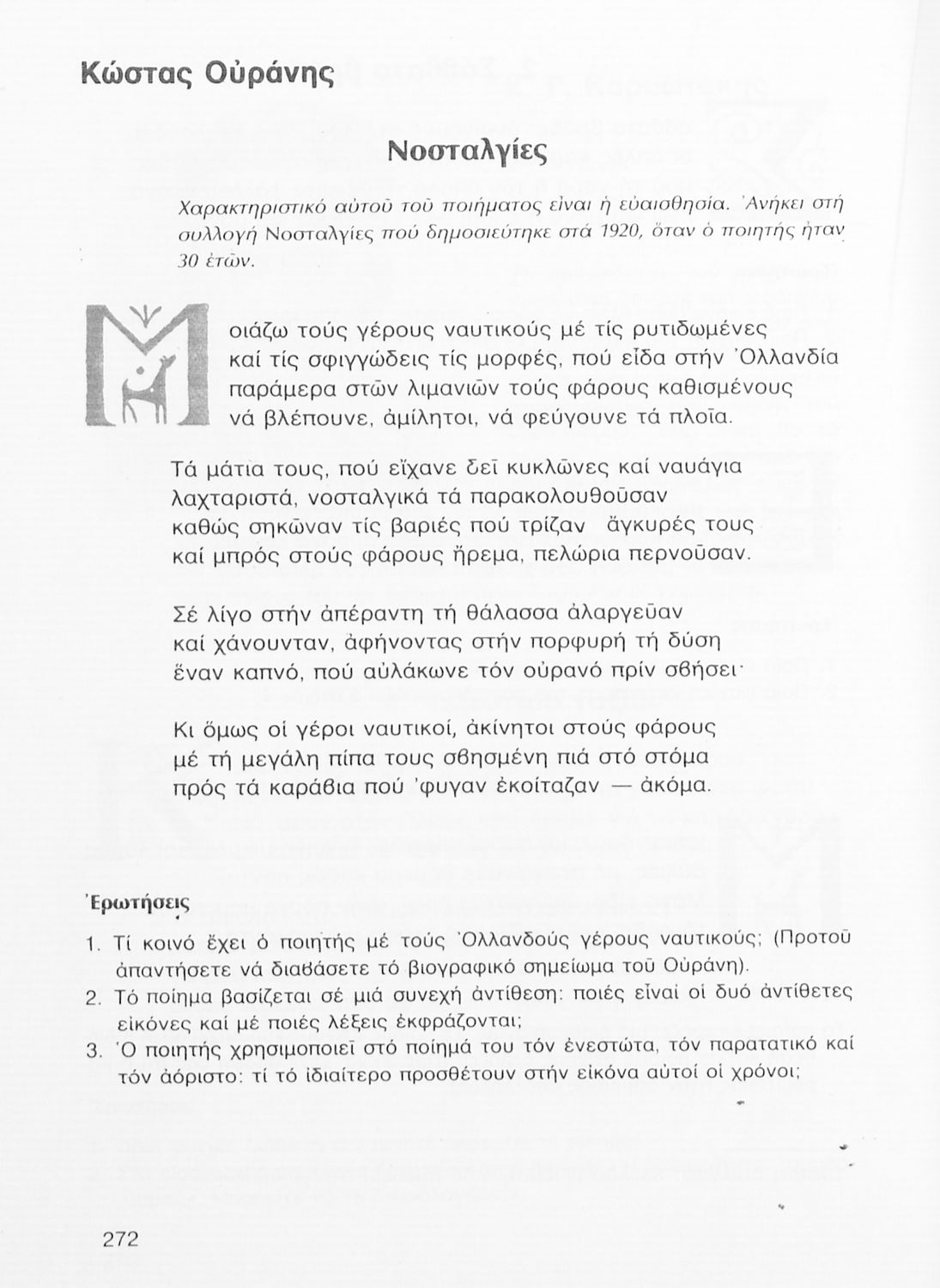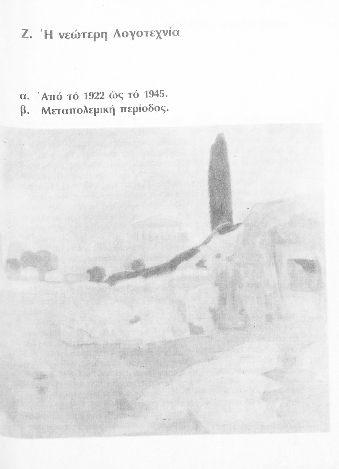 Σχολικό εγχειρίδιο Νέων Ελληνικών Γ΄ Γυμνασίου που περιλαμβάνει δημοτικά τραγούδια, και χαρακτηριστικά δείγματα της κρητικής λογοτεχνίας, της επτανησιακής και ρομαντικής σχολής, της Νέας Αθηναϊκής Σχολής και της νεότερης και μεταπολεμικής λογοτεχνίας. Περιέχει και έργα σύγχρονων ξένων συγγραφέων, βιογραφικά και εισαγωγικά σημειώματα.