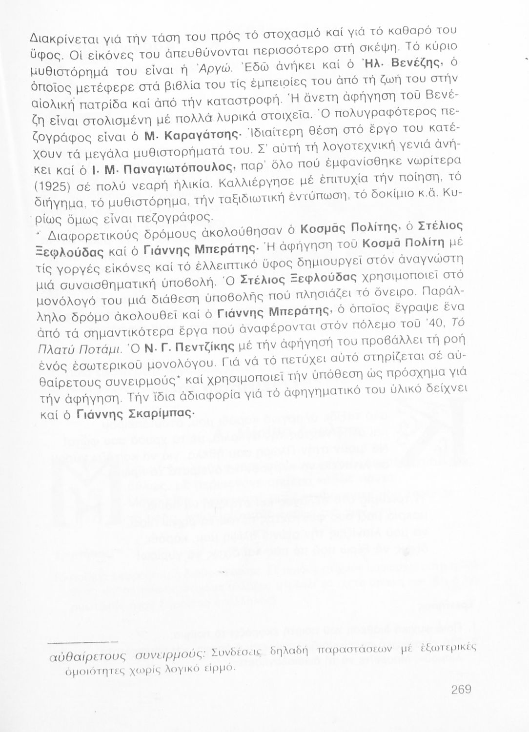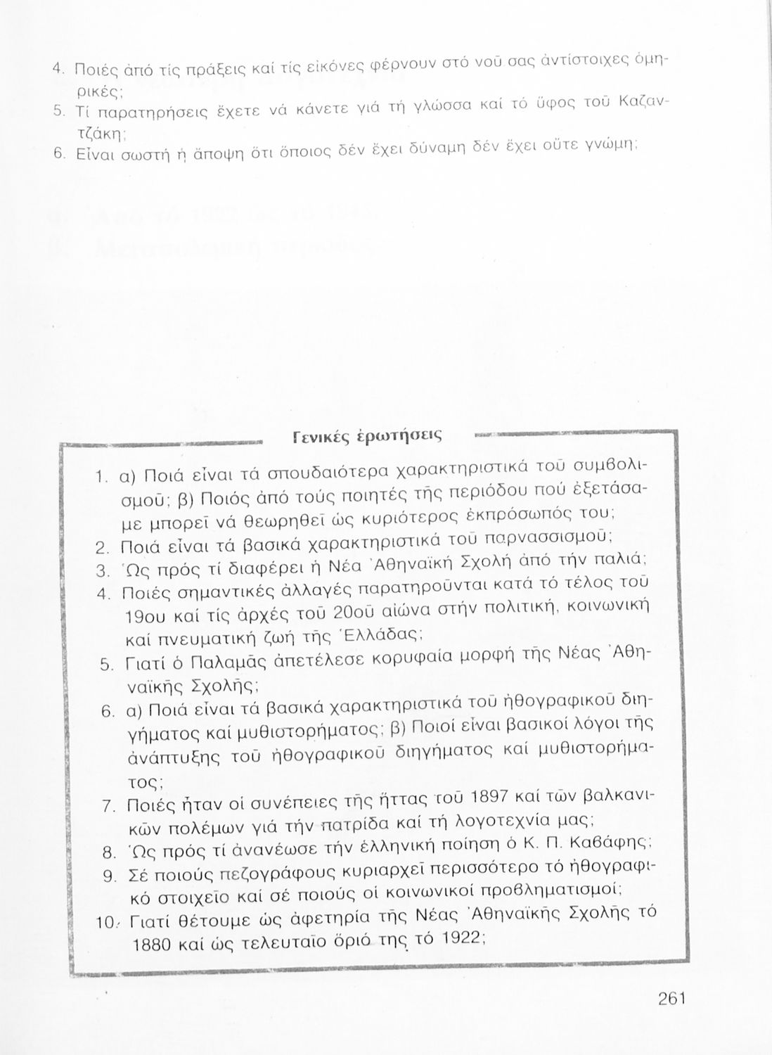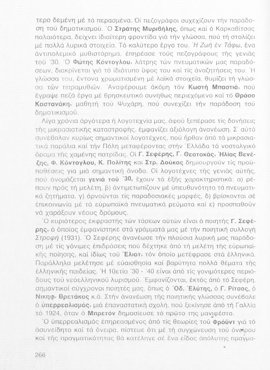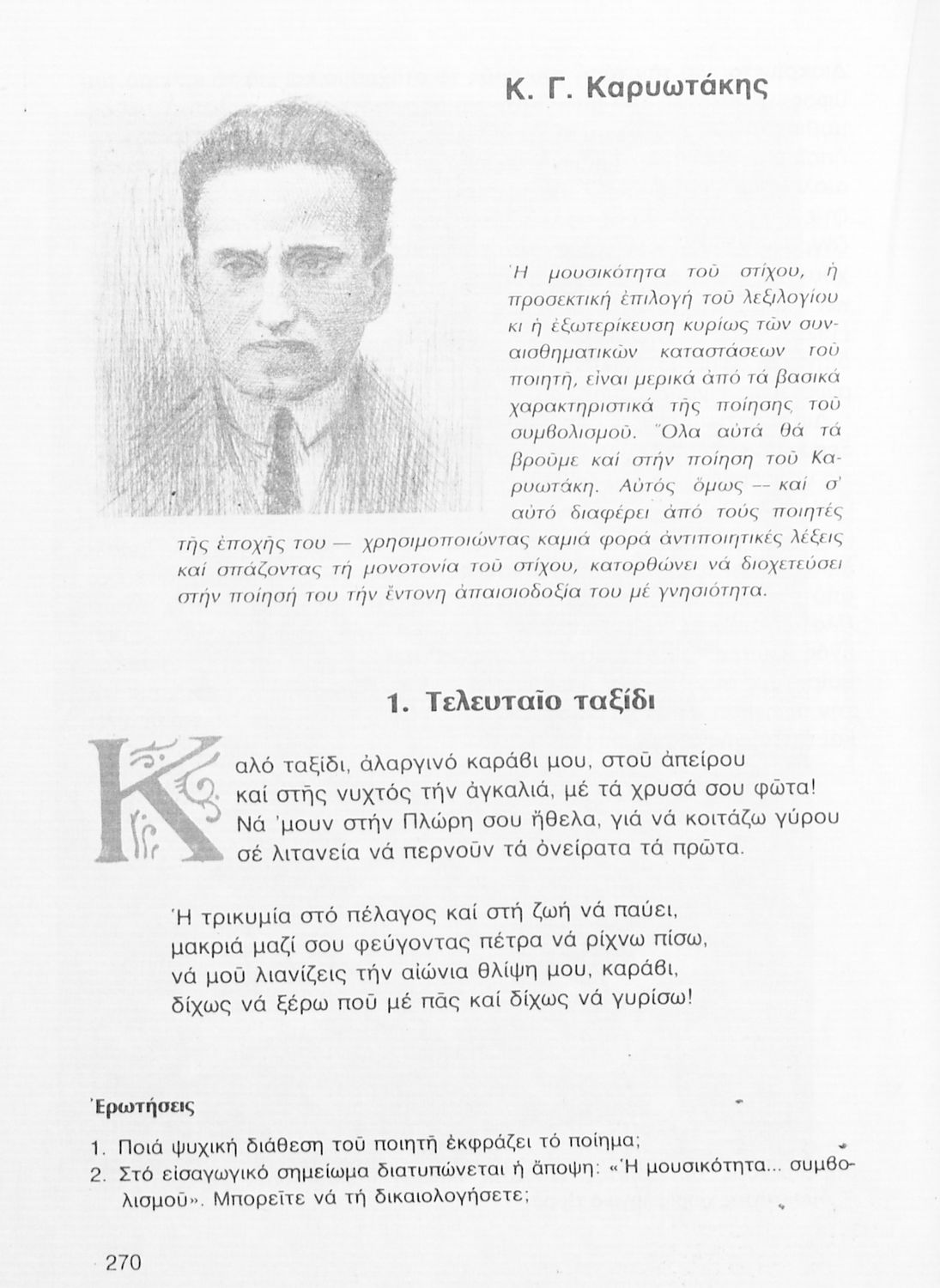 Σχολικό εγχειρίδιο Νέων Ελληνικών Γ΄ Γυμνασίου που περιλαμβάνει δημοτικά τραγούδια, και χαρακτηριστικά δείγματα της κρητικής λογοτεχνίας, της επτανησιακής και ρομαντικής σχολής, της Νέας Αθηναϊκής Σχολής και της νεότερης και μεταπολεμικής λογοτεχνίας. Περιέχει και έργα σύγχρονων ξένων συγγραφέων, βιογραφικά και εισαγωγικά σημειώματα.