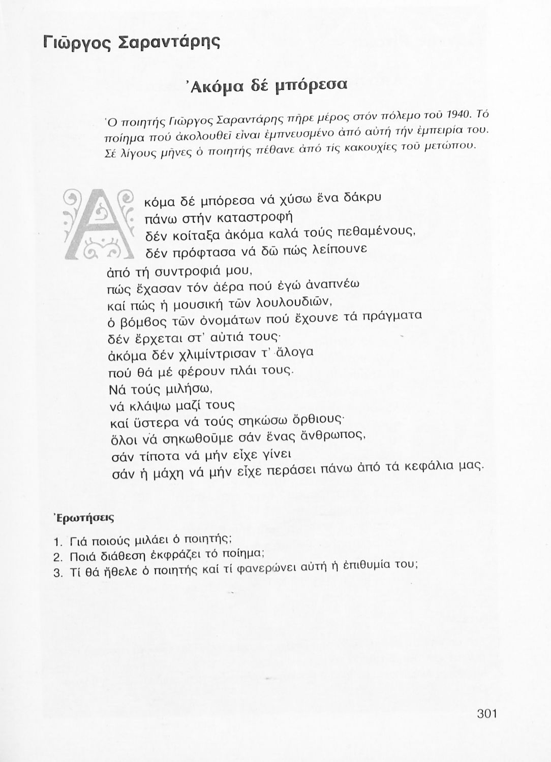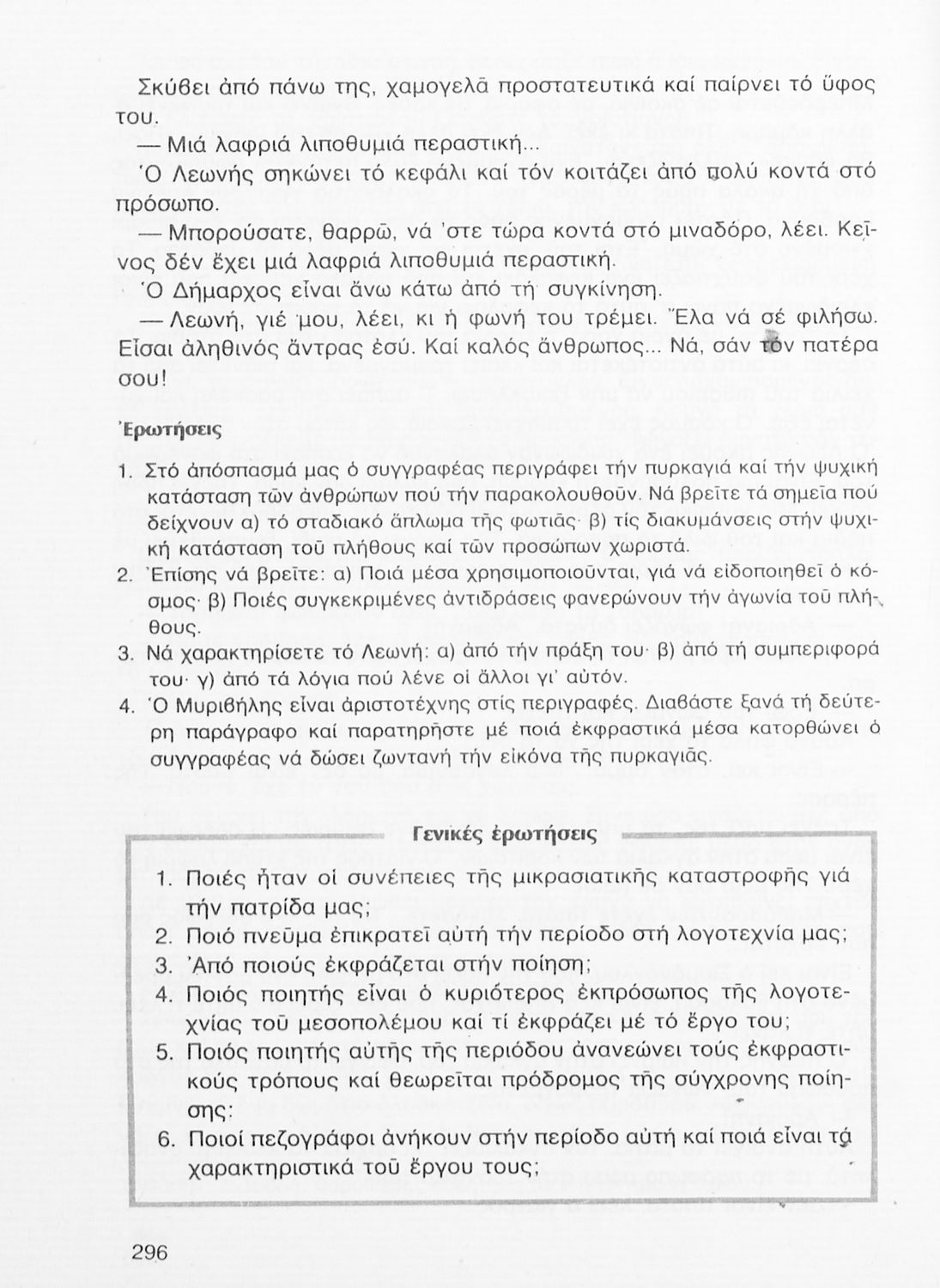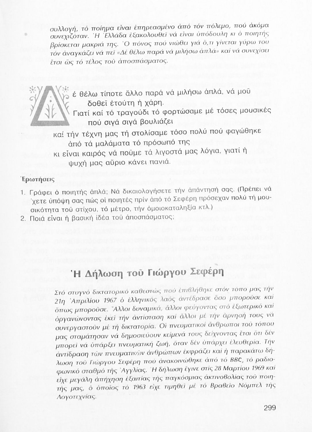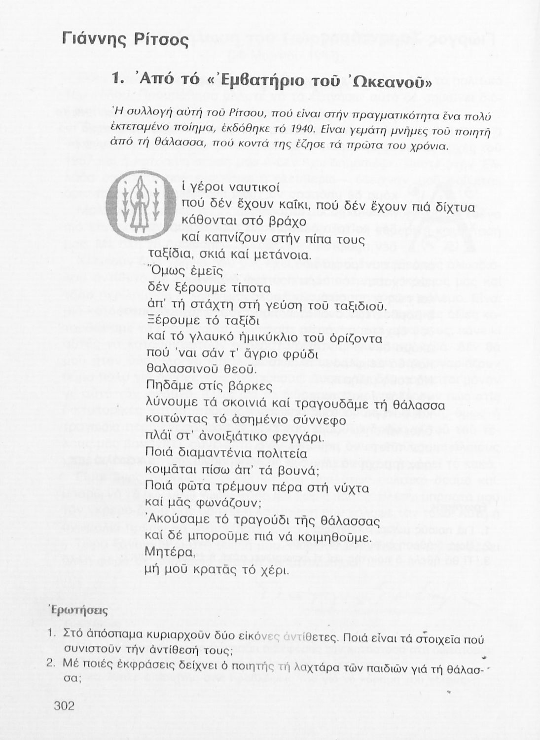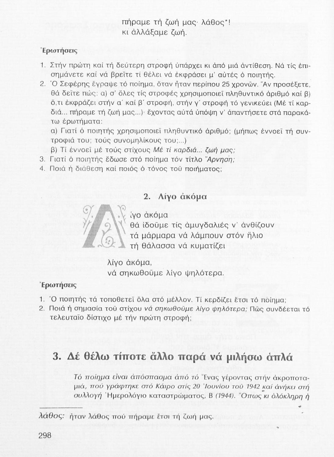 Σχολικό εγχειρίδιο Νέων Ελληνικών Γ΄ Γυμνασίου που περιλαμβάνει δημοτικά τραγούδια, και χαρακτηριστικά δείγματα της κρητικής λογοτεχνίας, της επτανησιακής και ρομαντικής σχολής, της Νέας Αθηναϊκής Σχολής και της νεότερης και μεταπολεμικής λογοτεχνίας. Περιέχει και έργα σύγχρονων ξένων συγγραφέων, βιογραφικά και εισαγωγικά σημειώματα.