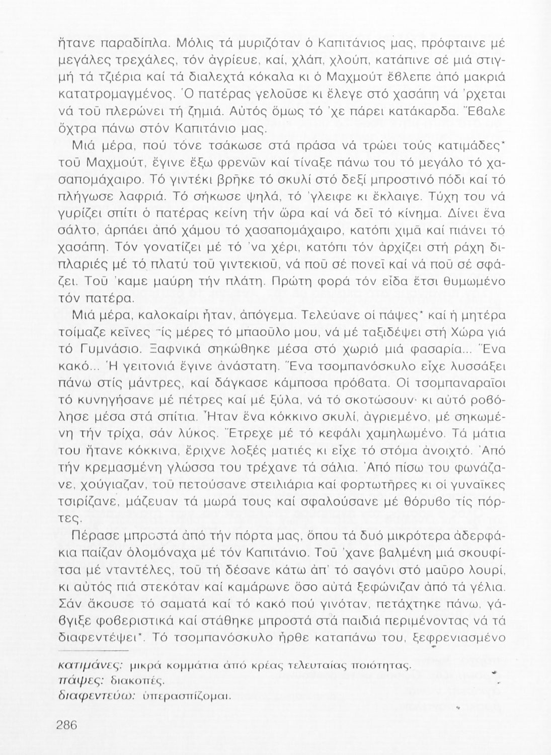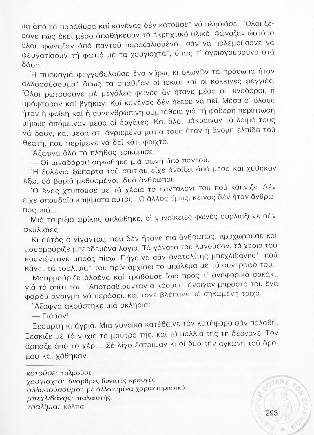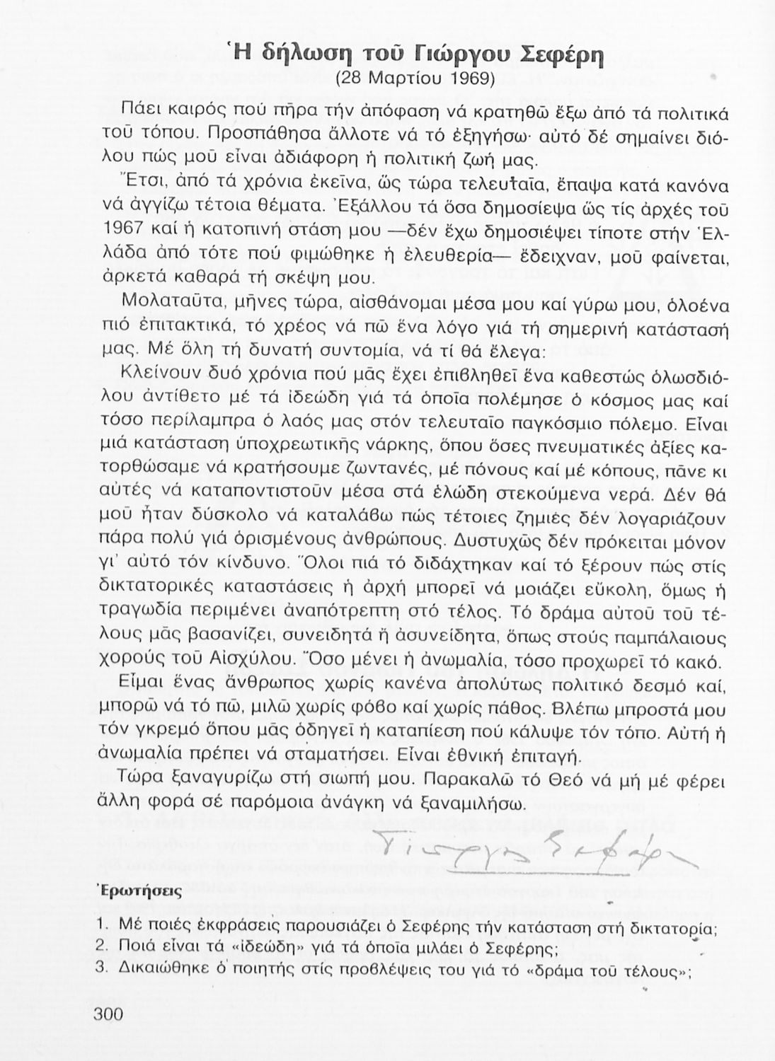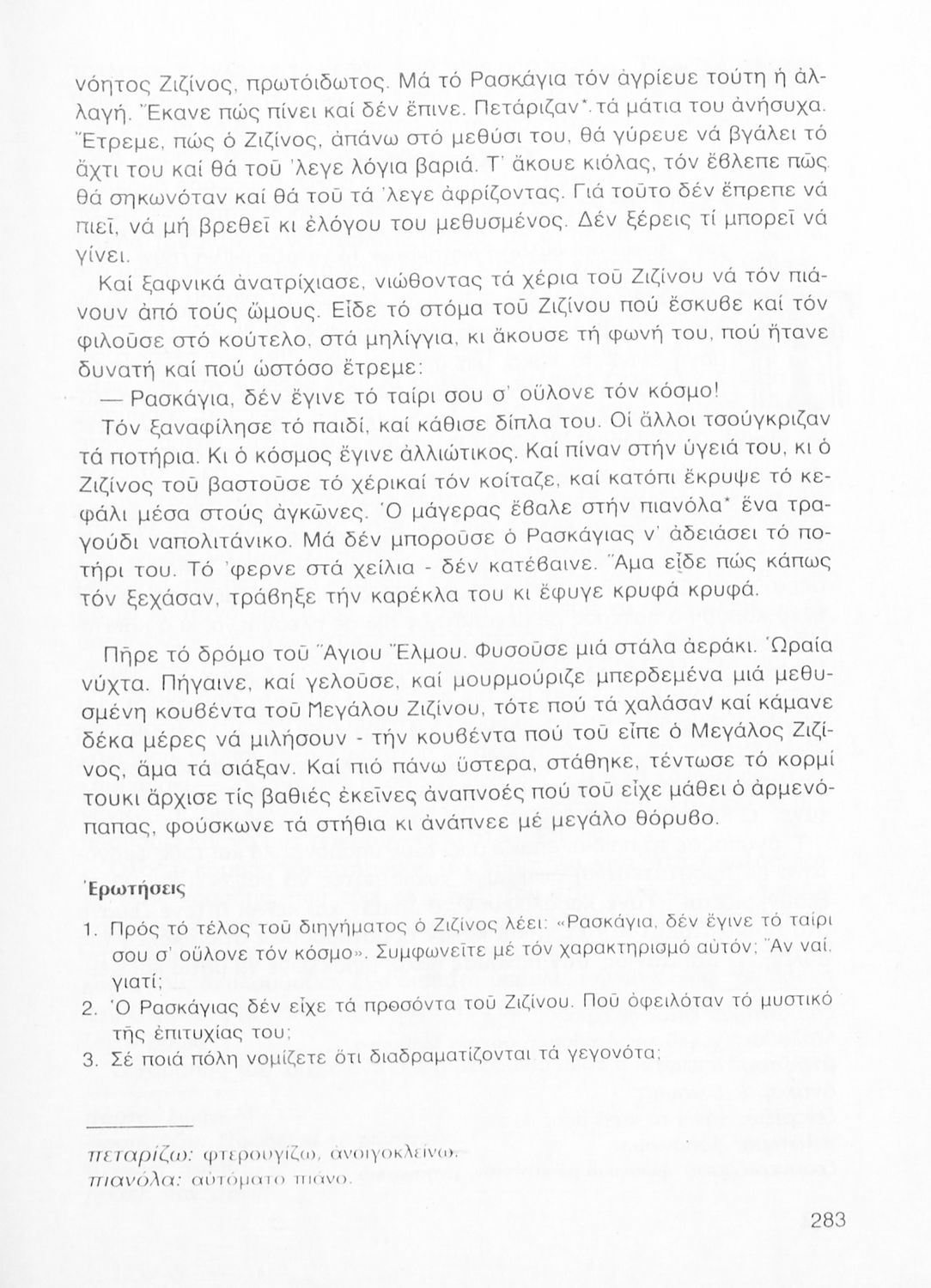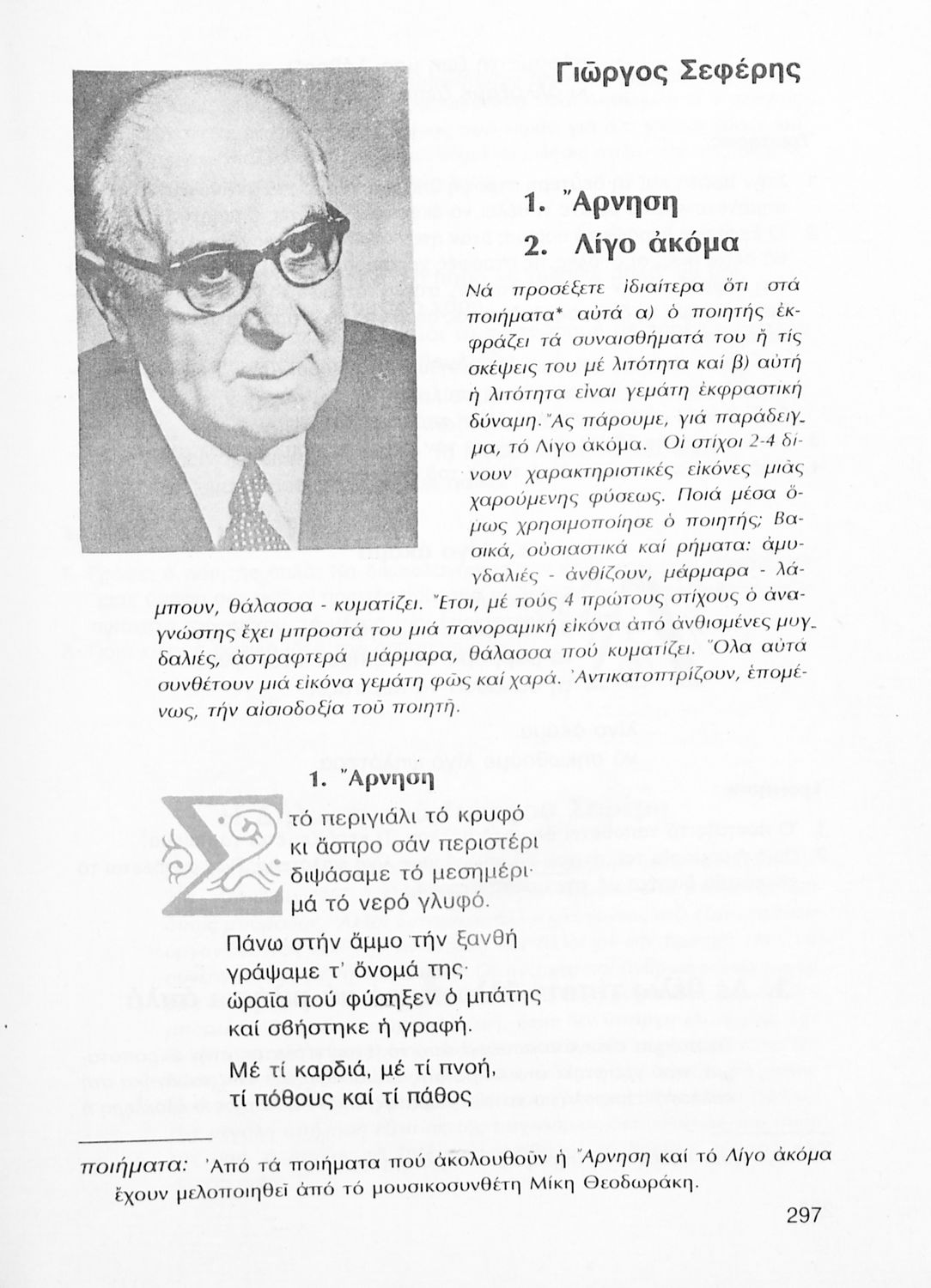 Σχολικό εγχειρίδιο Νέων Ελληνικών Γ΄ Γυμνασίου που περιλαμβάνει δημοτικά τραγούδια, και χαρακτηριστικά δείγματα της κρητικής λογοτεχνίας, της επτανησιακής και ρομαντικής σχολής, της Νέας Αθηναϊκής Σχολής και της νεότερης και μεταπολεμικής λογοτεχνίας. Περιέχει και έργα σύγχρονων ξένων συγγραφέων, βιογραφικά και εισαγωγικά σημειώματα.
