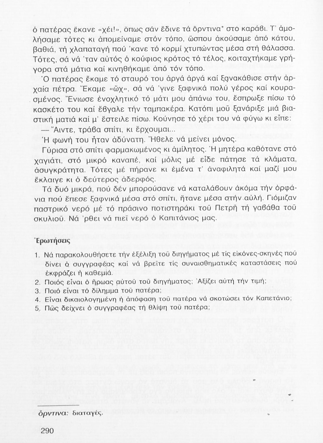 Σχολικό εγχειρίδιο Νέων Ελληνικών Α΄ Γυμνασίου που περιλαμβάνει δοκίμια, πεζά και ποιήματα Ελλήνων συγγραφέων και δημοτικά τραγούδια εμπνευσμένα από τη θρησκευτική, εθνική και κοινωνική ζωή, τη "δοκιμασία της ...