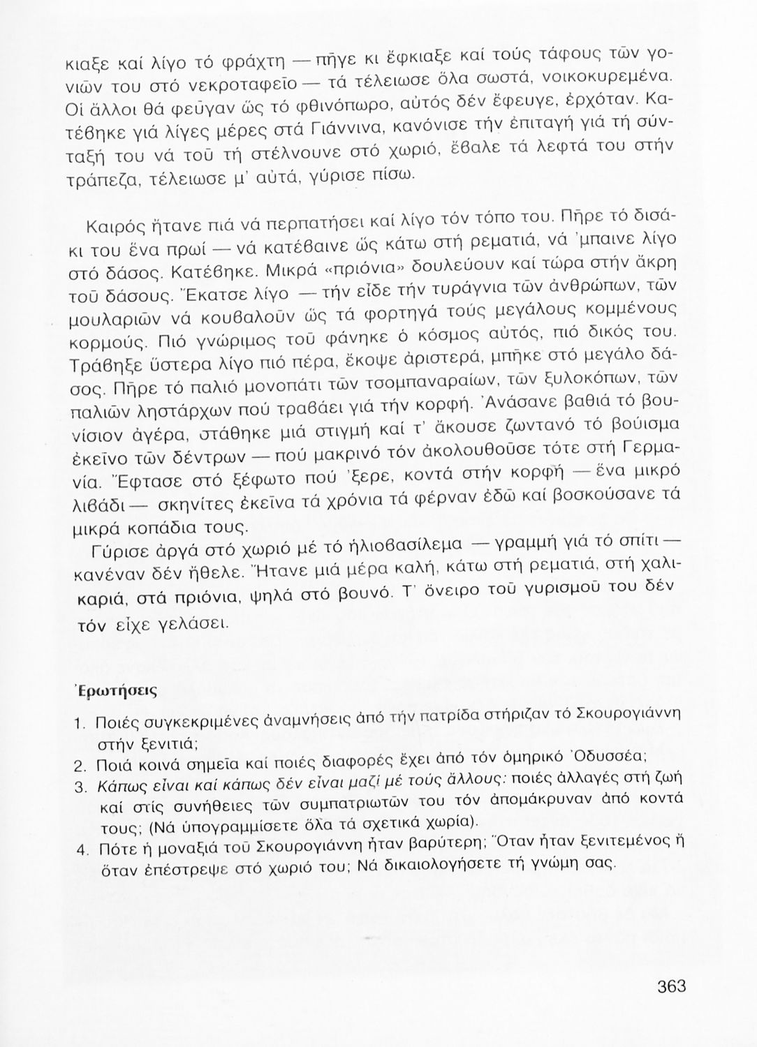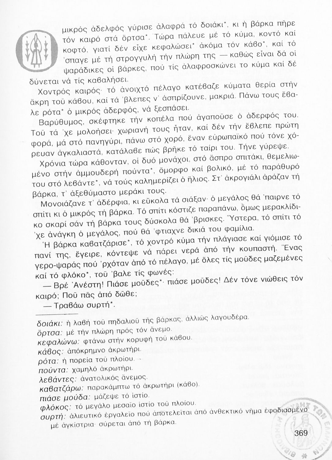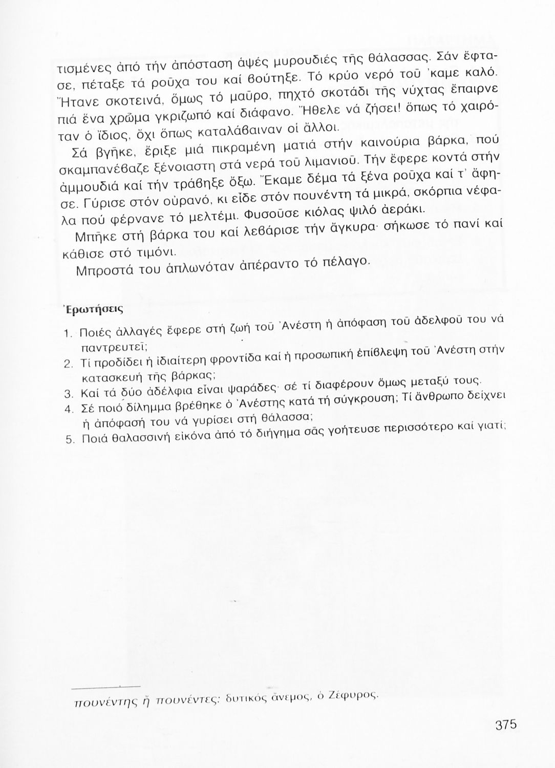 Σχολικό εγχειρίδιο Νέων Ελληνικών Α΄ Γυμνασίου που περιλαμβάνει δοκίμια, πεζά και ποιήματα Ελλήνων συγγραφέων και δημοτικά τραγούδια εμπνευσμένα από τη θρησκευτική, εθνική και κοινωνική ζωή, τη "δοκιμασία της ...
