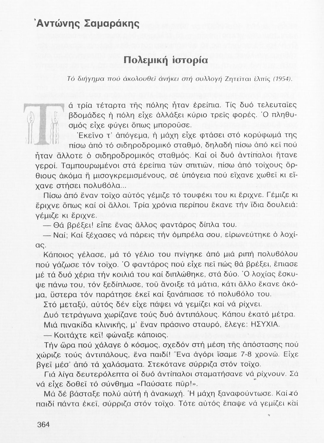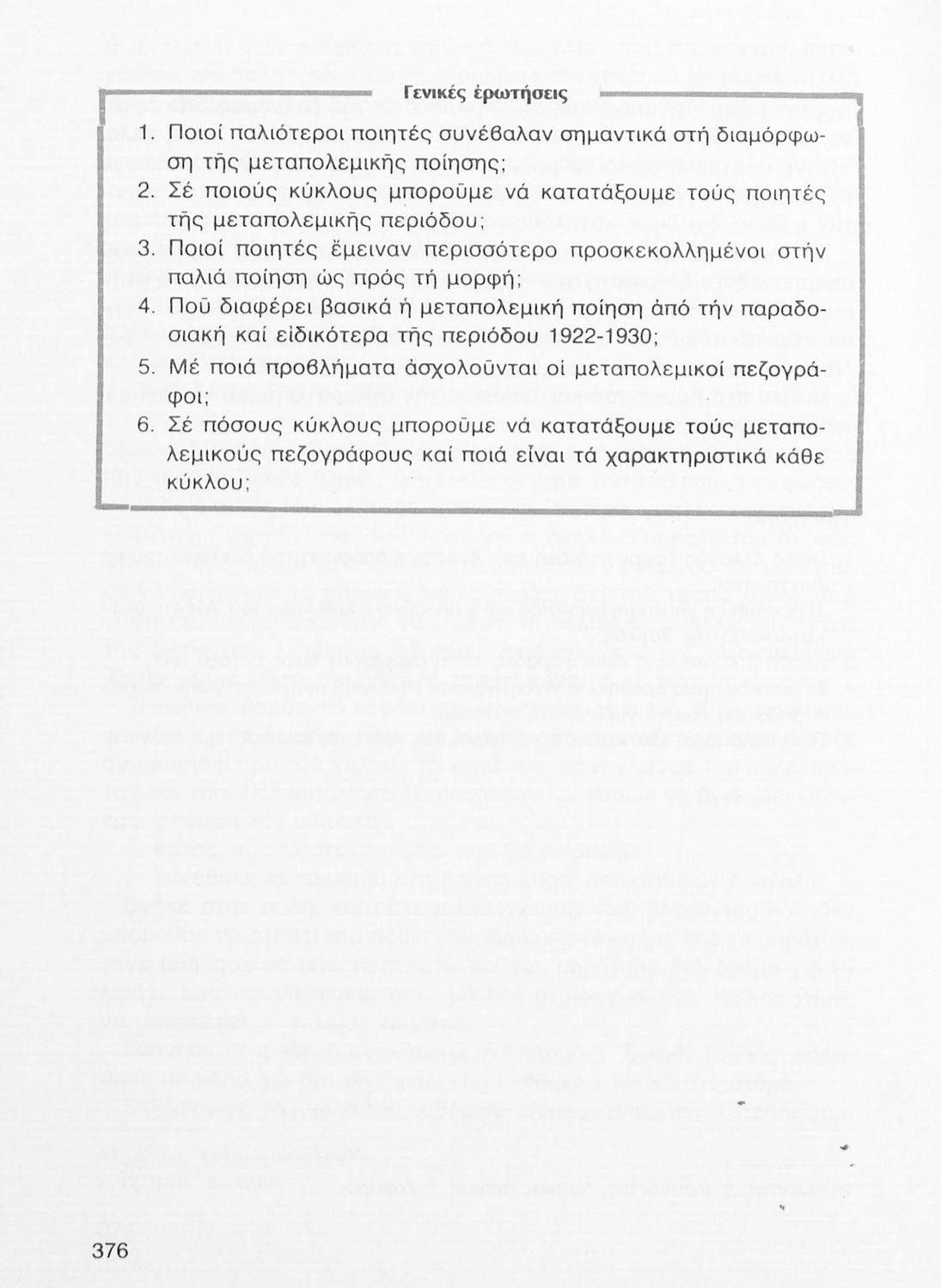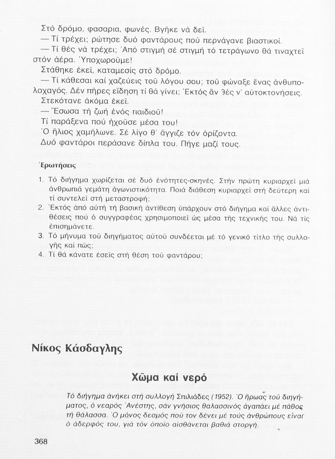 Σχολικό εγχειρίδιο Νέων Ελληνικών Γ΄ Γυμνασίου που περιλαμβάνει δημοτικά τραγούδια, και χαρακτηριστικά δείγματα της κρητικής λογοτεχνίας, της επτανησιακής και ρομαντικής σχολής, της Νέας Αθηναϊκής Σχολής και της νεότερης και μεταπολεμικής λογοτεχνίας. Περιέχει και έργα σύγχρονων ξένων συγγραφέων, βιογραφικά και εισαγωγικά σημειώματα.