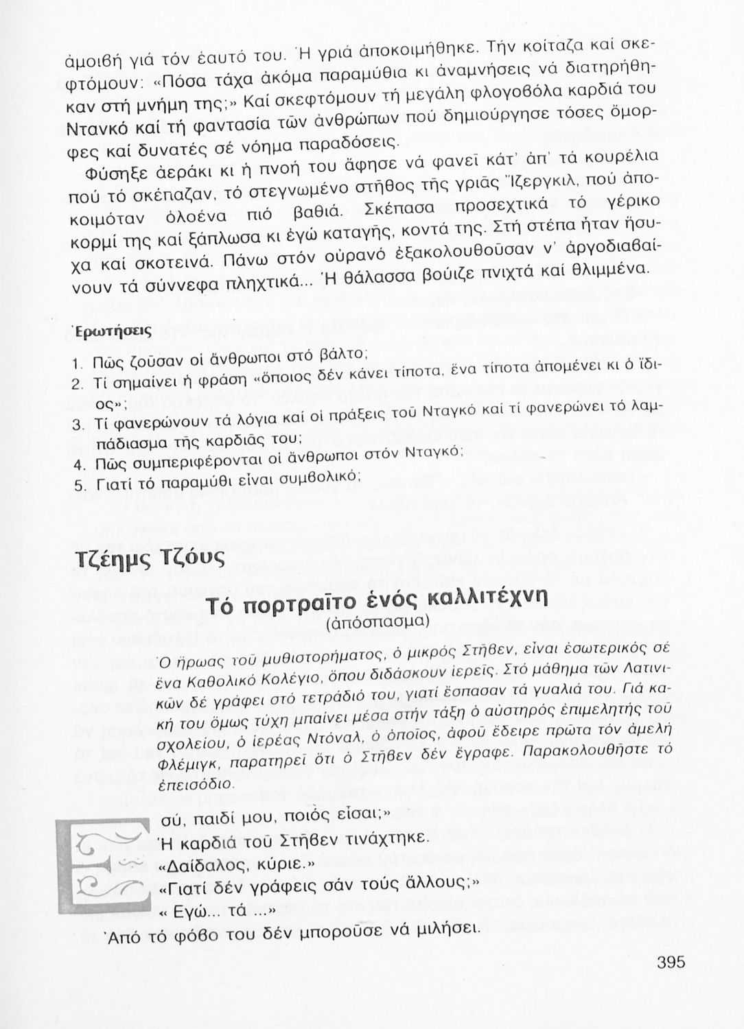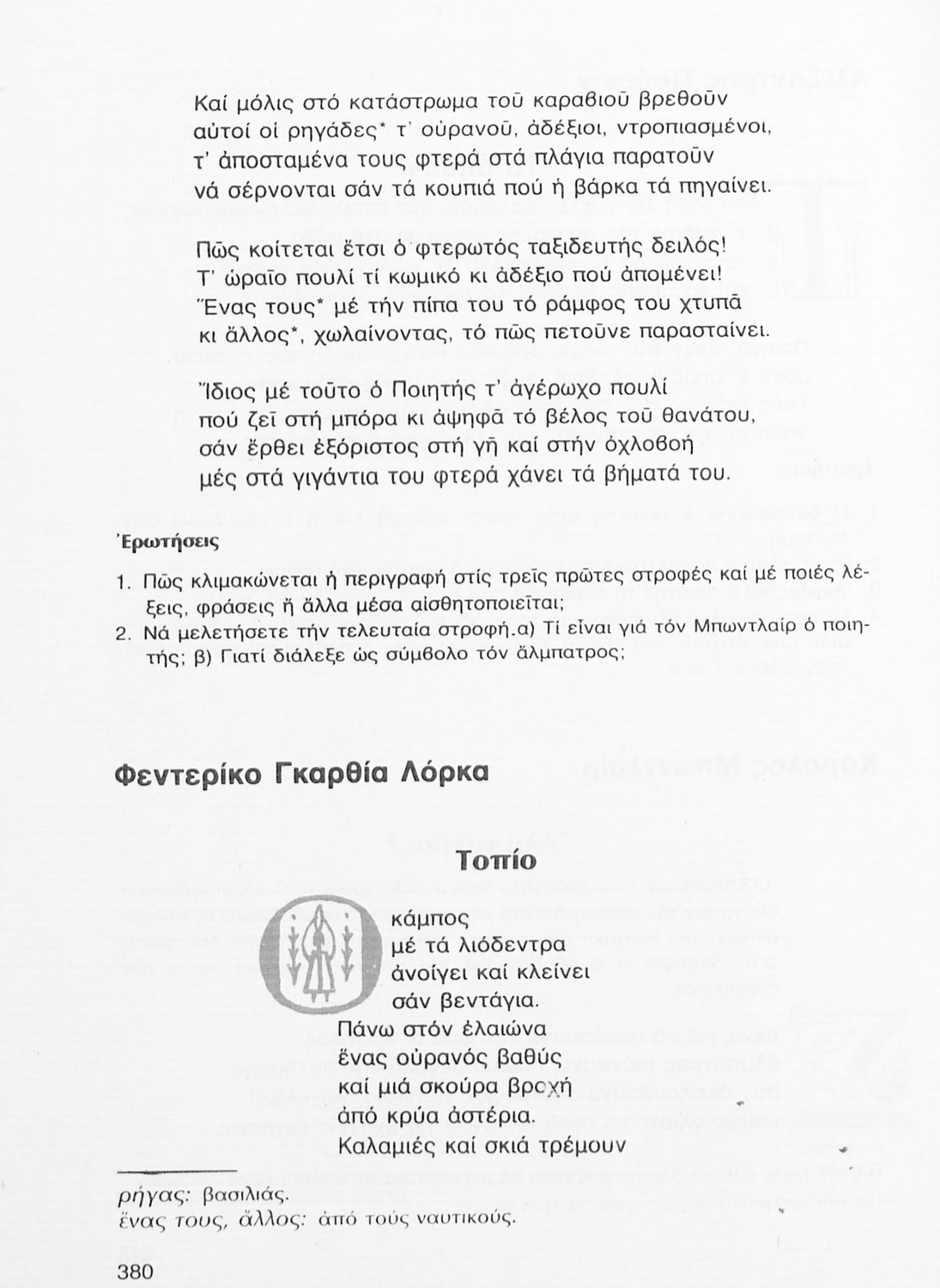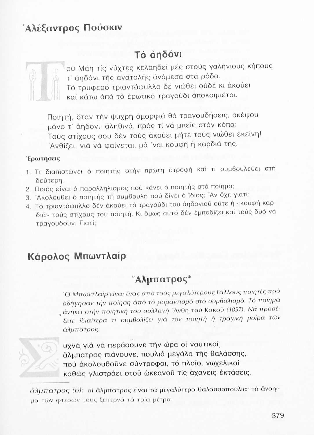 Σχολικό εγχειρίδιο Νέων Ελληνικών Γ΄ Γυμνασίου που περιλαμβάνει δημοτικά τραγούδια, και χαρακτηριστικά δείγματα της κρητικής λογοτεχνίας, της επτανησιακής και ρομαντικής σχολής, της Νέας Αθηναϊκής Σχολής και της νεότερης και μεταπολεμικής λογοτεχνίας. Περιέχει και έργα σύγχρονων ξένων συγγραφέων, βιογραφικά και εισαγωγικά σημειώματα.