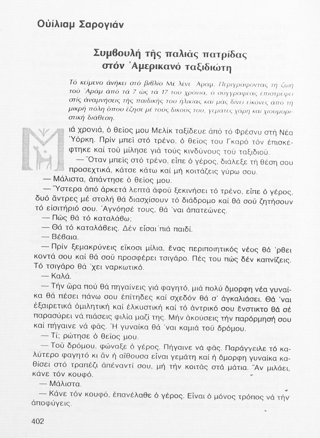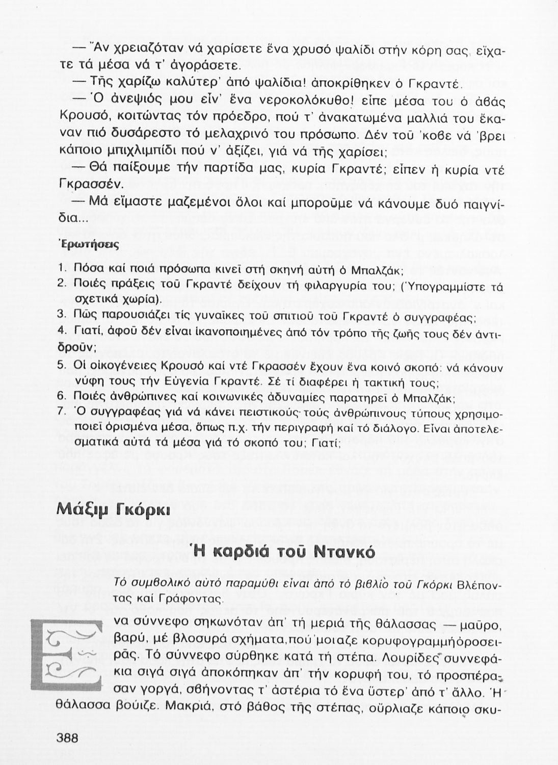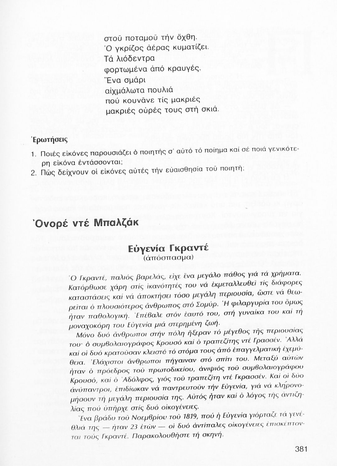 Σχολικό εγχειρίδιο Νέων Ελληνικών Γ΄ Γυμνασίου που περιλαμβάνει δημοτικά τραγούδια, και χαρακτηριστικά δείγματα της κρητικής λογοτεχνίας, της επτανησιακής και ρομαντικής σχολής, της Νέας Αθηναϊκής Σχολής και της νεότερης και μεταπολεμικής λογοτεχνίας. Περιέχει και έργα σύγχρονων ξένων συγγραφέων, βιογραφικά και εισαγωγικά σημειώματα.