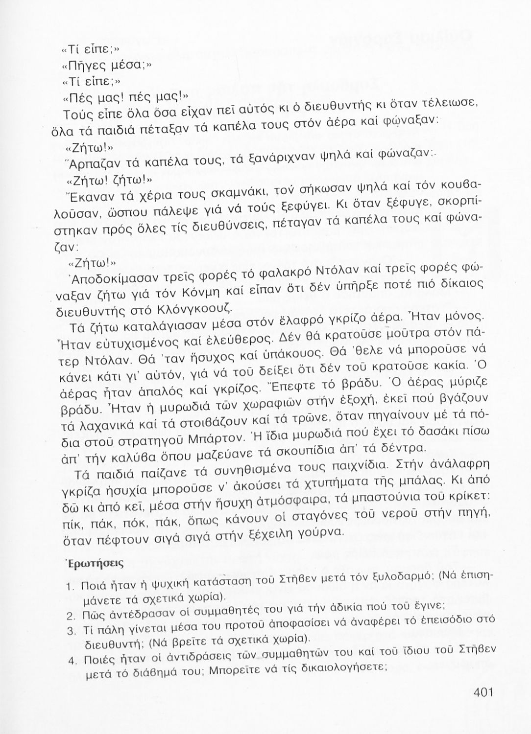 Σχολικό εγχειρίδιο Νέων Ελληνικών Α΄ Γυμνασίου που περιλαμβάνει δοκίμια, πεζά και ποιήματα Ελλήνων συγγραφέων και δημοτικά τραγούδια εμπνευσμένα από τη θρησκευτική, εθνική και κοινωνική ζωή, τη "δοκιμασία της ...