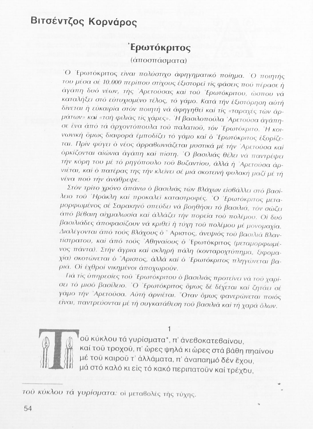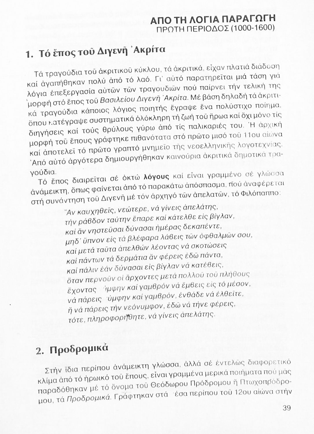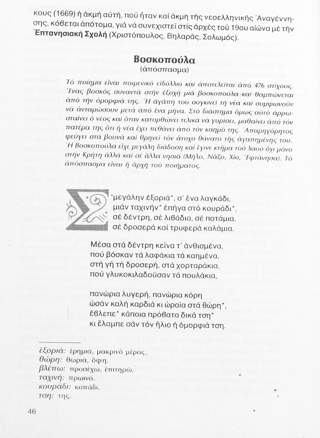 Σχολικό εγχειρίδιο Νέων Ελληνικών Γ΄ Γυμνασίου που περιλαμβάνει δημοτικά τραγούδια, και χαρακτηριστικά δείγματα της κρητικής λογοτεχνίας, της επτανησιακής και ρομαντικής σχολής, της Νέας Αθηναϊκής Σχολής και της νεότερης και μεταπολεμικής λογοτεχνίας. Περιέχει και έργα σύγχρονων ξένων συγγραφέων, βιογραφικά και εισαγωγικά σημειώματα.