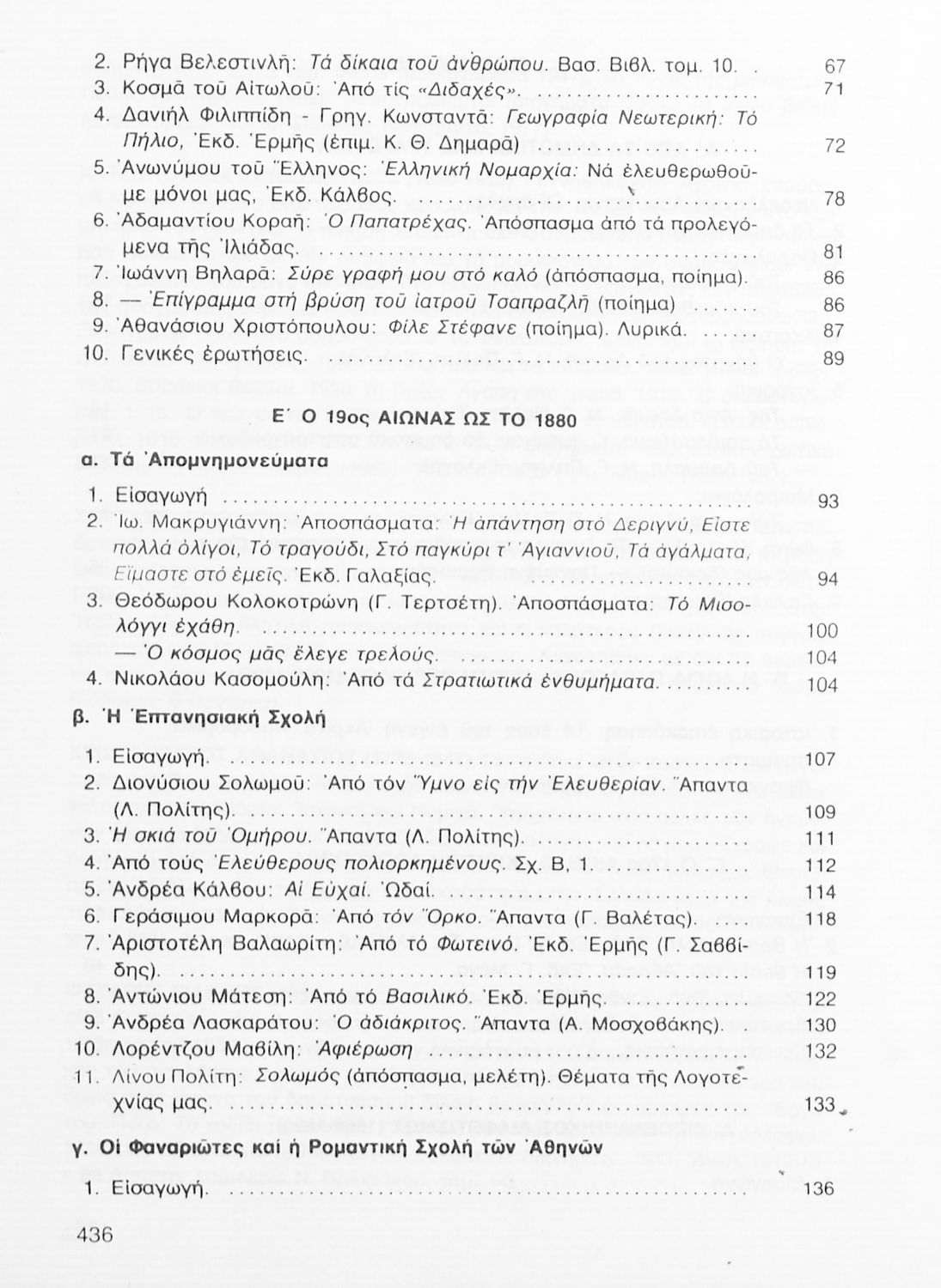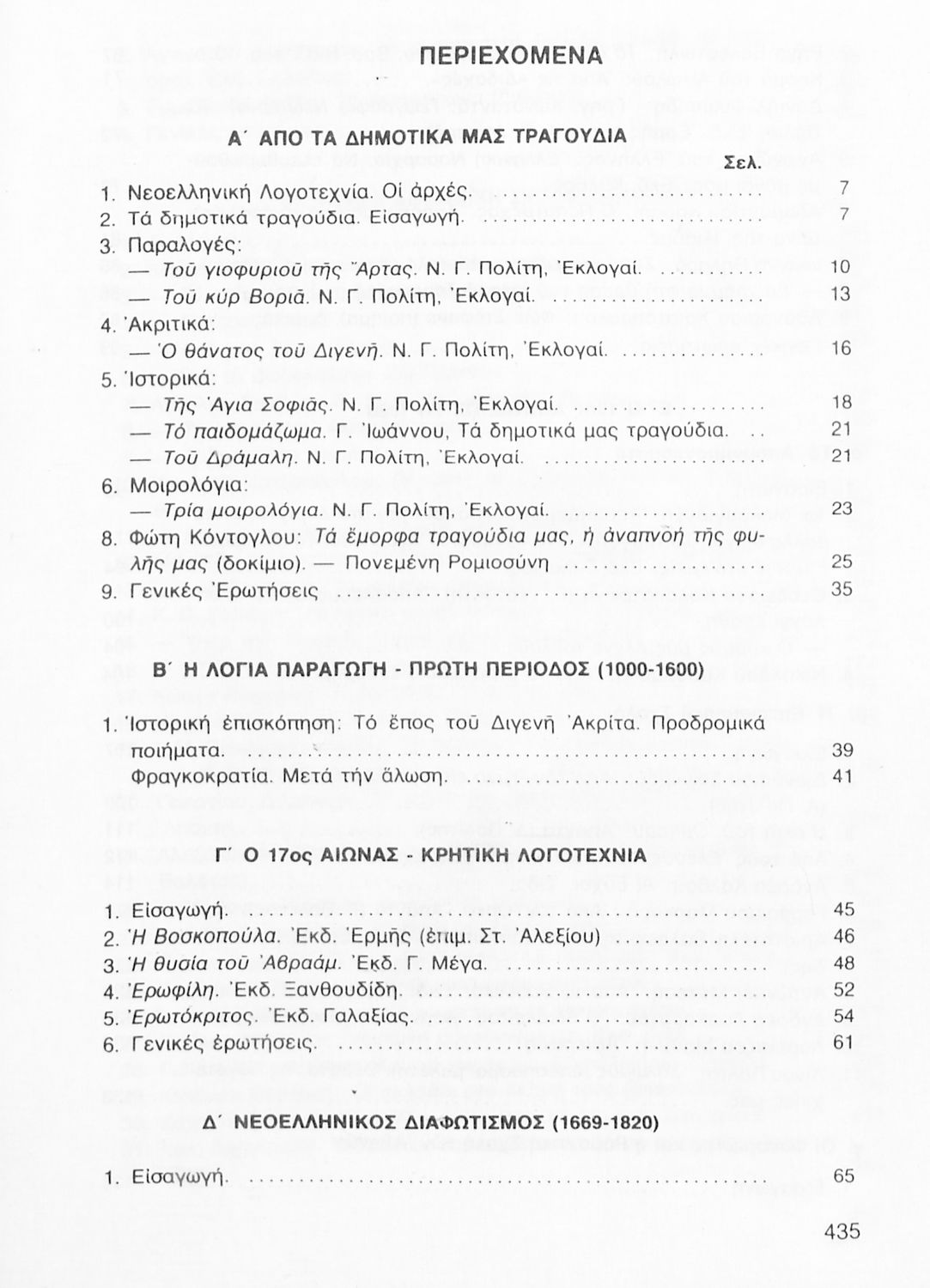 Σχολικό εγχειρίδιο Νέων Ελληνικών Γ΄ Γυμνασίου που περιλαμβάνει δημοτικά τραγούδια, και χαρακτηριστικά δείγματα της κρητικής λογοτεχνίας, της επτανησιακής και ρομαντικής σχολής, της Νέας Αθηναϊκής Σχολής και της νεότερης και μεταπολεμικής λογοτεχνίας. Περιέχει και έργα σύγχρονων ξένων συγγραφέων, βιογραφικά και εισαγωγικά σημειώματα.