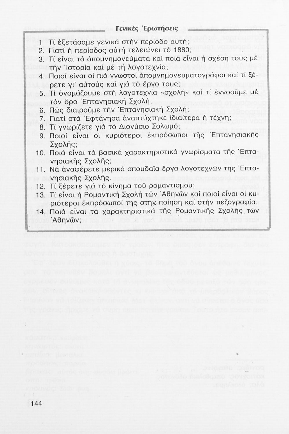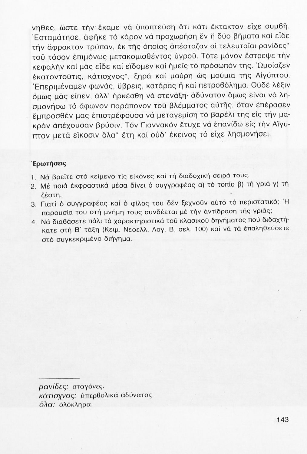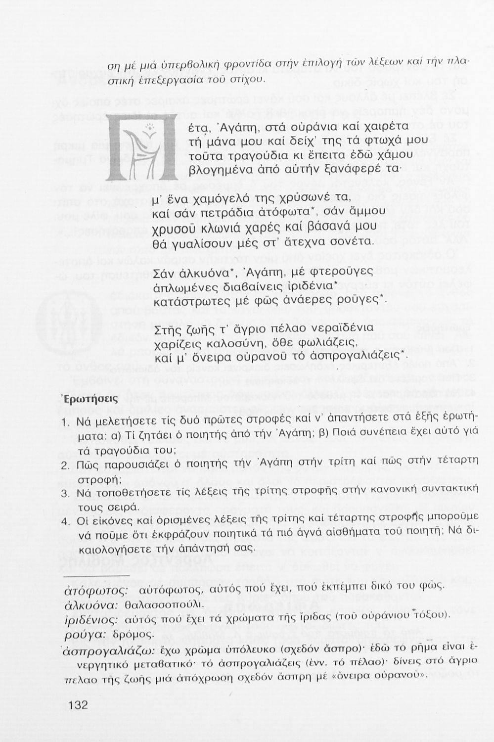 Σχολικό εγχειρίδιο Νέων Ελληνικών Γ΄ Γυμνασίου που περιλαμβάνει δημοτικά τραγούδια, και χαρακτηριστικά δείγματα της κρητικής λογοτεχνίας, της επτανησιακής και ρομαντικής σχολής, της Νέας Αθηναϊκής Σχολής και της νεότερης και μεταπολεμικής λογοτεχνίας. Περιέχει και έργα σύγχρονων ξένων συγγραφέων, βιογραφικά και εισαγωγικά σημειώματα.