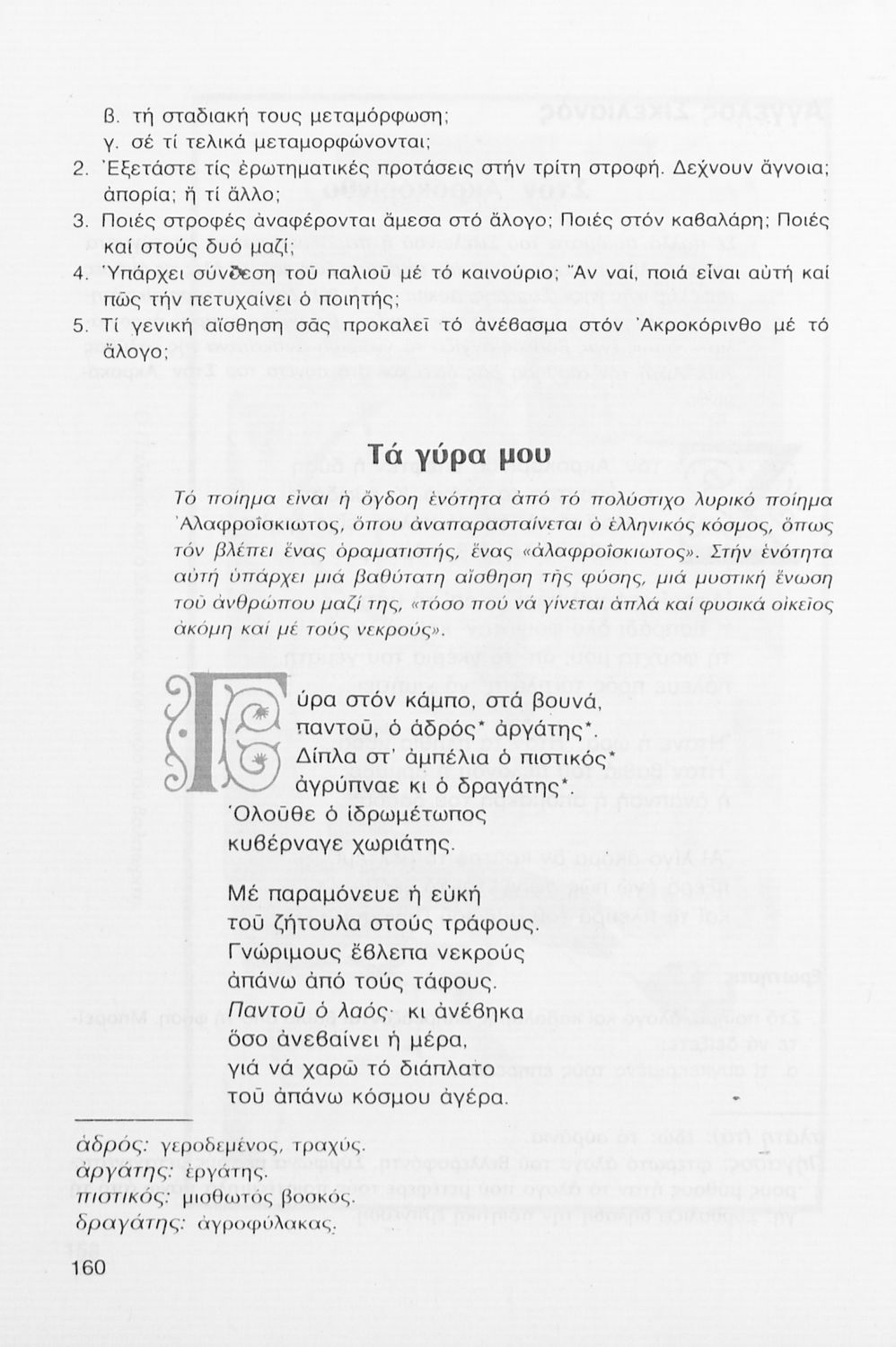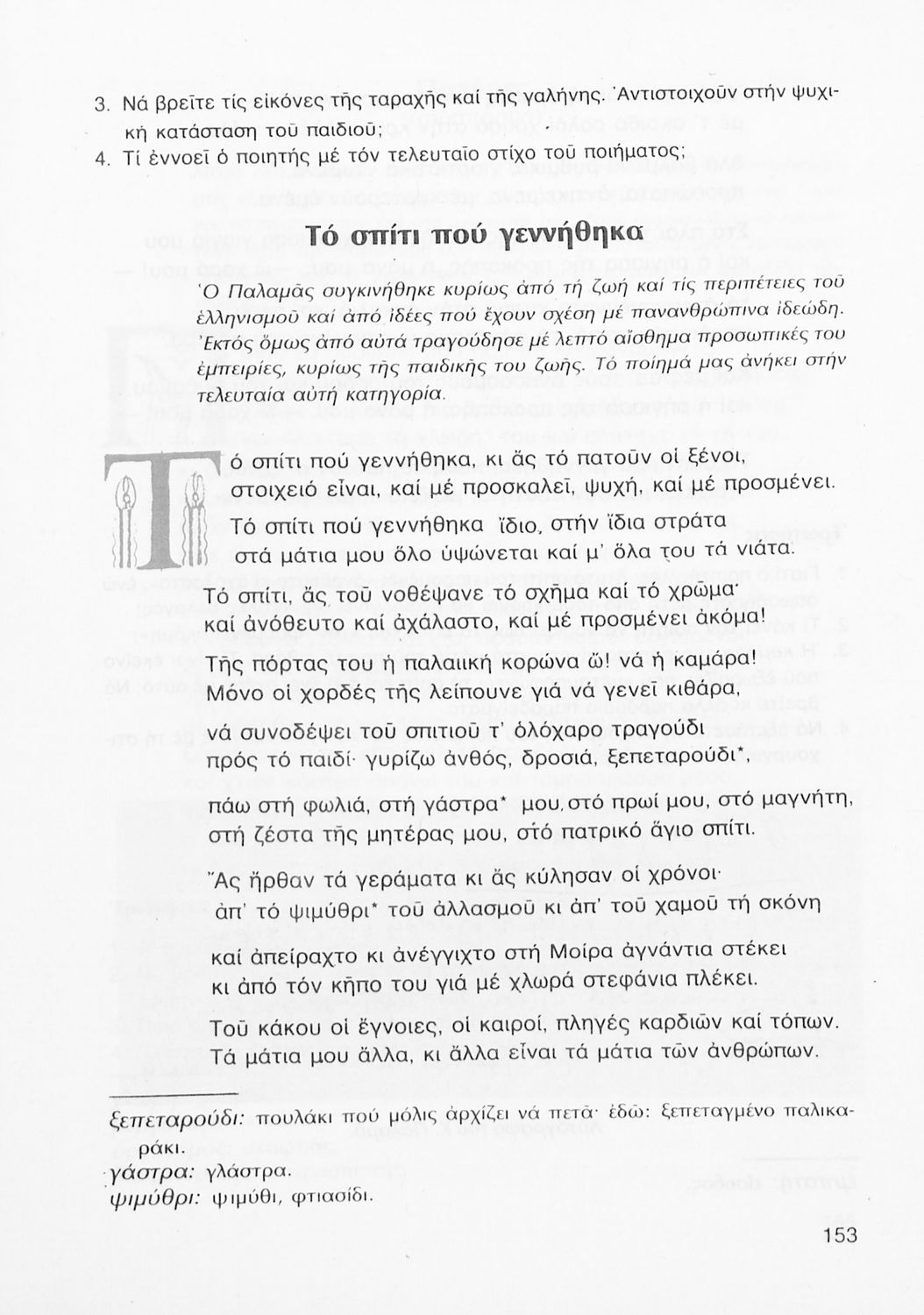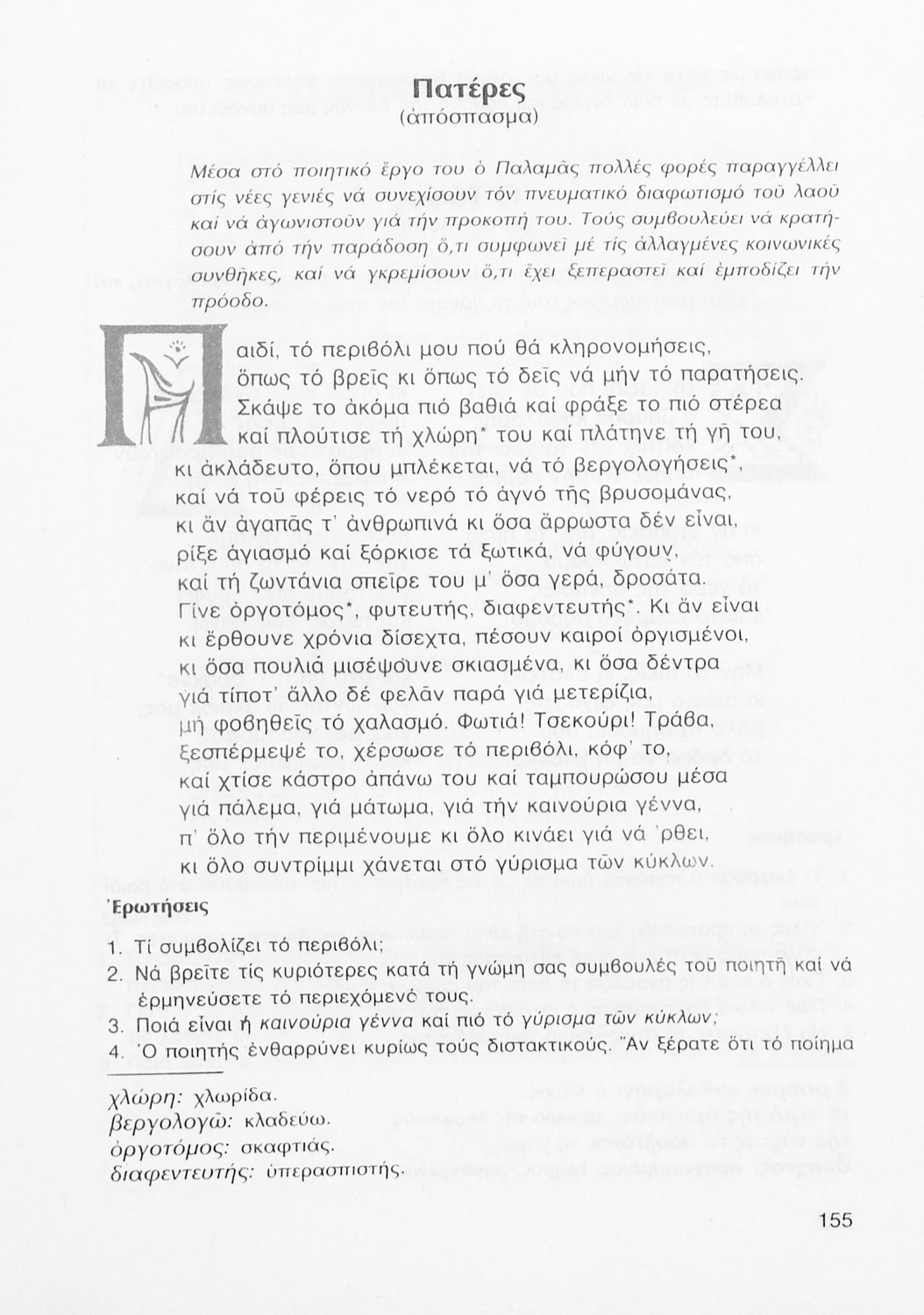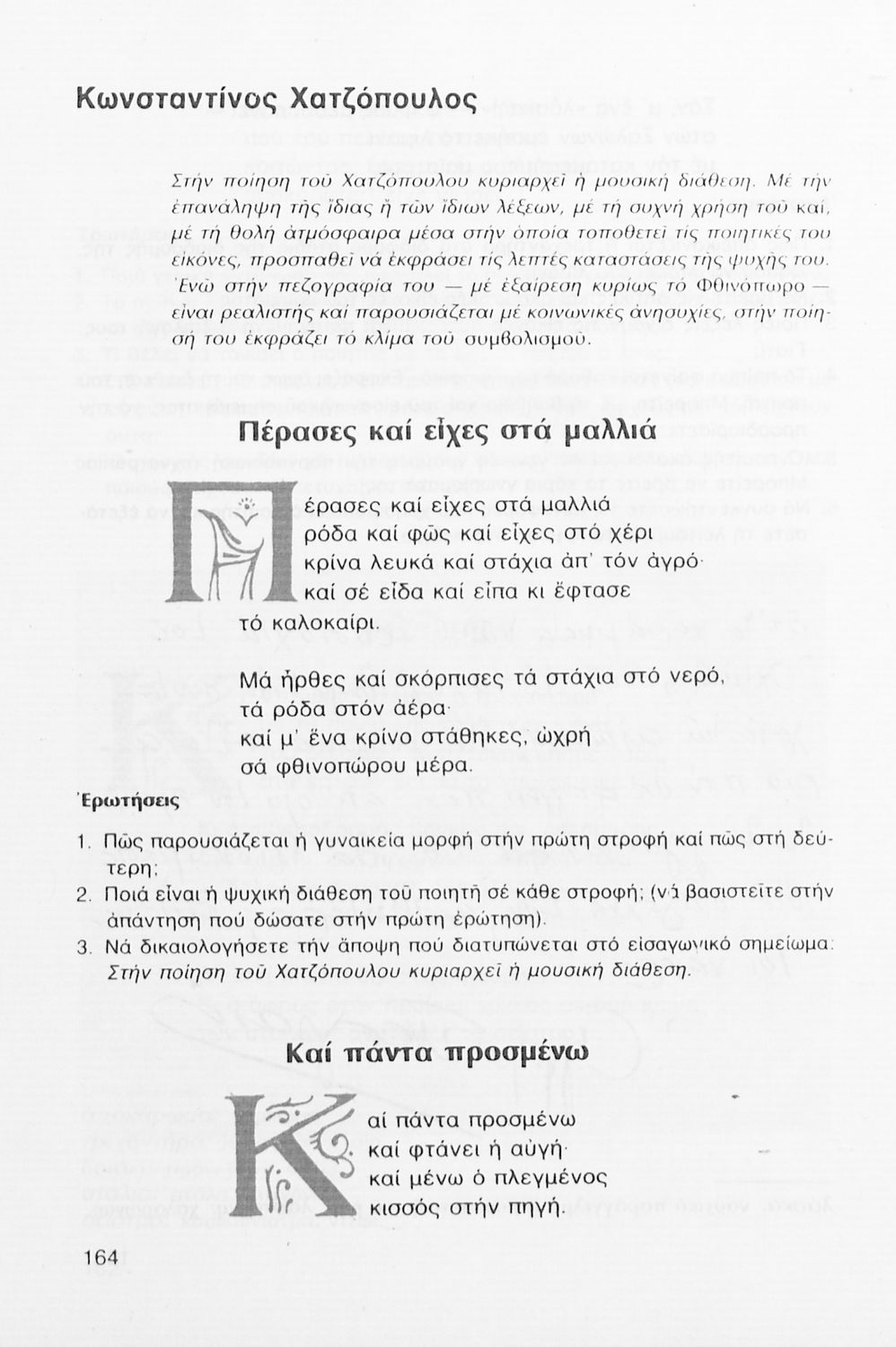 Σχολικό εγχειρίδιο Νέων Ελληνικών Γ΄ Γυμνασίου που περιλαμβάνει δημοτικά τραγούδια, και χαρακτηριστικά δείγματα της κρητικής λογοτεχνίας, της επτανησιακής και ρομαντικής σχολής, της Νέας Αθηναϊκής Σχολής και της νεότερης και μεταπολεμικής λογοτεχνίας. Περιέχει και έργα σύγχρονων ξένων συγγραφέων, βιογραφικά και εισαγωγικά σημειώματα.
