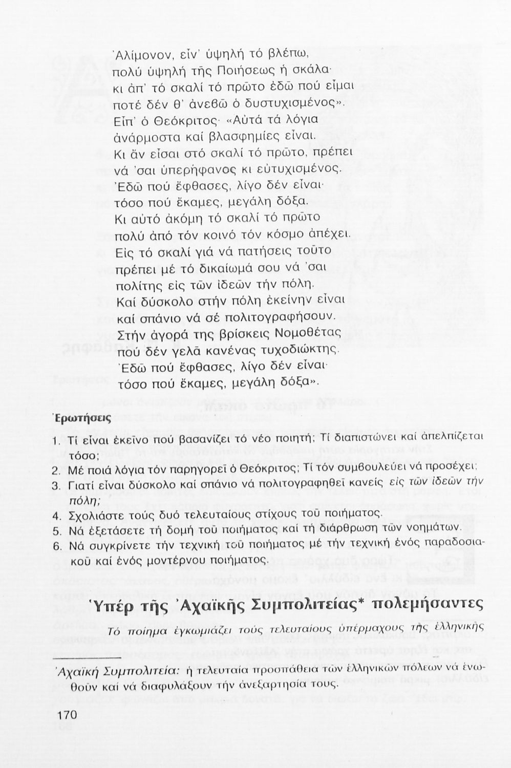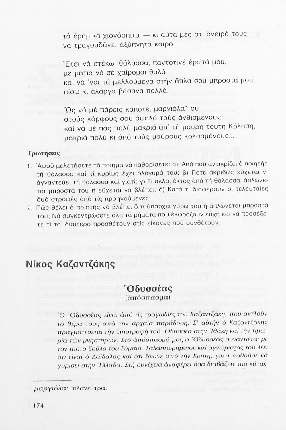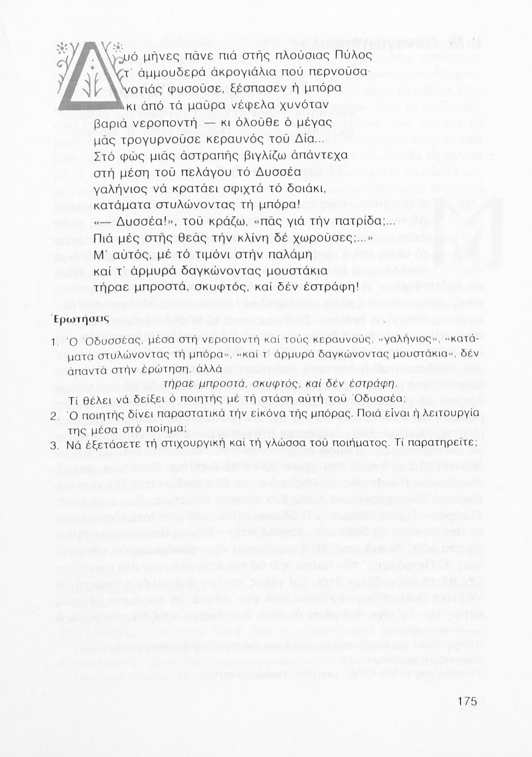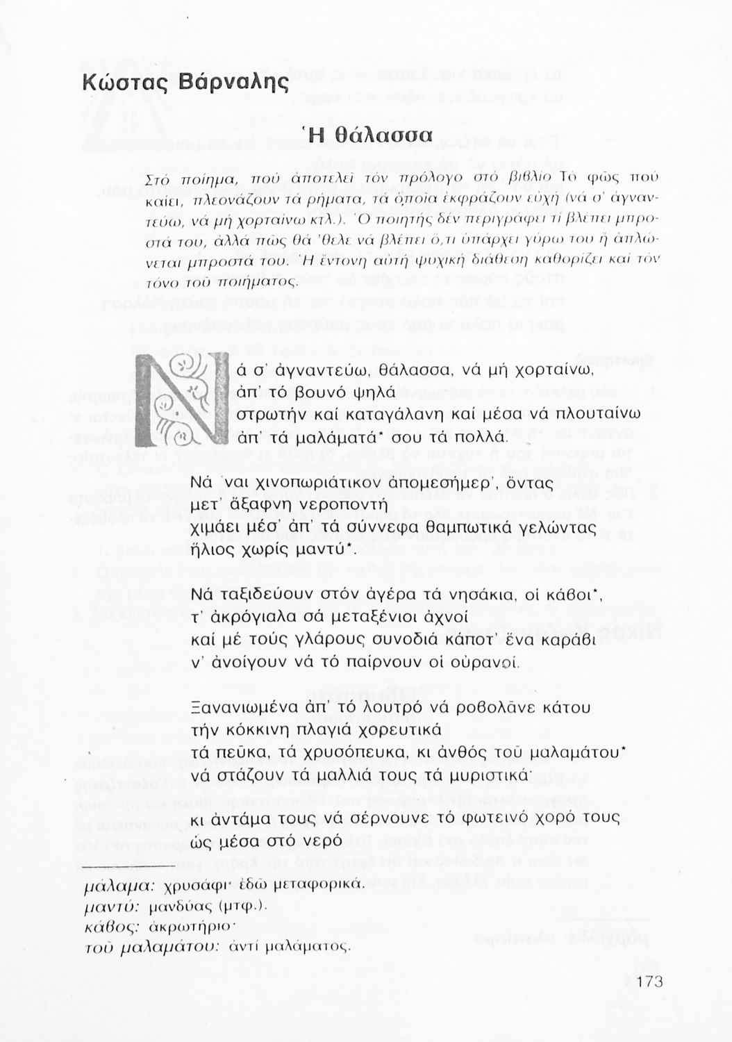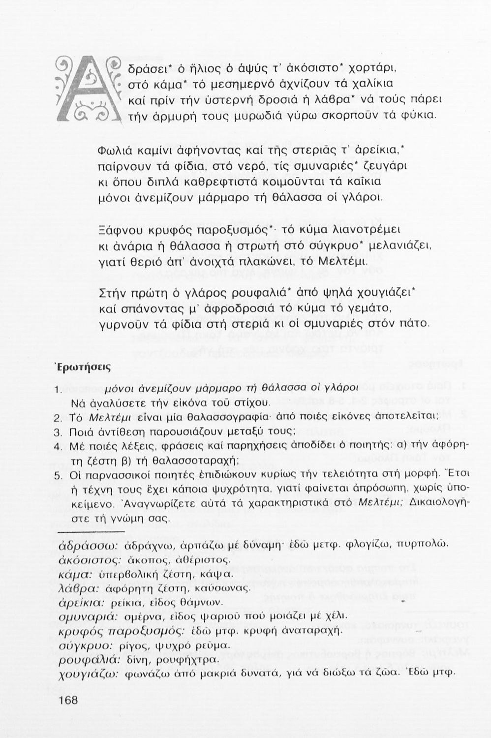Σχολικό εγχειρίδιο Νέων Ελληνικών Γ΄ Γυμνασίου που περιλαμβάνει δημοτικά τραγούδια, και χαρακτηριστικά δείγματα της κρητικής λογοτεχνίας, της επτανησιακής και ρομαντικής σχολής, της Νέας Αθηναϊκής Σχολής και της νεότερης και μεταπολεμικής λογοτεχνίας. Περιέχει και έργα σύγχρονων ξένων συγγραφέων, βιογραφικά και εισαγωγικά σημειώματα.