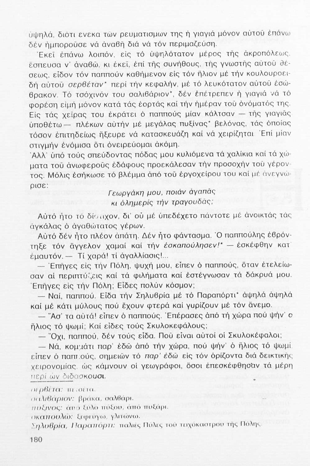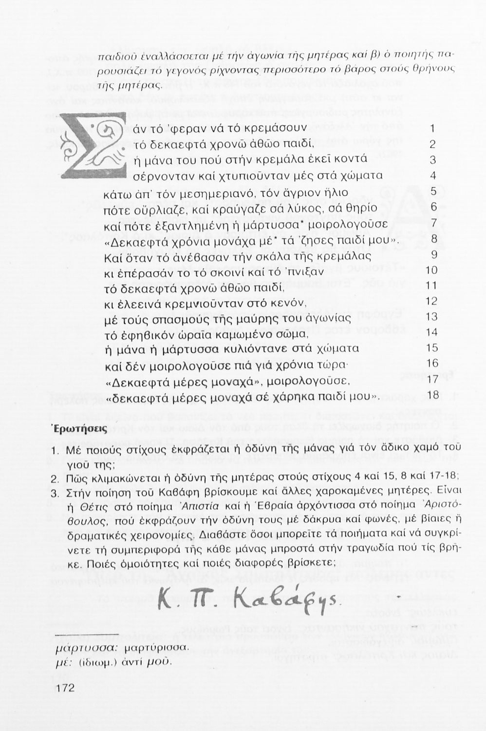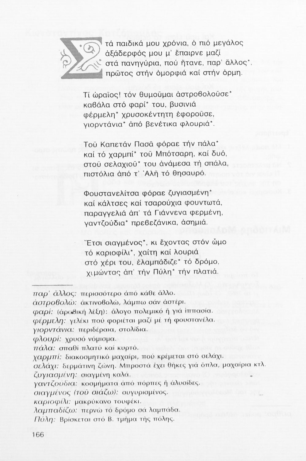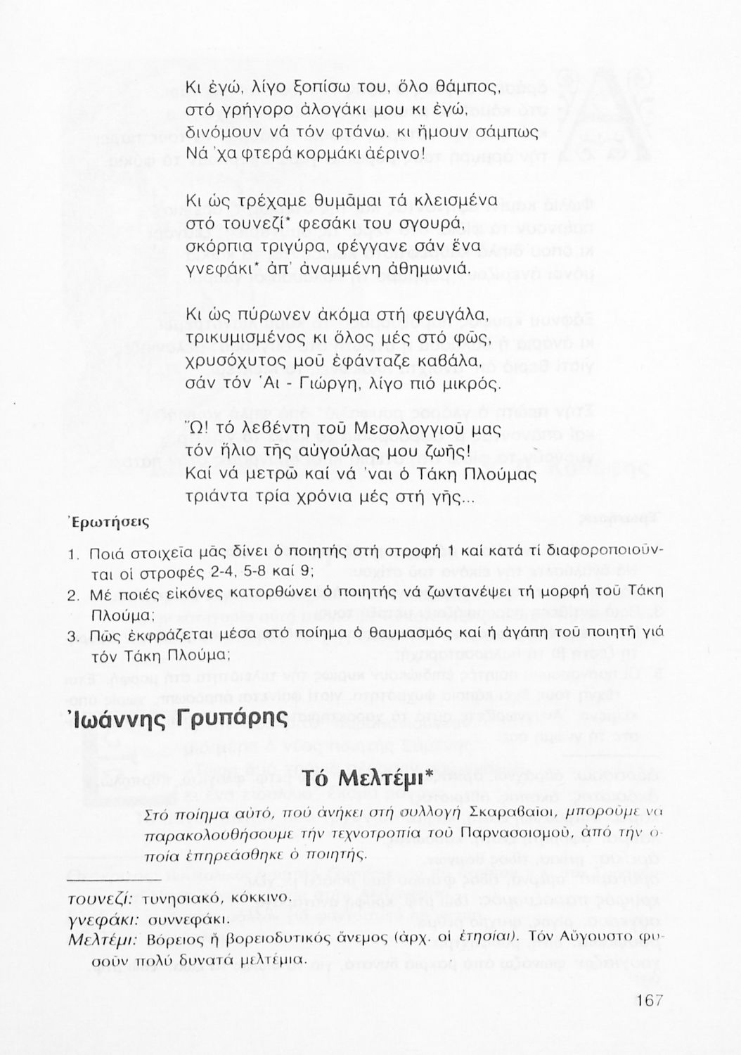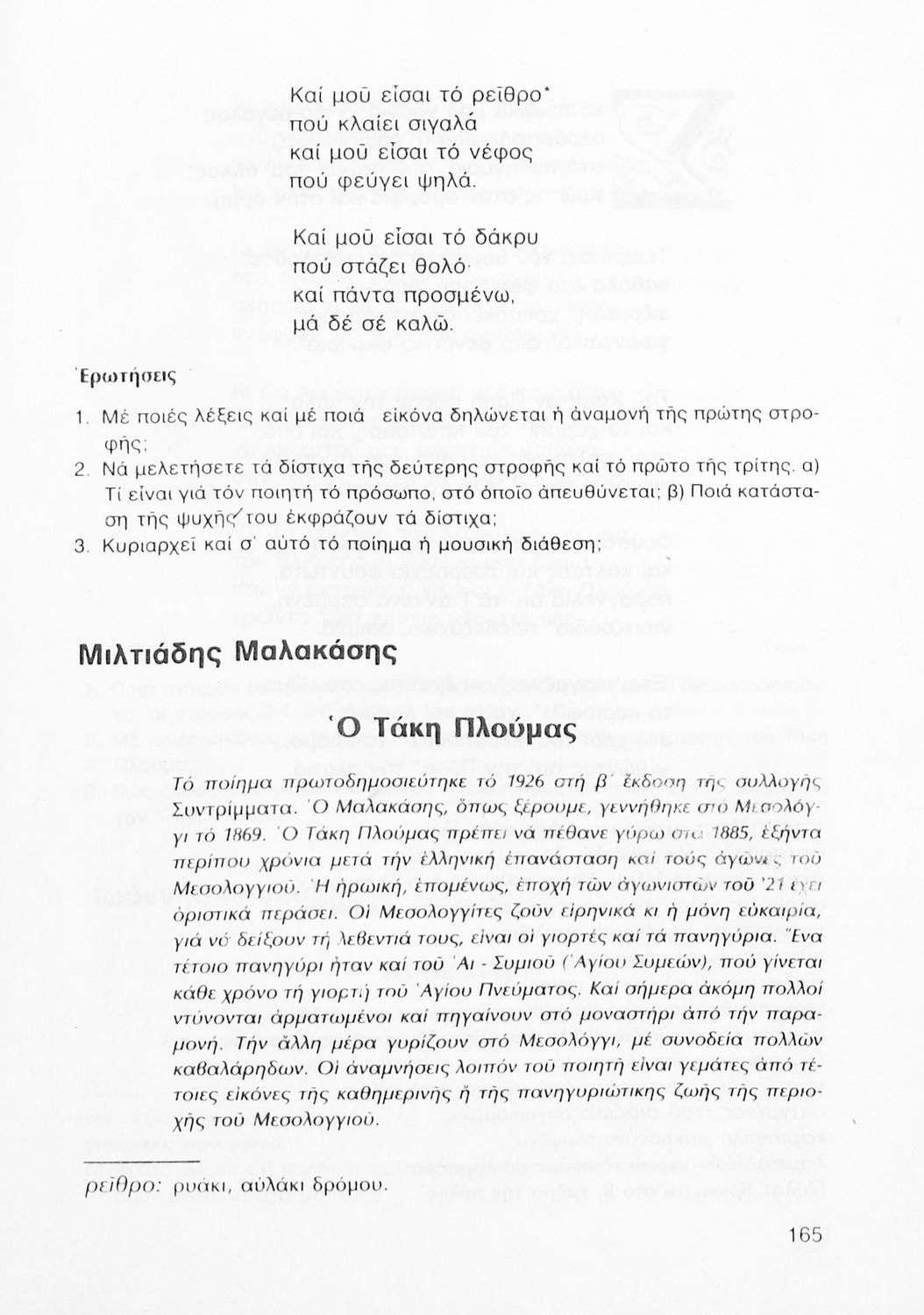 Σχολικό εγχειρίδιο Νέων Ελληνικών Γ΄ Γυμνασίου που περιλαμβάνει δημοτικά τραγούδια, και χαρακτηριστικά δείγματα της κρητικής λογοτεχνίας, της επτανησιακής και ρομαντικής σχολής, της Νέας Αθηναϊκής Σχολής και της νεότερης και μεταπολεμικής λογοτεχνίας. Περιέχει και έργα σύγχρονων ξένων συγγραφέων, βιογραφικά και εισαγωγικά σημειώματα.