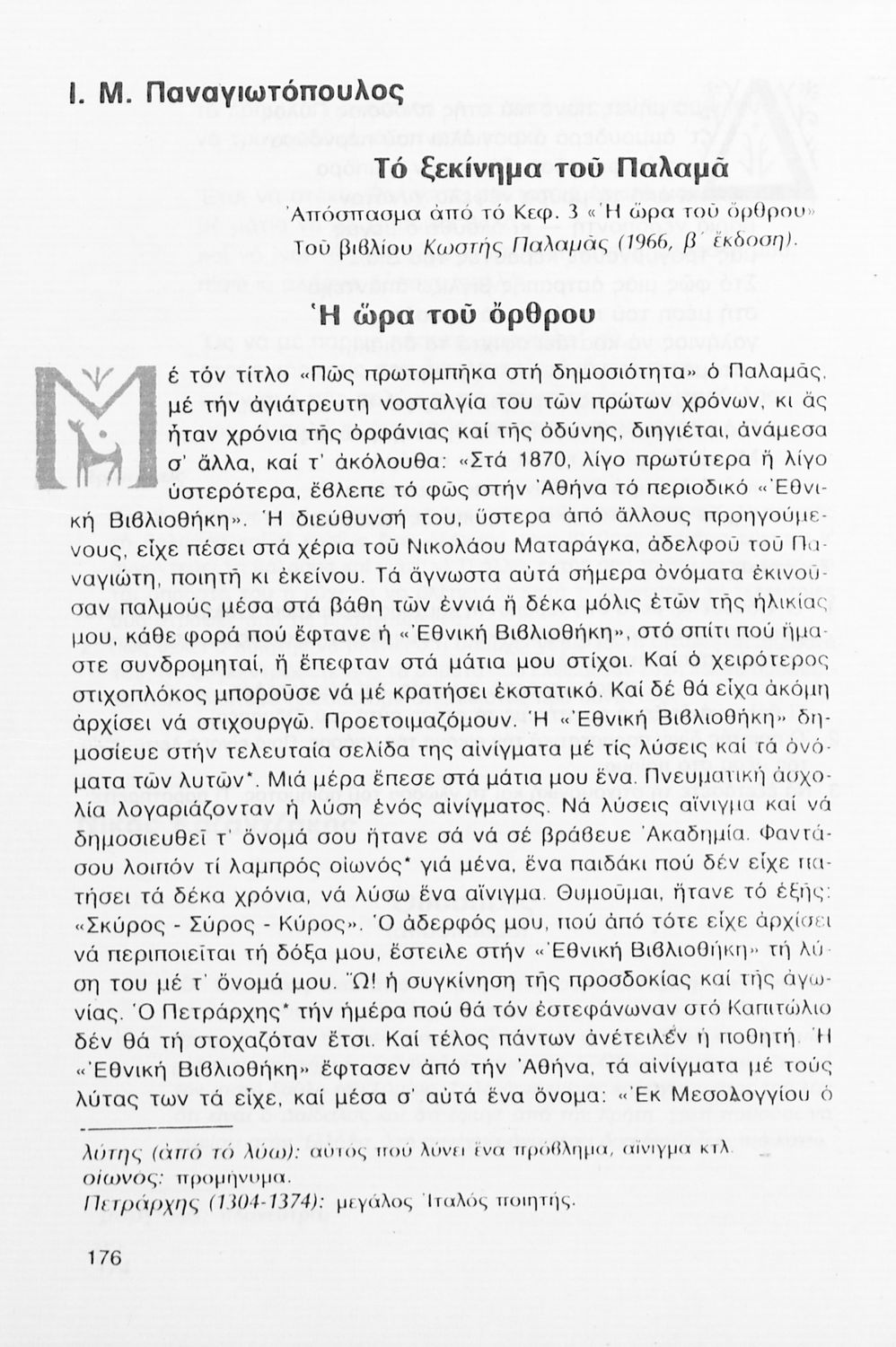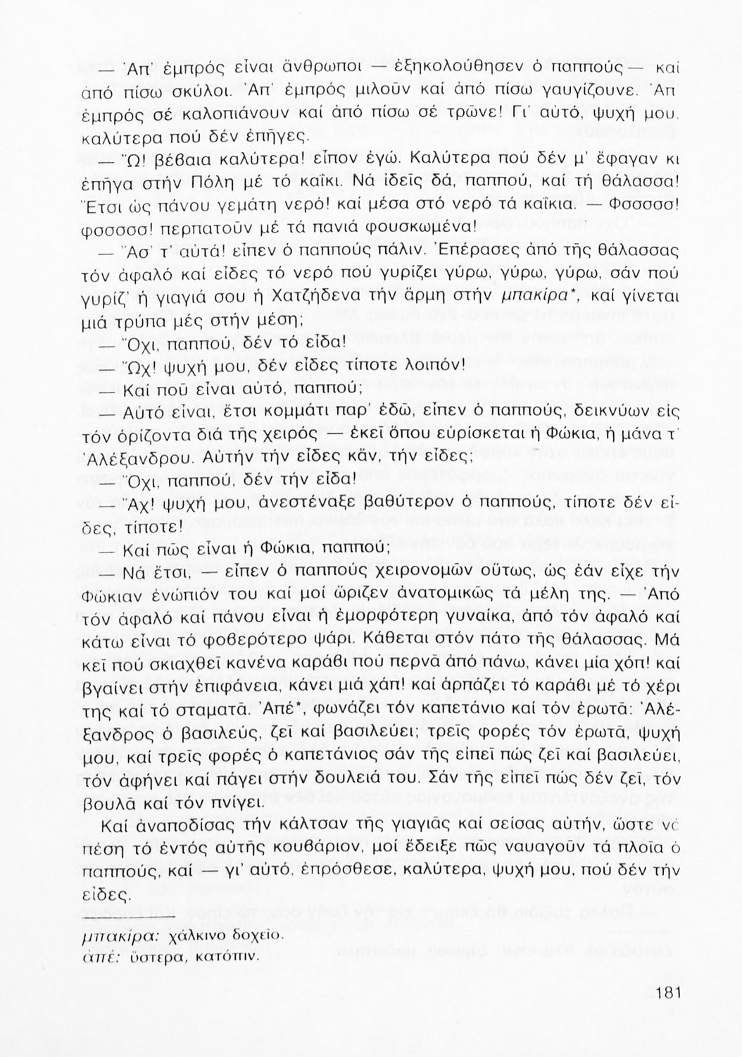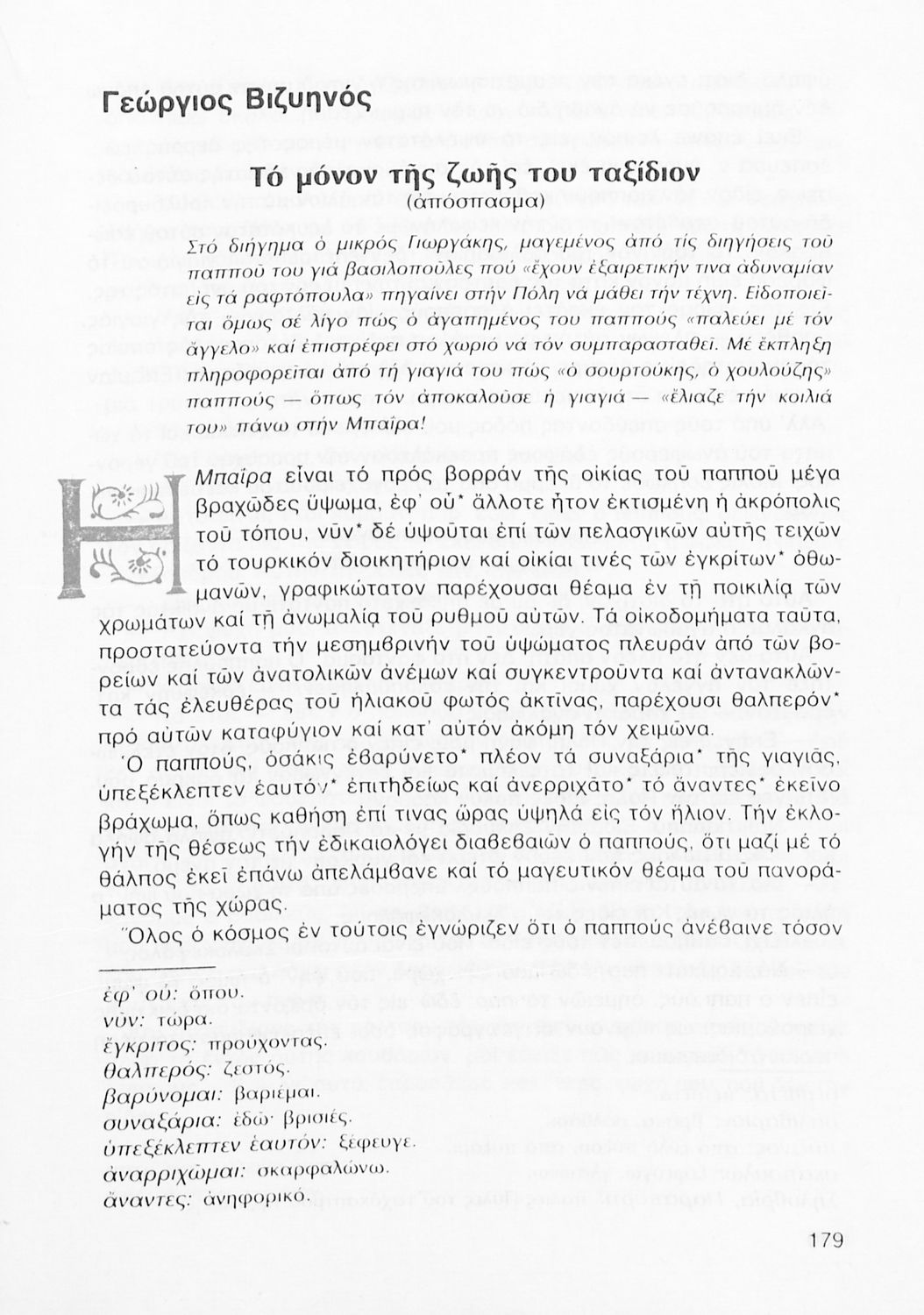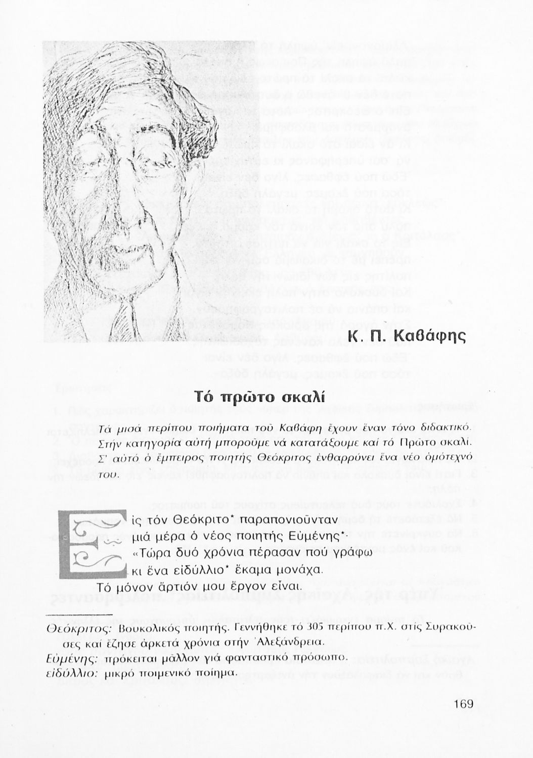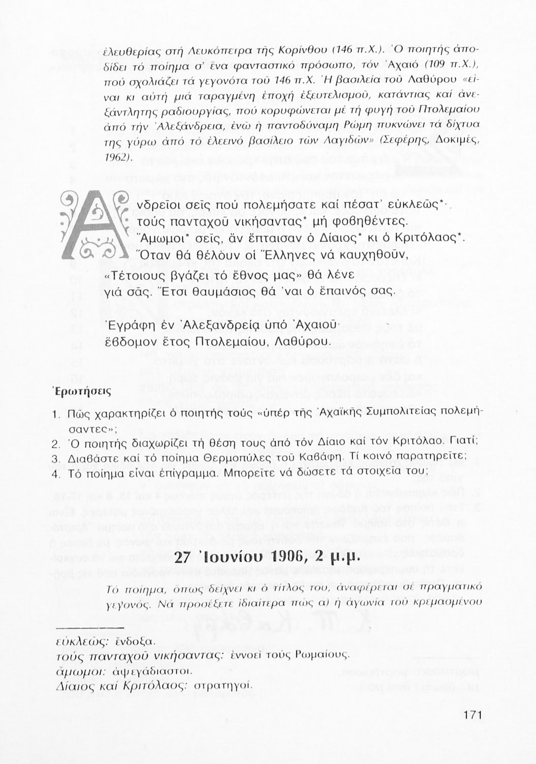 Σχολικό εγχειρίδιο Νέων Ελληνικών Γ΄ Γυμνασίου που περιλαμβάνει δημοτικά τραγούδια, και χαρακτηριστικά δείγματα της κρητικής λογοτεχνίας, της επτανησιακής και ρομαντικής σχολής, της Νέας Αθηναϊκής Σχολής και της νεότερης και μεταπολεμικής λογοτεχνίας. Περιέχει και έργα σύγχρονων ξένων συγγραφέων, βιογραφικά και εισαγωγικά σημειώματα.