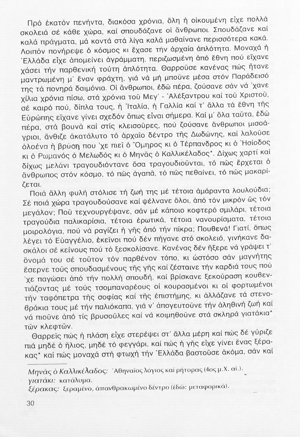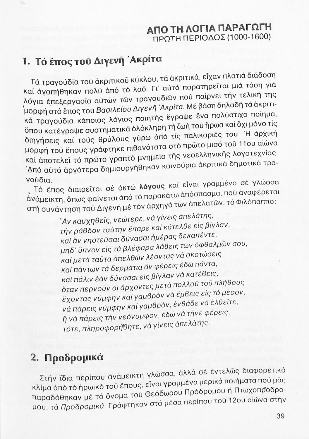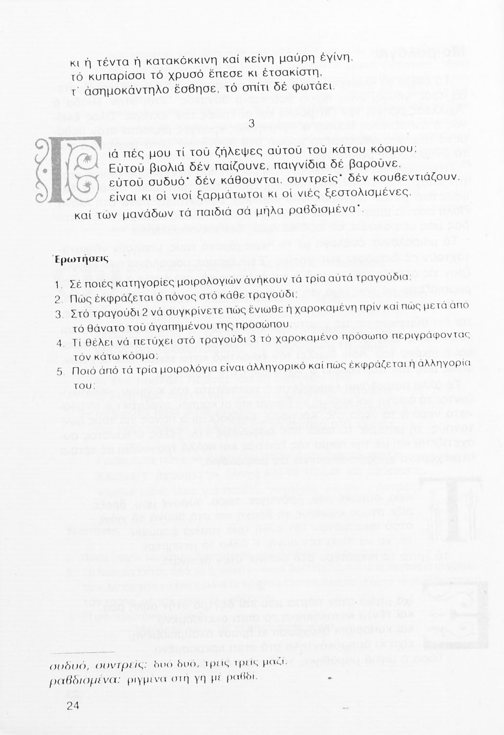 Σχολικό εγχειρίδιο Νέων Ελληνικών Γ΄ Γυμνασίου που περιλαμβάνει δημοτικά τραγούδια, και χαρακτηριστικά δείγματα της κρητικής λογοτεχνίας, της επτανησιακής και ρομαντικής σχολής, της Νέας Αθηναϊκής Σχολής και της νεότερης και μεταπολεμικής λογοτεχνίας. Περιέχει και έργα σύγχρονων ξένων συγγραφέων, βιογραφικά και εισαγωγικά σημειώματα.