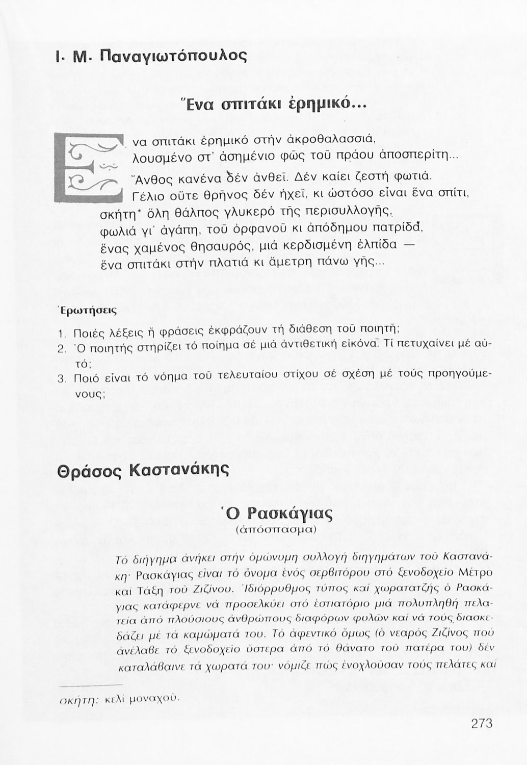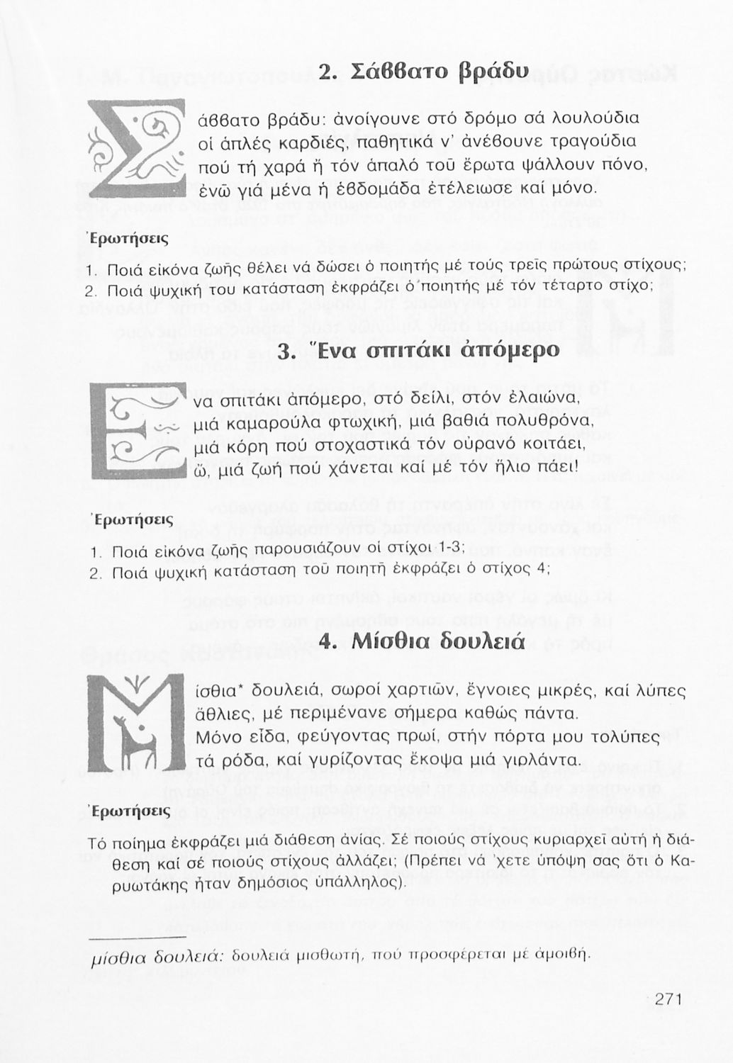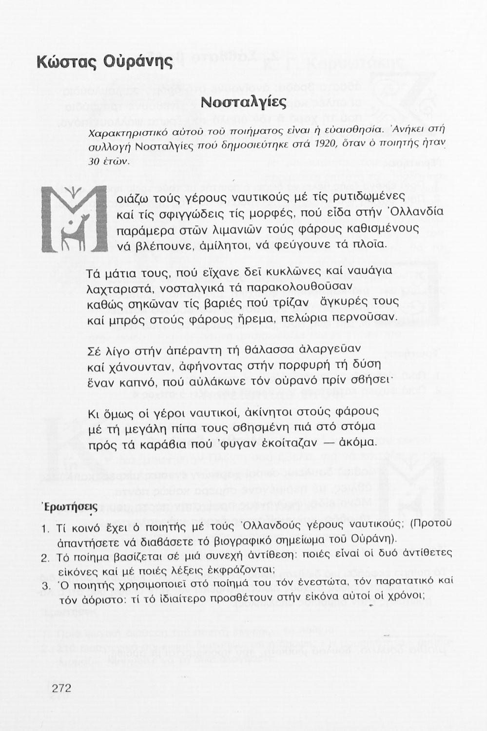 Σχολικό εγχειρίδιο Νέων Ελληνικών Γ΄ Γυμνασίου που περιλαμβάνει δημοτικά τραγούδια, και χαρακτηριστικά δείγματα της κρητικής λογοτεχνίας, της επτανησιακής και ρομαντικής σχολής, της Νέας Αθηναϊκής Σχολής και της νεότερης και μεταπολεμικής λογοτεχνίας. Περιέχει και έργα σύγχρονων ξένων συγγραφέων, βιογραφικά και εισαγωγικά σημειώματα.