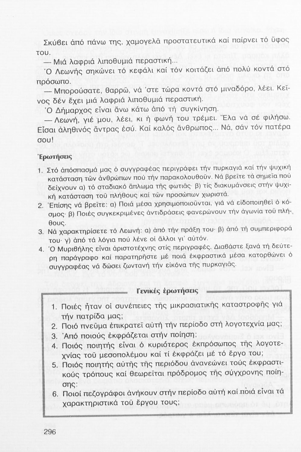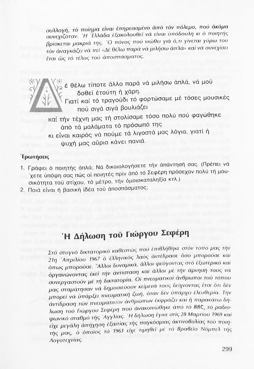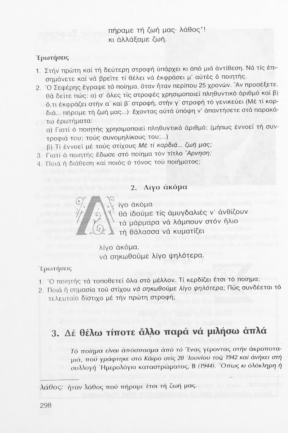 Σχολικό εγχειρίδιο Νέων Ελληνικών Γ΄ Γυμνασίου που περιλαμβάνει δημοτικά τραγούδια, και χαρακτηριστικά δείγματα της κρητικής λογοτεχνίας, της επτανησιακής και ρομαντικής σχολής, της Νέας Αθηναϊκής Σχολής και της νεότερης και μεταπολεμικής λογοτεχνίας. Περιέχει και έργα σύγχρονων ξένων συγγραφέων, βιογραφικά και εισαγωγικά σημειώματα.