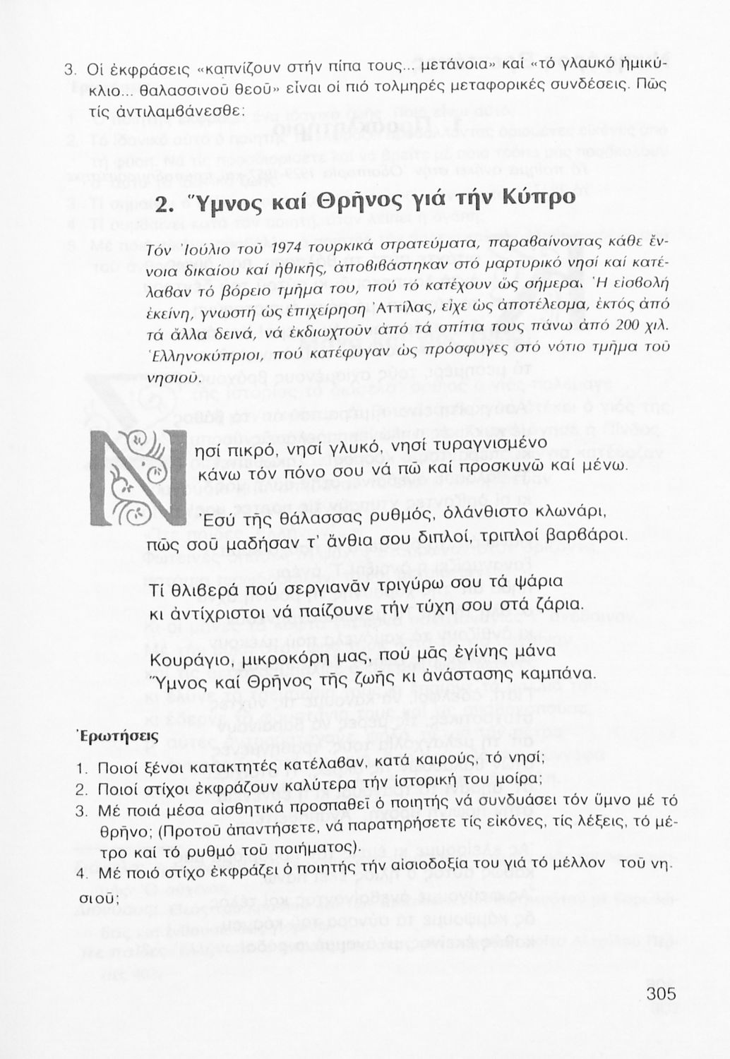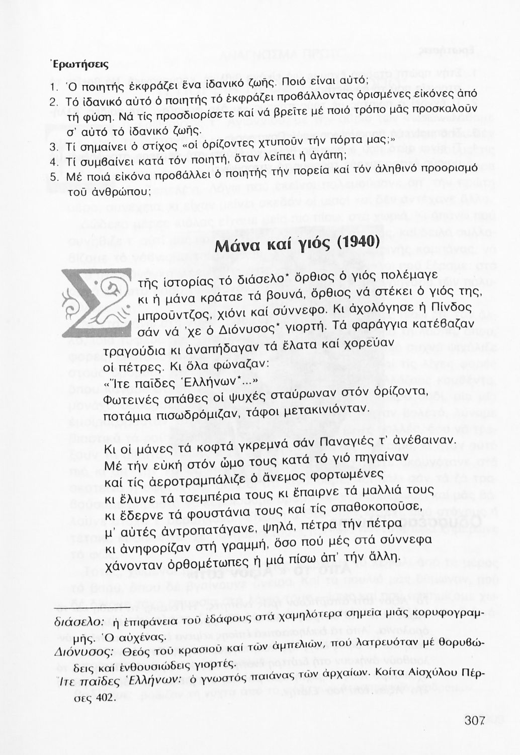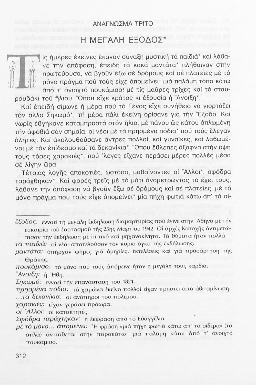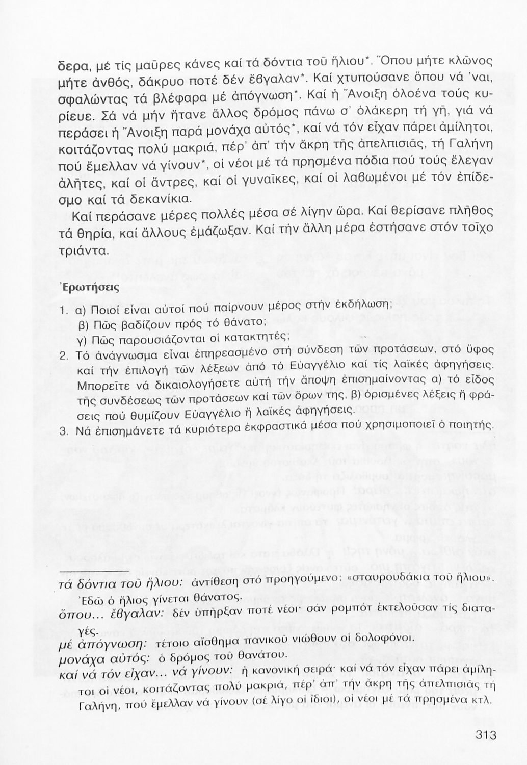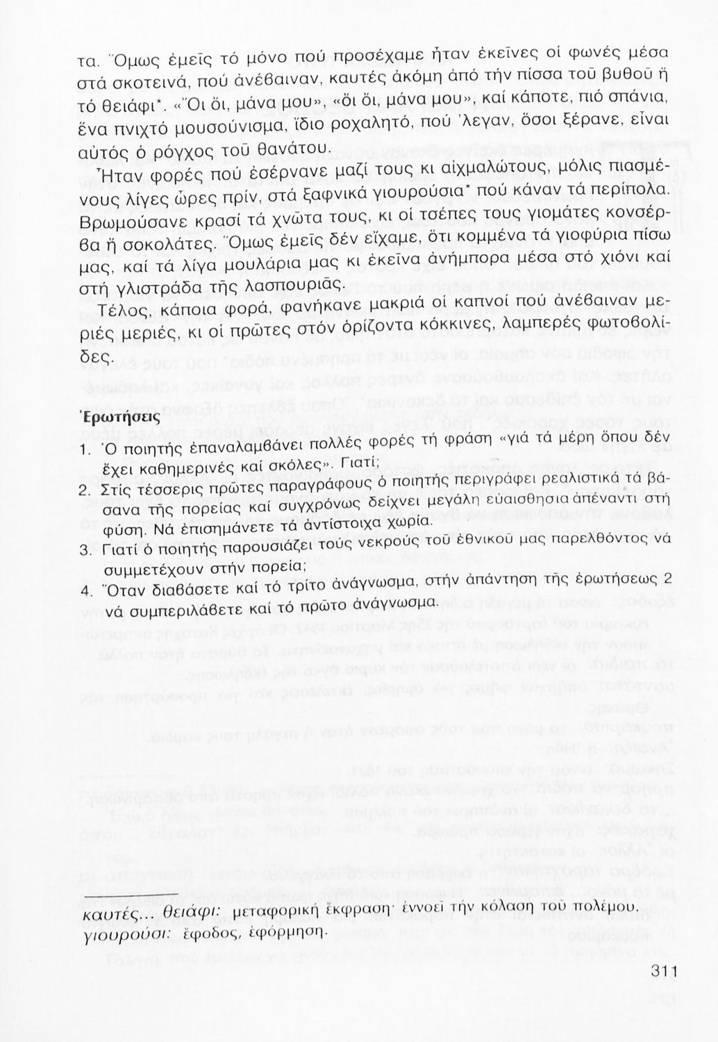 Σχολικό εγχειρίδιο Νέων Ελληνικών Γ΄ Γυμνασίου που περιλαμβάνει δημοτικά τραγούδια, και χαρακτηριστικά δείγματα της κρητικής λογοτεχνίας, της επτανησιακής και ρομαντικής σχολής, της Νέας Αθηναϊκής Σχολής και της νεότερης και μεταπολεμικής λογοτεχνίας. Περιέχει και έργα σύγχρονων ξένων συγγραφέων, βιογραφικά και εισαγωγικά σημειώματα.
